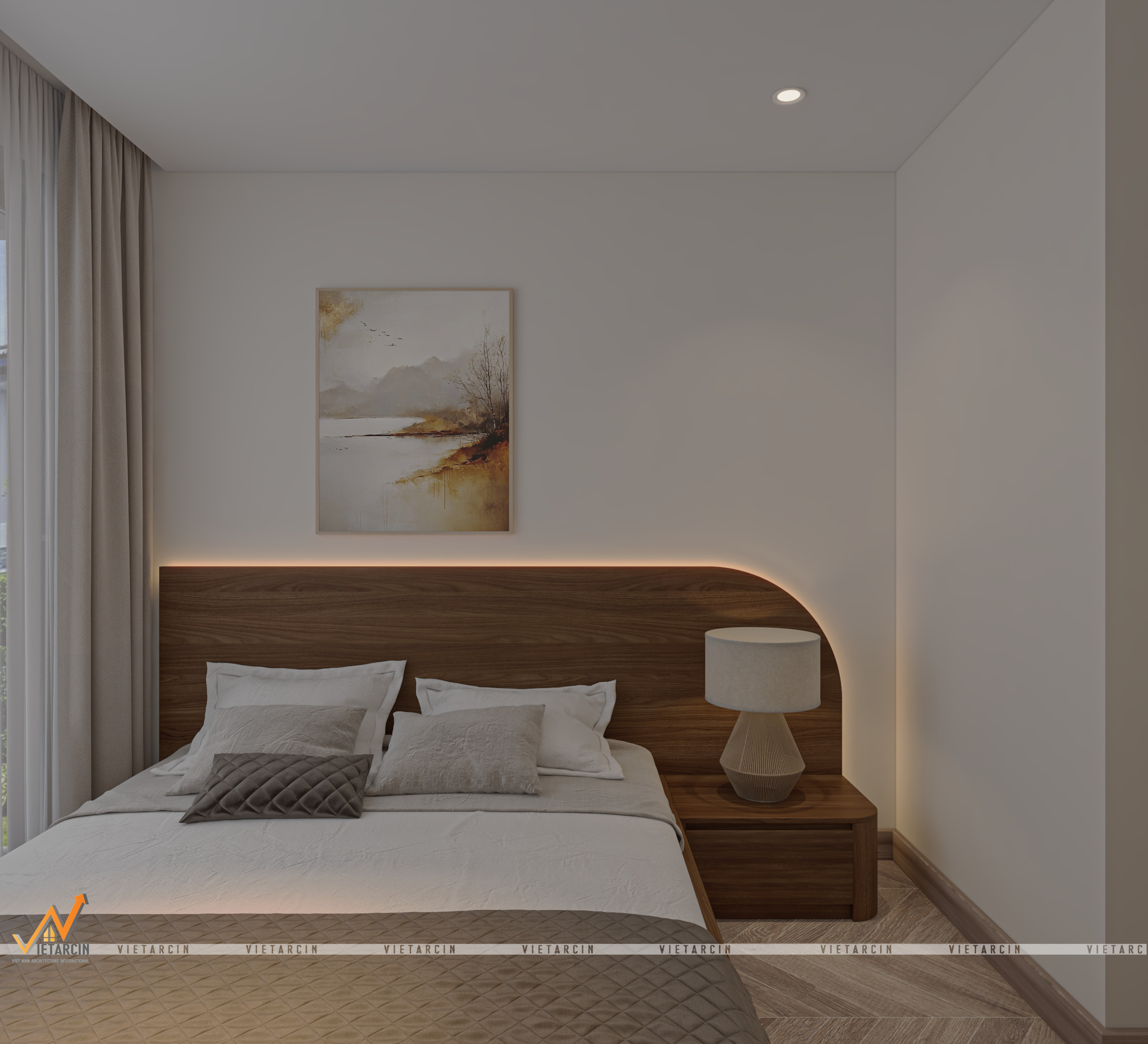 - Giường ngủ: Điểm nhấn của căn phòng nằm ở phần vách ốp đầu giường bằng gỗ với thiết kế uốn lượn bất đối xứng, kết hợp dải đèn LED hắt sáng viền ấm áp. Giải pháp ánh sáng này thay thế hoàn toàn các loại đèn trần chói lóa, mang lại hiệu ứng thư giãn tuyệt đối cho thị giác, giúp gia chủ dễ dàng đi vào giấc ngủ.