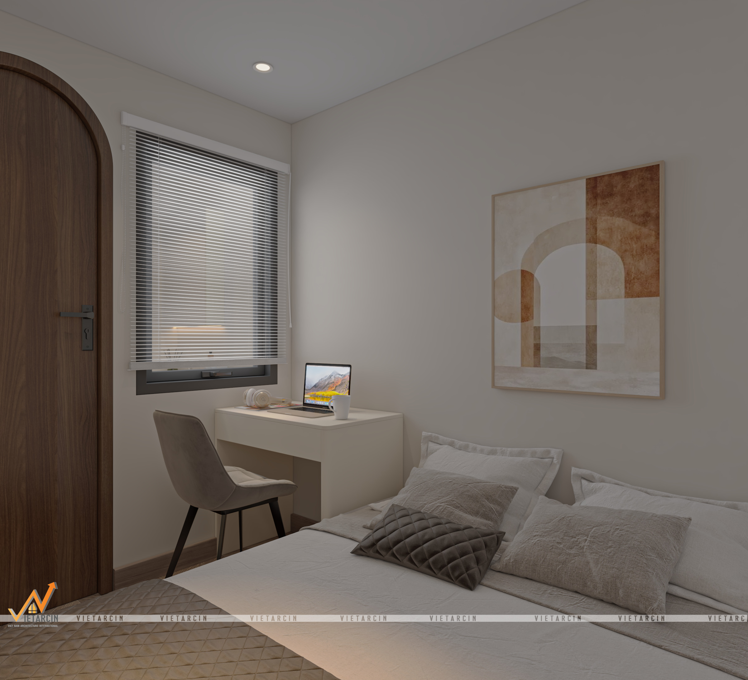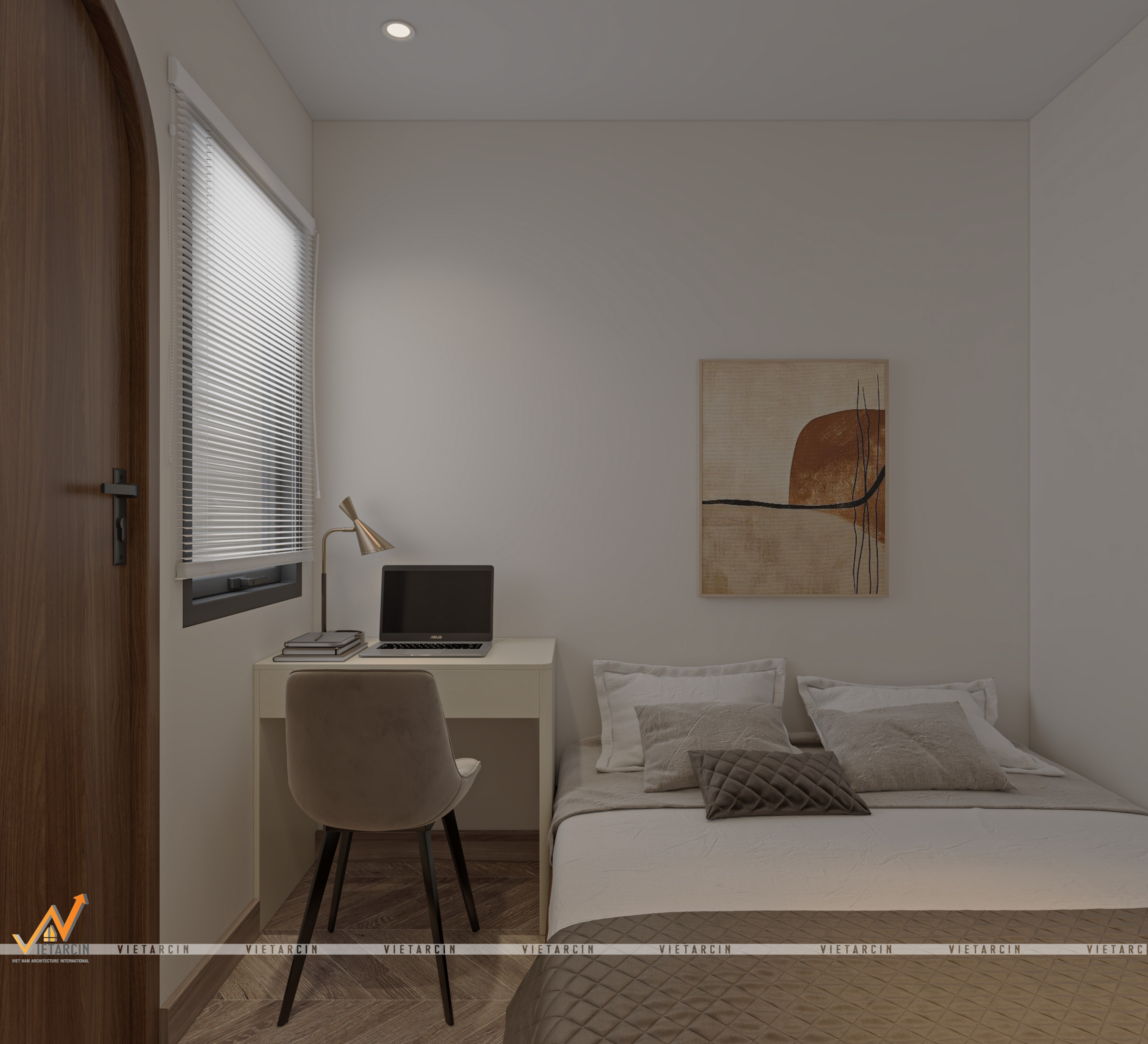 Theo yêu cầu của chị Chi, Lầu 1 được bố trí 2 phòng ngủ với diện tích vừa phải. Để tạo ra sự đồng bộ và kiểm soát tốt ngân sách 200 – 300 triệu đồng cho phần nội thất, Vaidecor áp dụng một thiết kế chung cho cả hai phòng, tập trung vào sự tối giản và tiện nghi.