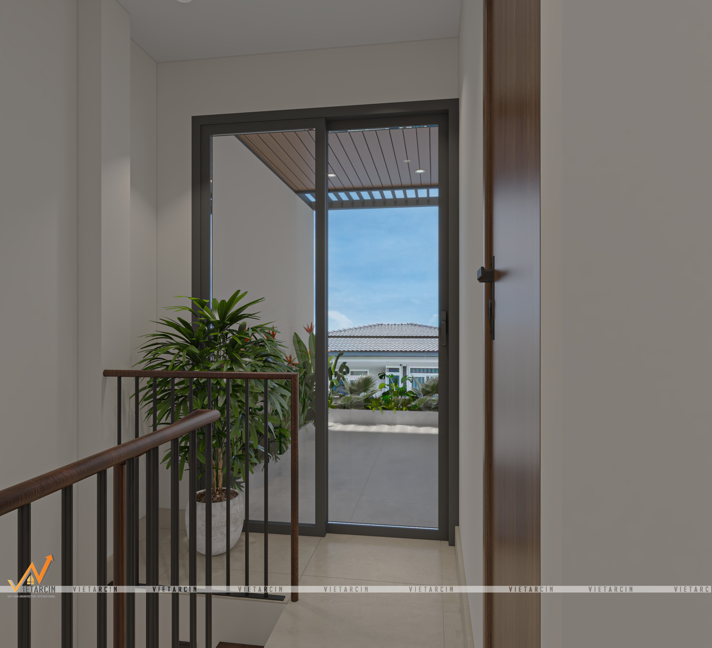 - Hệ cửa lùa kính cường lực: Thay vì xây tường gạch bức bí, chúng tôi sử dụng hệ cửa kính lùa bản lớn ngăn cách giữa sảnh trong nhà và sân thượng.
