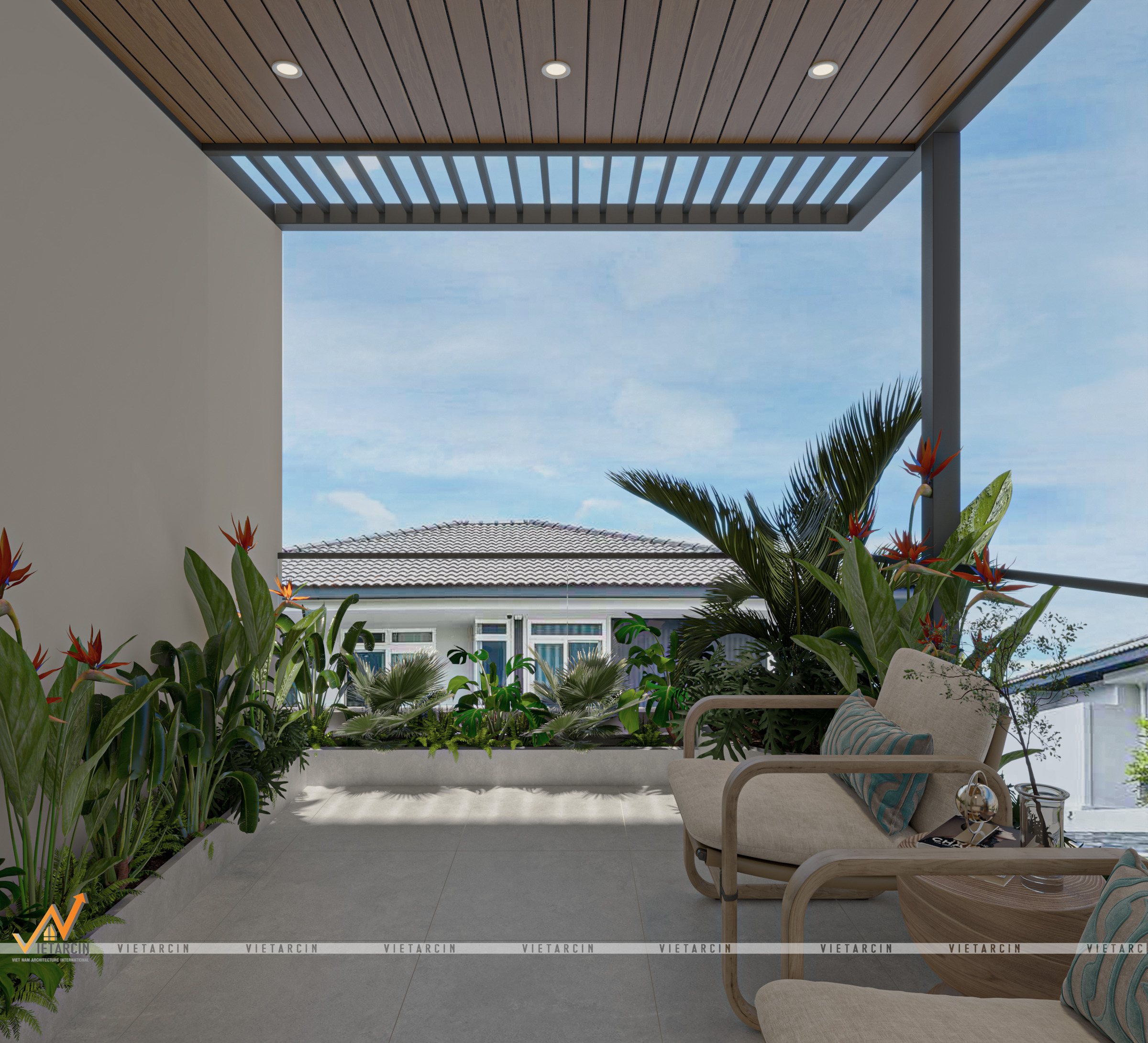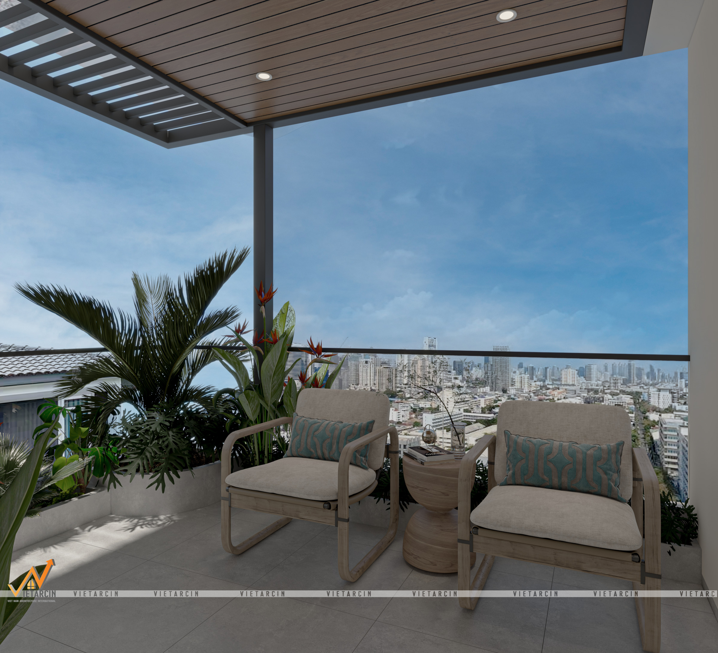 - Không gian xanh nhiệt đới: Những chậu cây mang đậm chất nhiệt đới như Thiên điểu, Trúc mây được bố trí dọc lan can, kết hợp cùng hai chiếc ghế lounge bọc nệm họa tiết bắt mắt và chiếc bàn trà gỗ nhỏ.