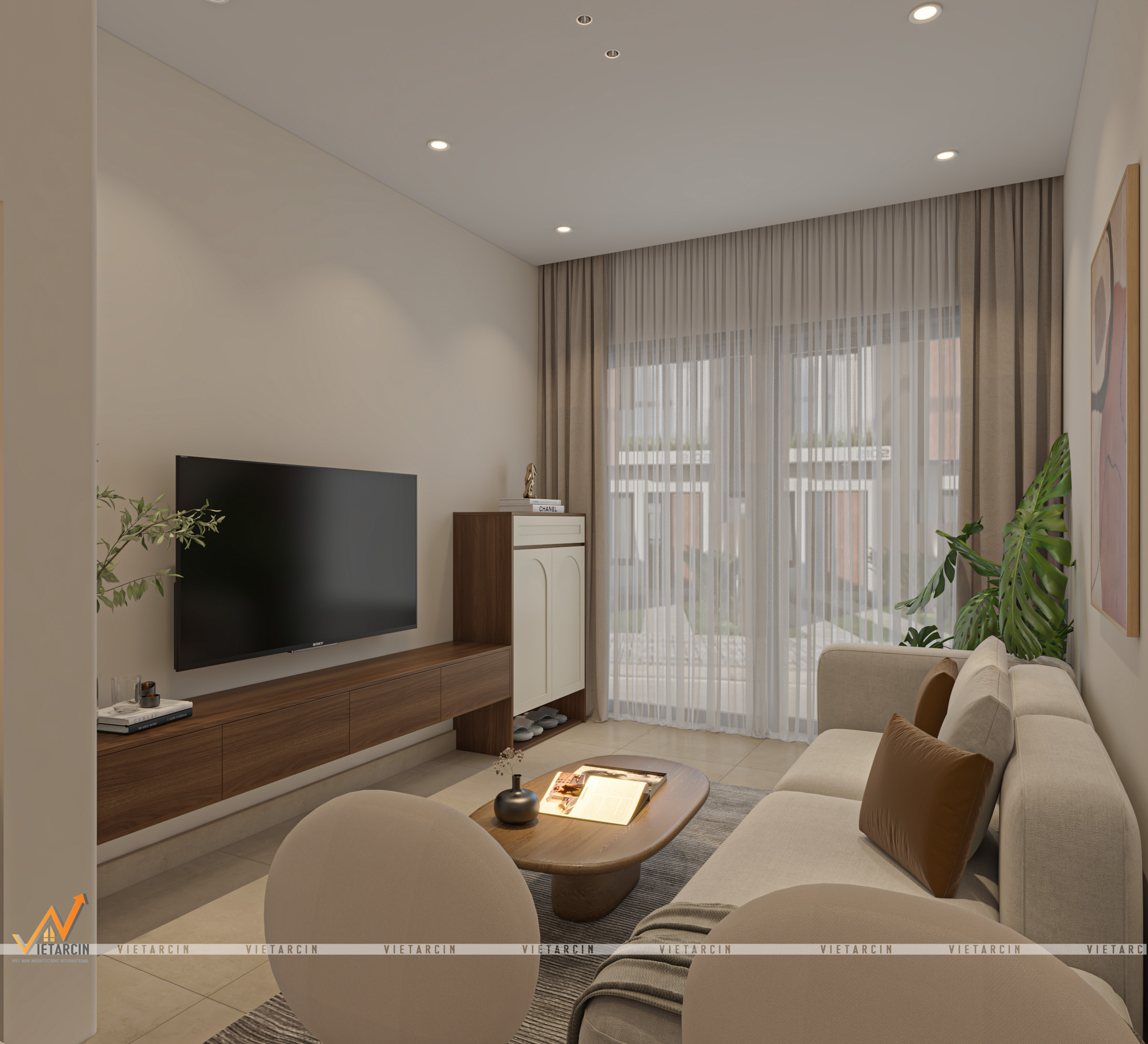 - Nội thất tinh giản, bo góc mềm mại: Bộ sofa màu be với thiết kế module bệt, kết hợp cùng bàn trà gỗ nguyên khối tạo cảm giác vững chãi nhưng không nặng nề. Đặc biệt, hệ tủ TV được tích hợp khéo léo với tủ giày sát tường, sử dụng ngôn ngữ thiết kế vòm cong trên cánh tủ.