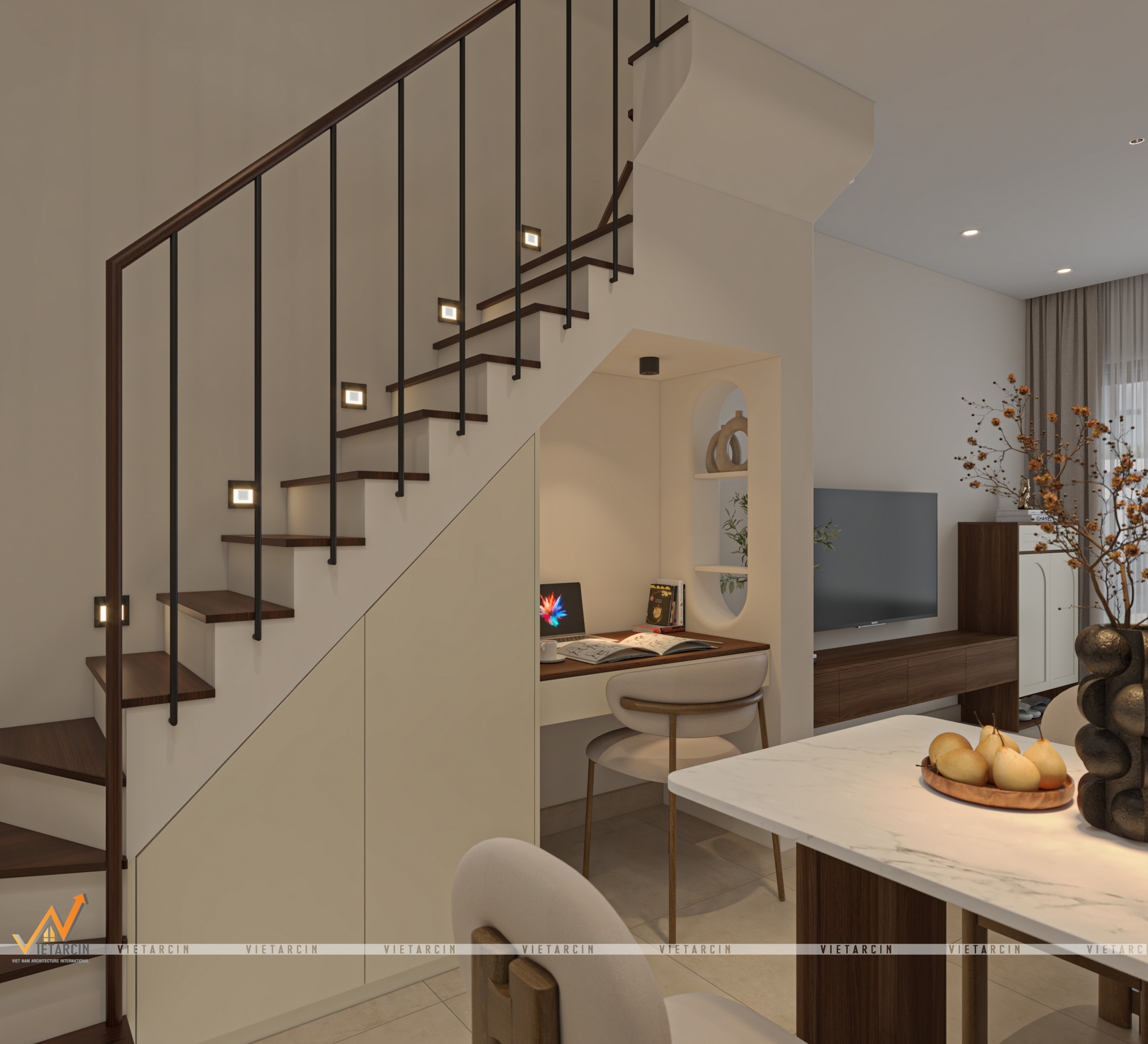 - Tích hợp không gian “Home Office” dưới gầm thang: Thay vì để trống hoặc làm kho chứa đồ như thói quen cũ, chúng tôi tận dụng gầm thang để thiết kế một góc làm việc/học tập nhỏ gọn nhưng đầy đủ công năng. Một hệ kệ tủ vòm cong âm tường được bố trí ngay phía trên bàn làm việc để đựng sách và đồ trang trí.