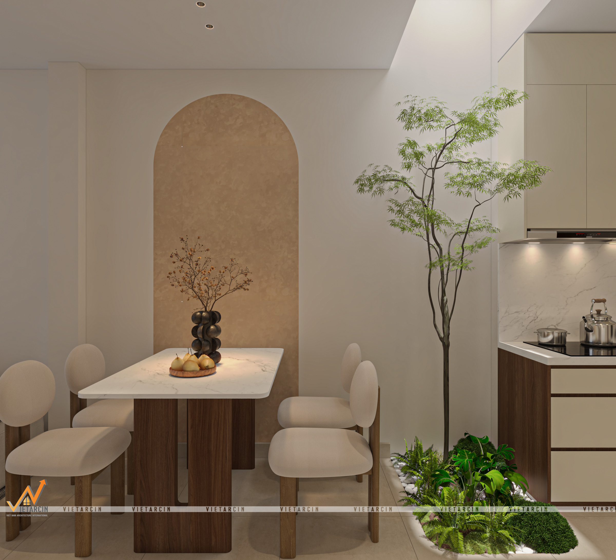 - Không gian mở cho Tầng 1: Đập thông các vách ngăn không cần thiết, phòng khách và bếp – bàn ăn được kết nối liền mạch. Căn bếp sử dụng hệ tủ phẳng (flat-panel) sát trần, giấu nhẹm đi sự bừa bộn. Sự xuất hiện của tiểu cảnh cây xanh cạnh bàn ăn tạo nên một “khoảng thở” đầy chất thơ.