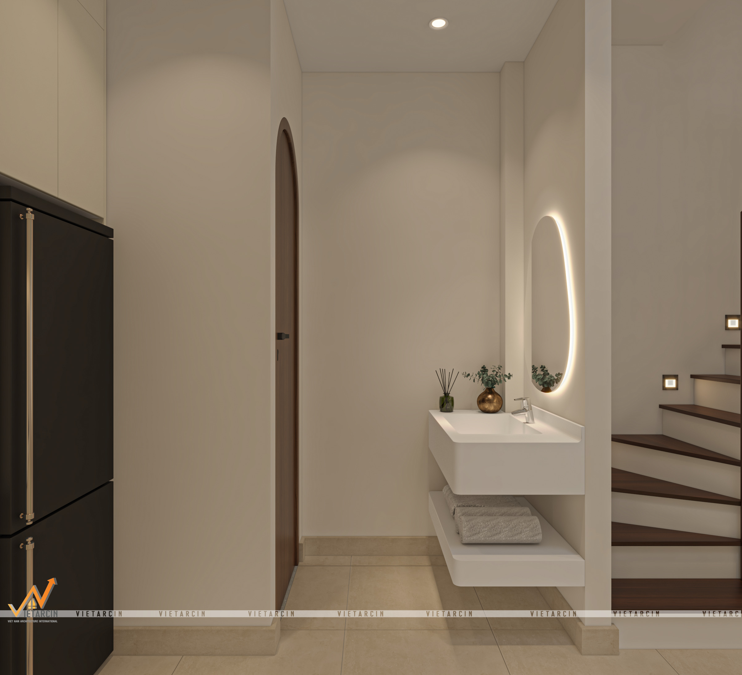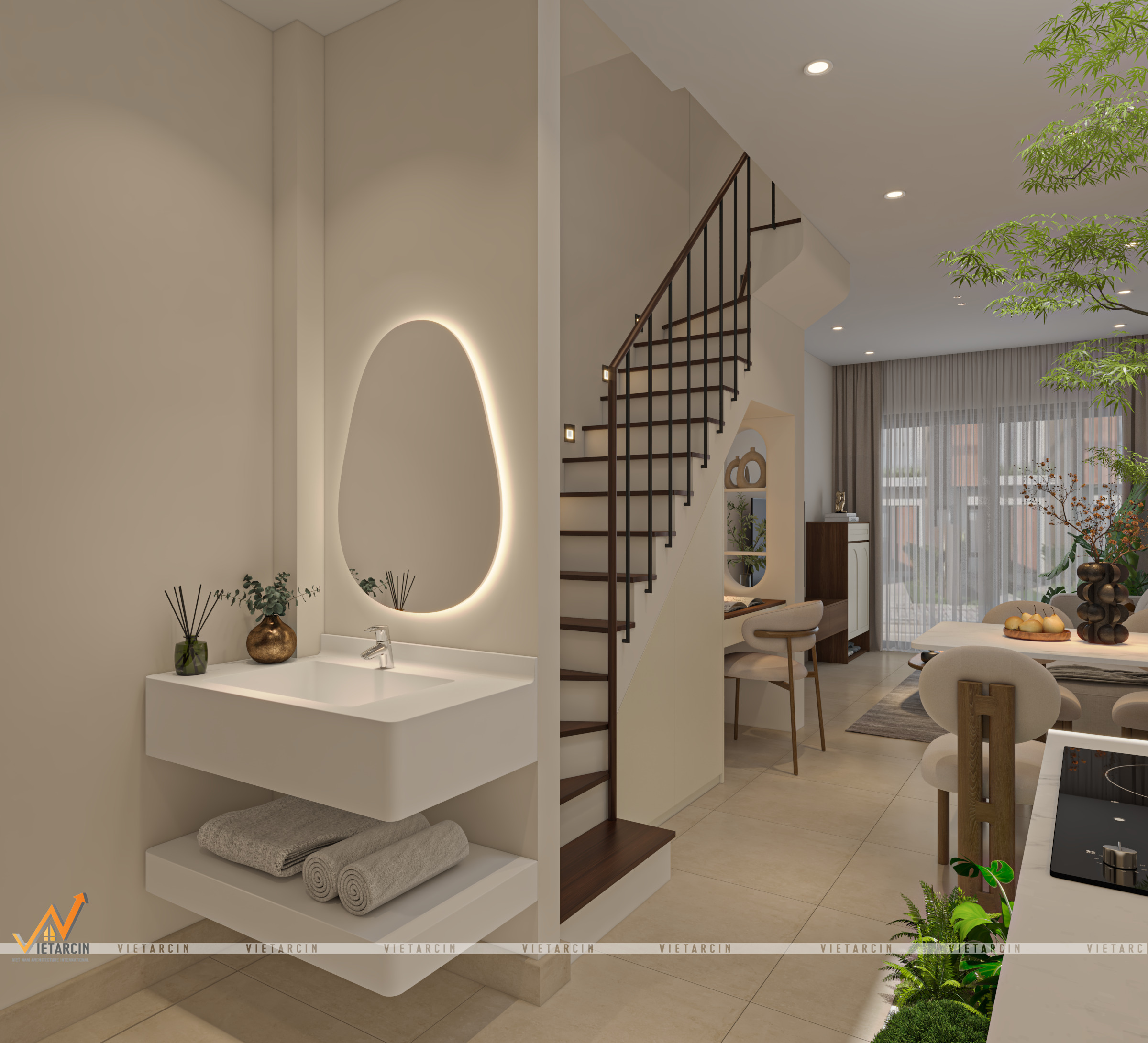 - Đưa Lavabo ra không gian mở: Thay vì gom chung tất cả vào một phòng tắm kín, chúng tôi đẩy bồn rửa tay ra khu vực bên ngoài, nằm gọn gàng phía sau bức vách cầu thang. Chiếc gương treo tường với hình khối hữu cơ kết hợp dải đèn LED hắt sáng biến khu vực này thành một điểm nhấn trang trí nghệ thuật.