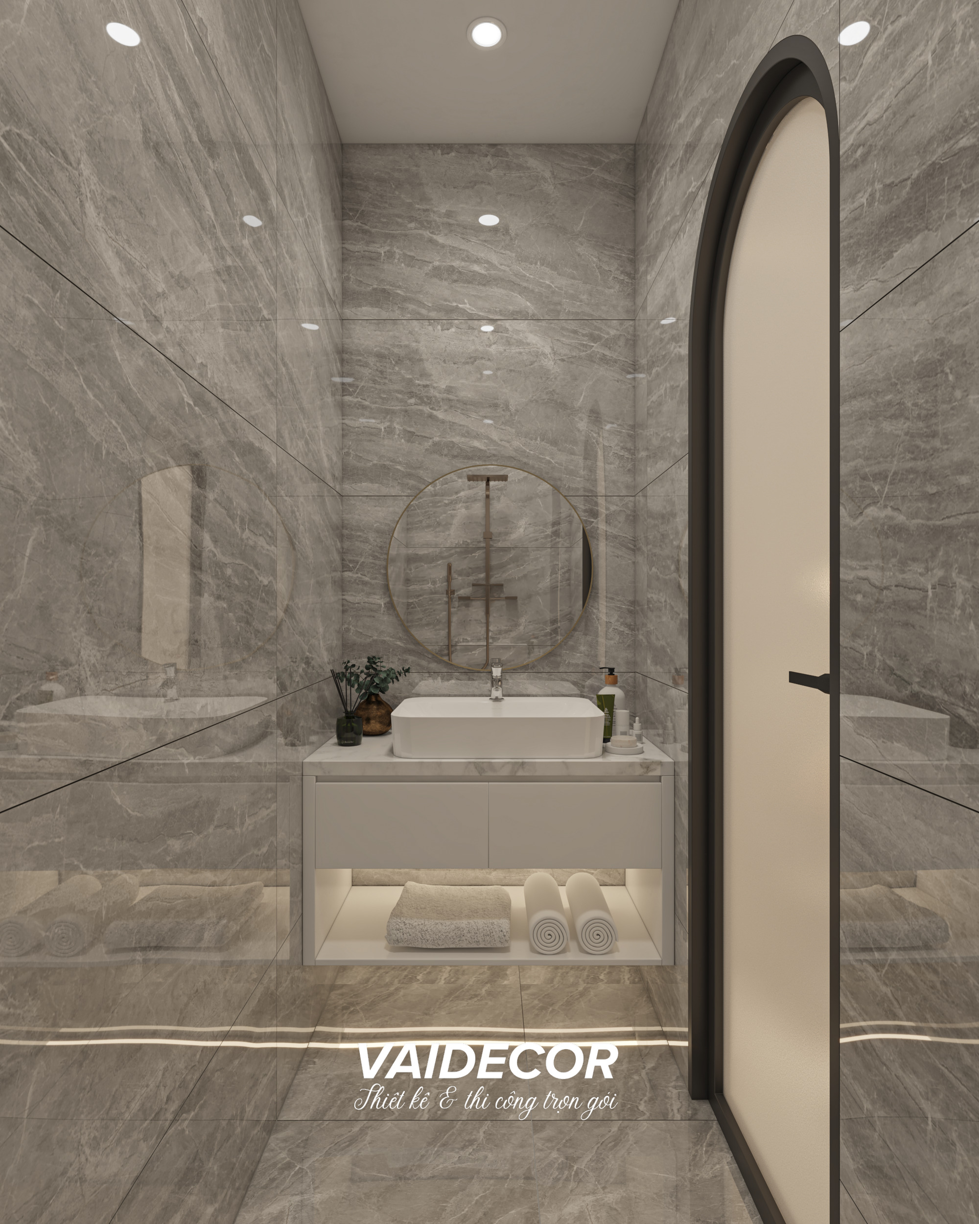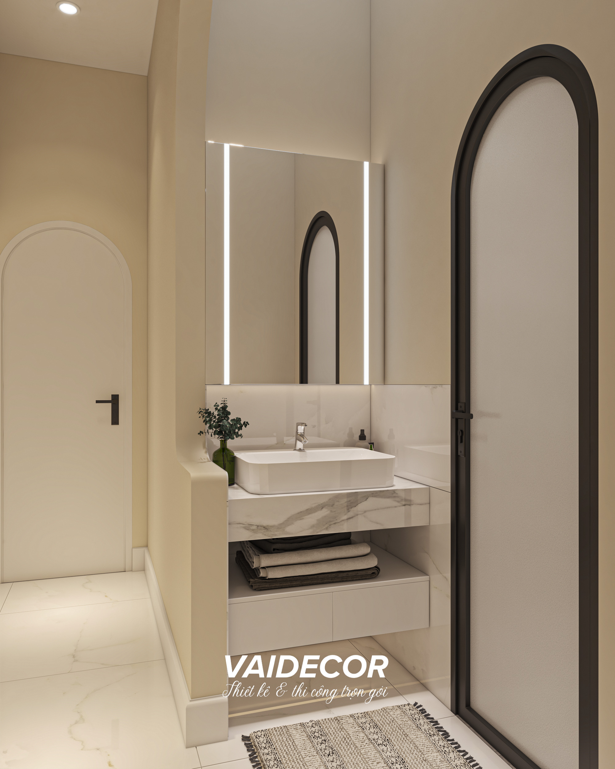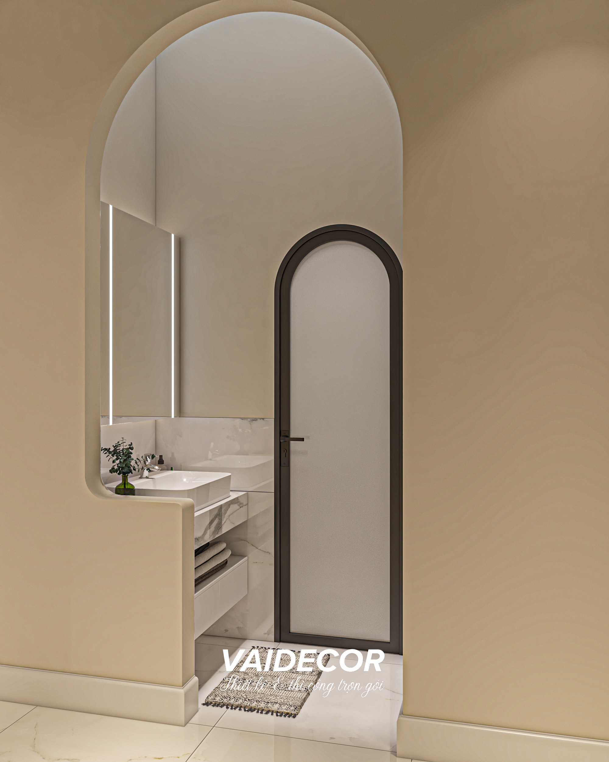 • Tách biệt khu vực khô – ướt sáng tạo: Khác với thiết kế truyền thống gom tất cả vào một phòng, chúng tôi đã “bóc tách” khu vực bồn rửa ra bên ngoài, đặt gọn gàng trong một khoảng lùi vòm cong tinh tế ngay hành lang. Bàn đá Marble kết hợp tủ lavabo treo và gương LED tạo thành một góc nhỏ thanh lịch. Thiết kế tách biệt này cực kỳ hữu dụng vào những giờ cao điểm buổi sáng, khi một người có thể sử dụng nhà tắm bên trong, trong khi người khác vẫn có thể đánh răng, rửa mặt ở bên ngoài mà không phải chờ đợi.