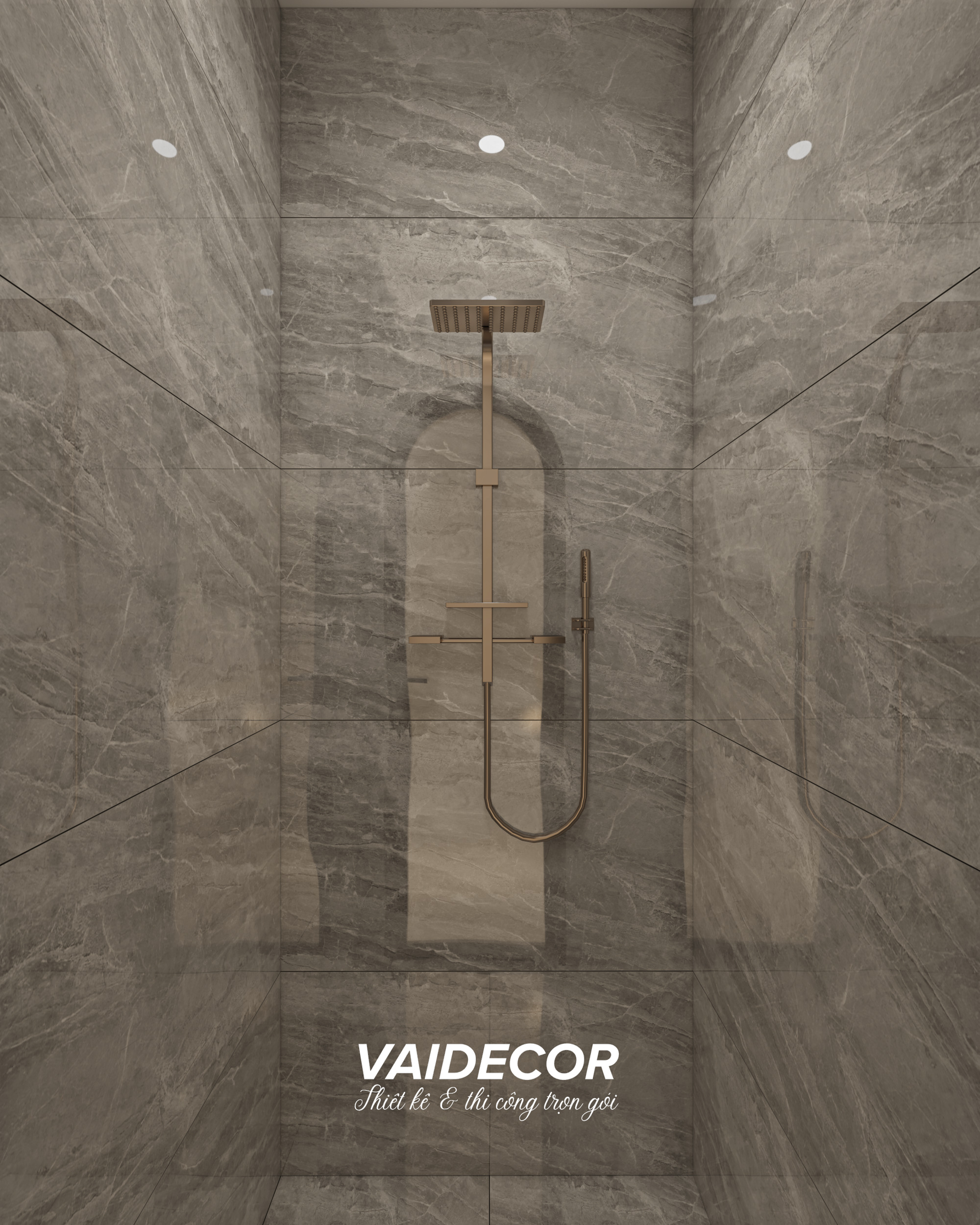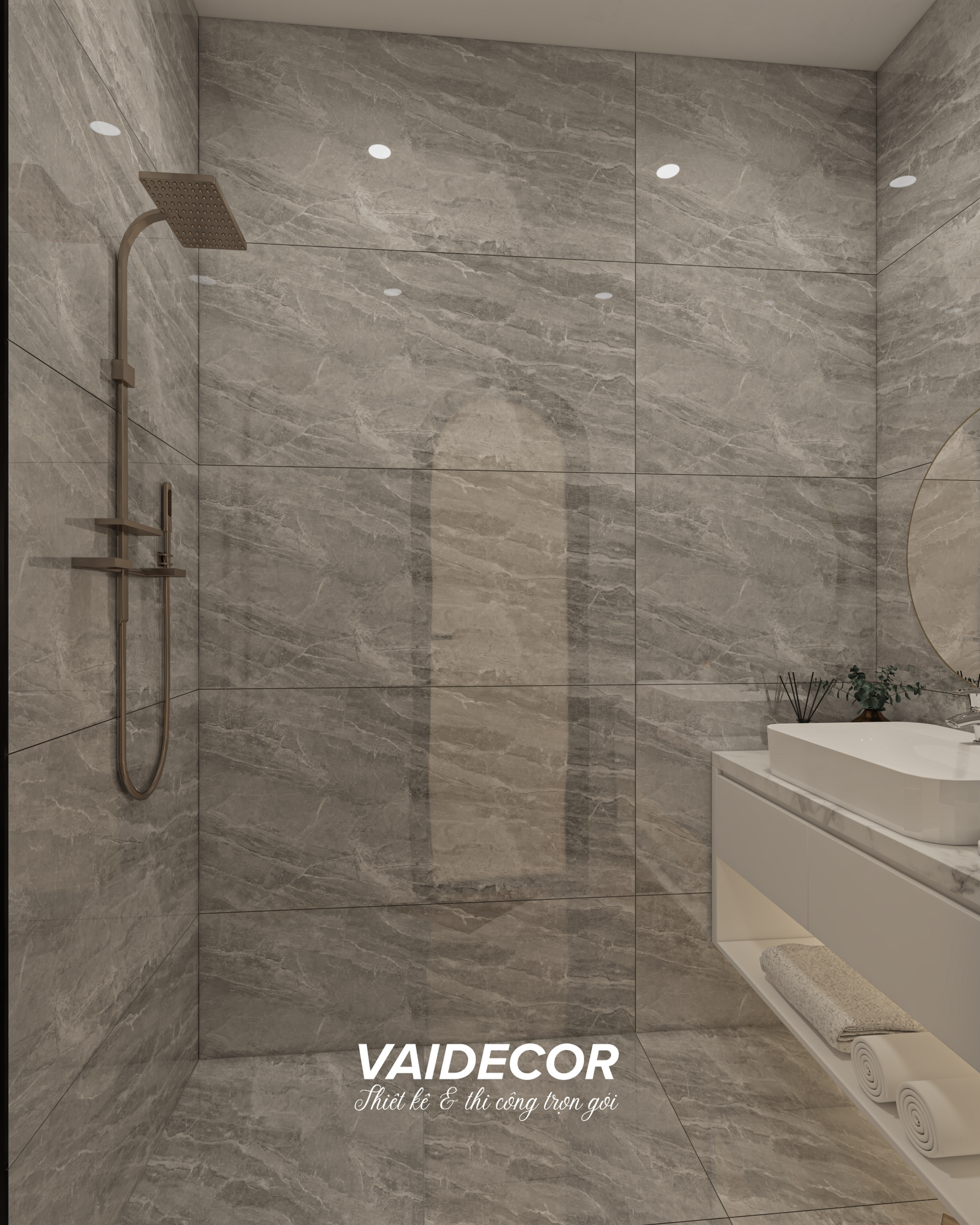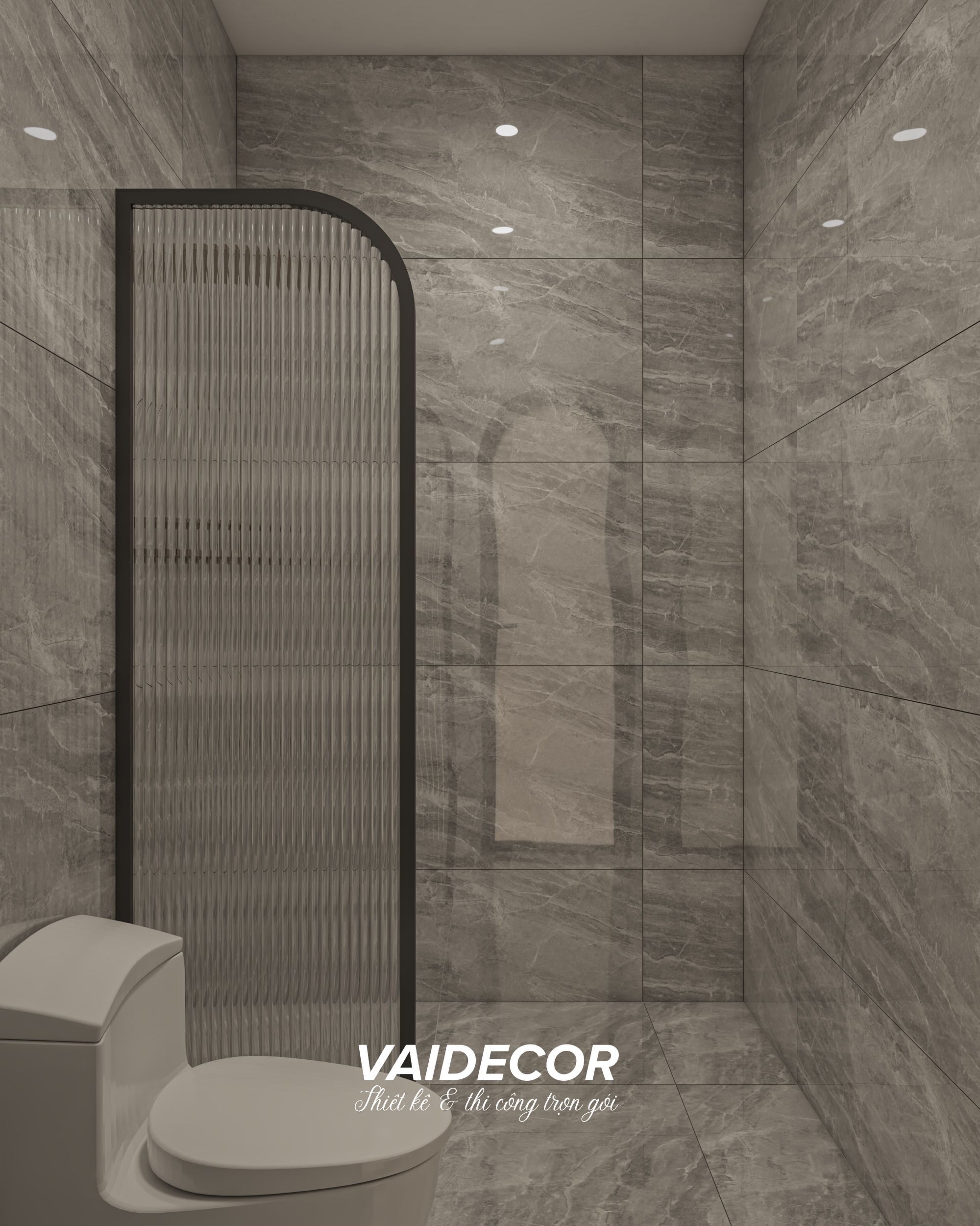 • Tương phản vật liệu cá tính: Bước qua cánh cửa vòm kính mờ, không gian bên trong nhà tắm mang một sắc thái hoàn toàn khác. Chúng tôi sử dụng gạch ốp lát vân đá màu xám đậm bao phủ toàn bộ sàn và tường. Sự tương phản giữa sắc xám lạnh bên trong và sắc Beige ấm bên ngoài mang lại cảm giác sạch sẽ, chống trơn trượt và cực kỳ hiện đại. Các thiết bị vệ sinh cao cấp với tone màu xám khói/đen nhám được sử dụng để tăng thêm tính đồng bộ.