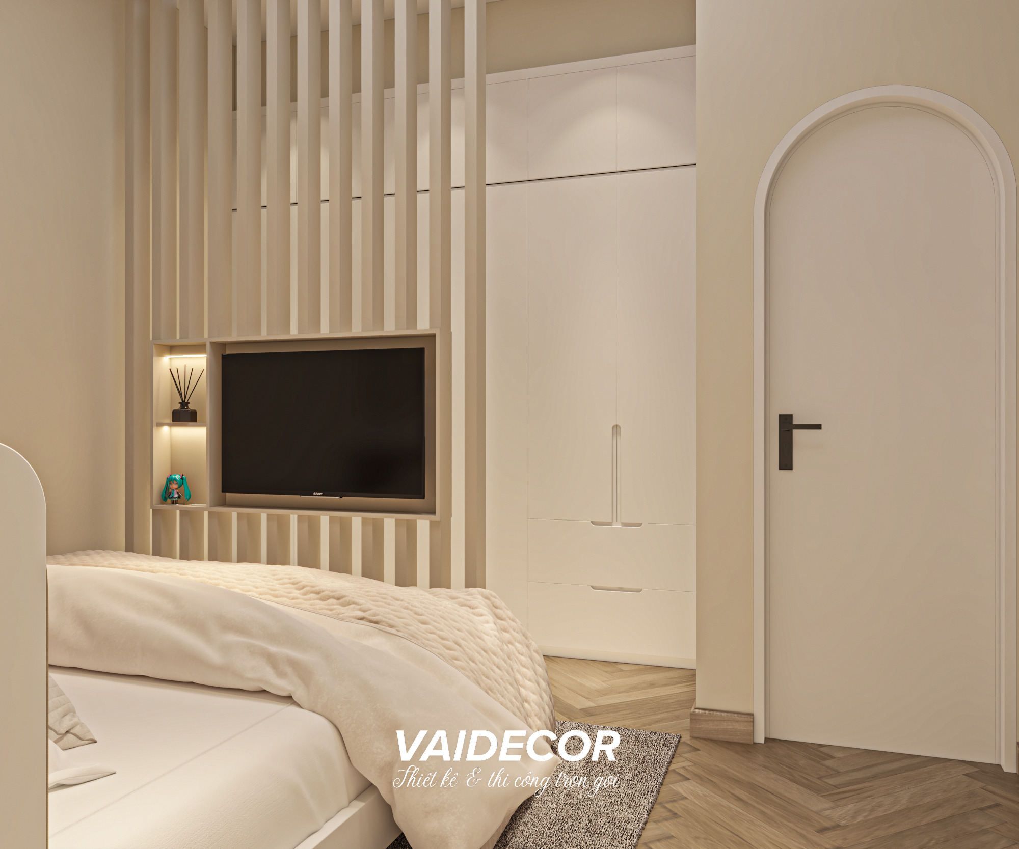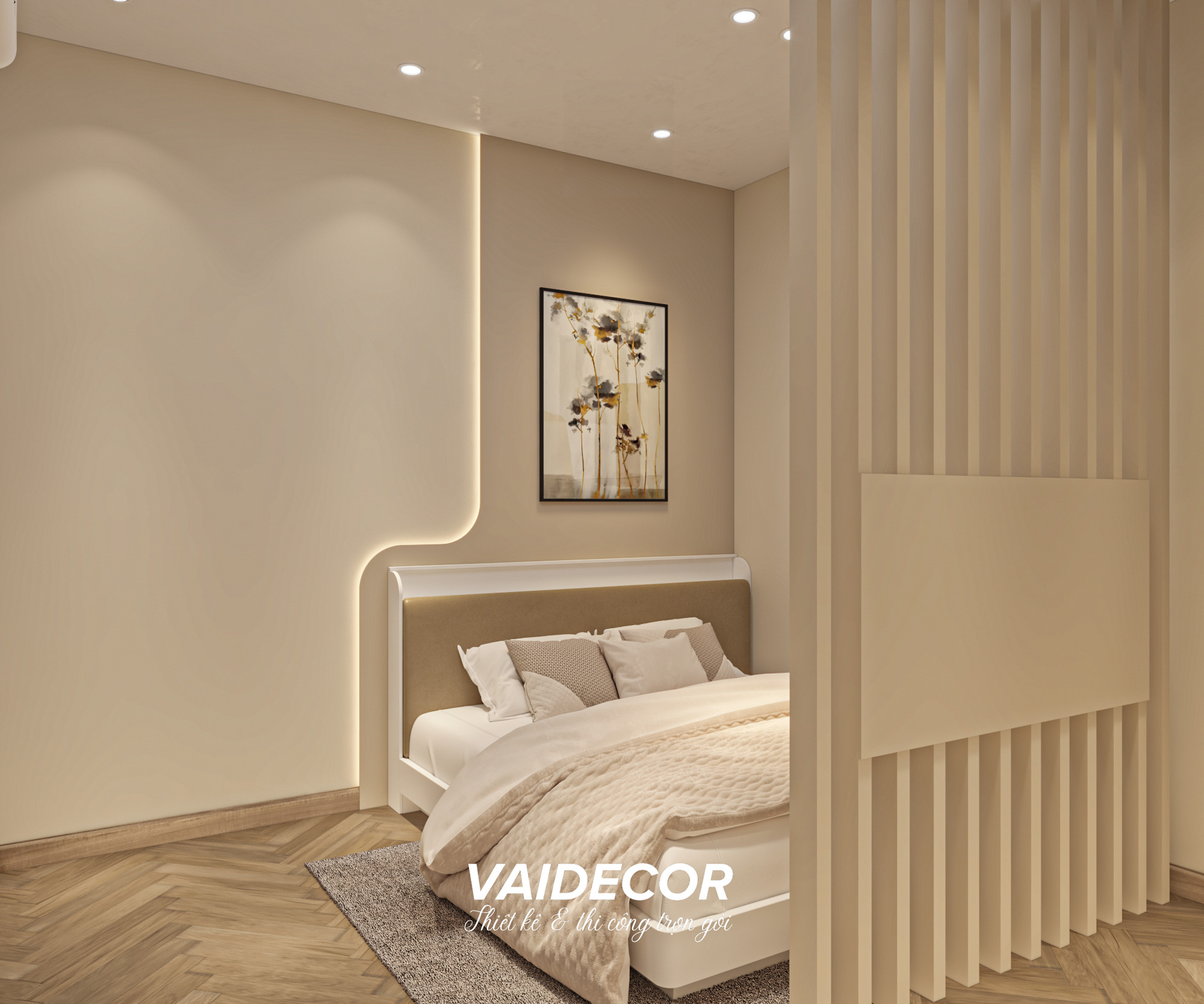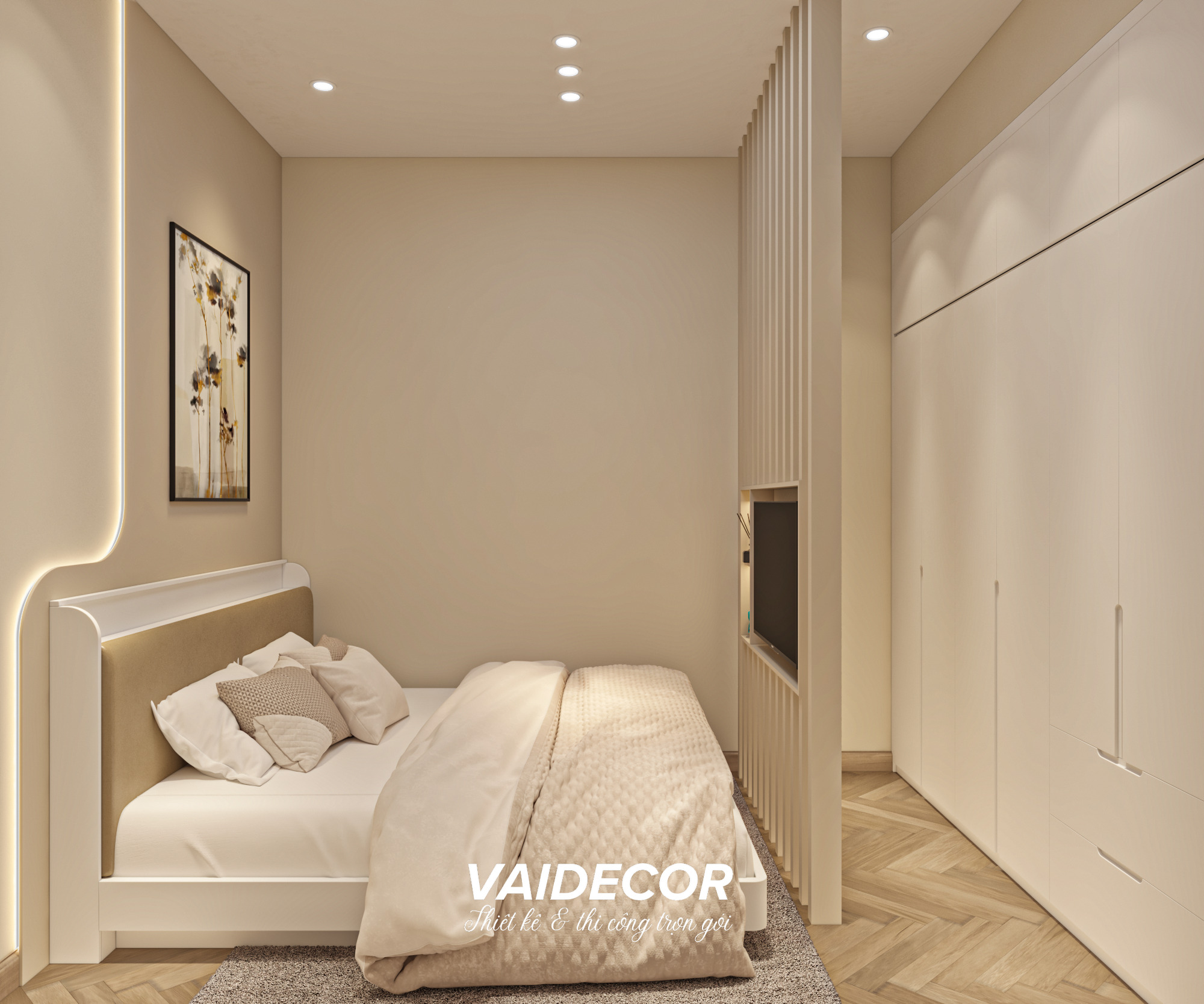 • Vách ngăn nan gỗ đa năng: Để tạo sự riêng tư giữa khu vực giường ngủ và hệ tủ quần áo mà không làm căn phòng bị bí bách, chúng tôi đã sử dụng một vách ngăn nan gỗ sọc dọc kéo dài từ sàn lên trần. Vách ngăn này vừa đóng vai trò chia ranh giới không gian một cách “mềm mại”, vừa được tích hợp khéo léo để làm vách treo Tivi và kệ trang trí nhỏ gọn. Giải pháp này giúp tối ưu hóa diện tích tuyệt đối.