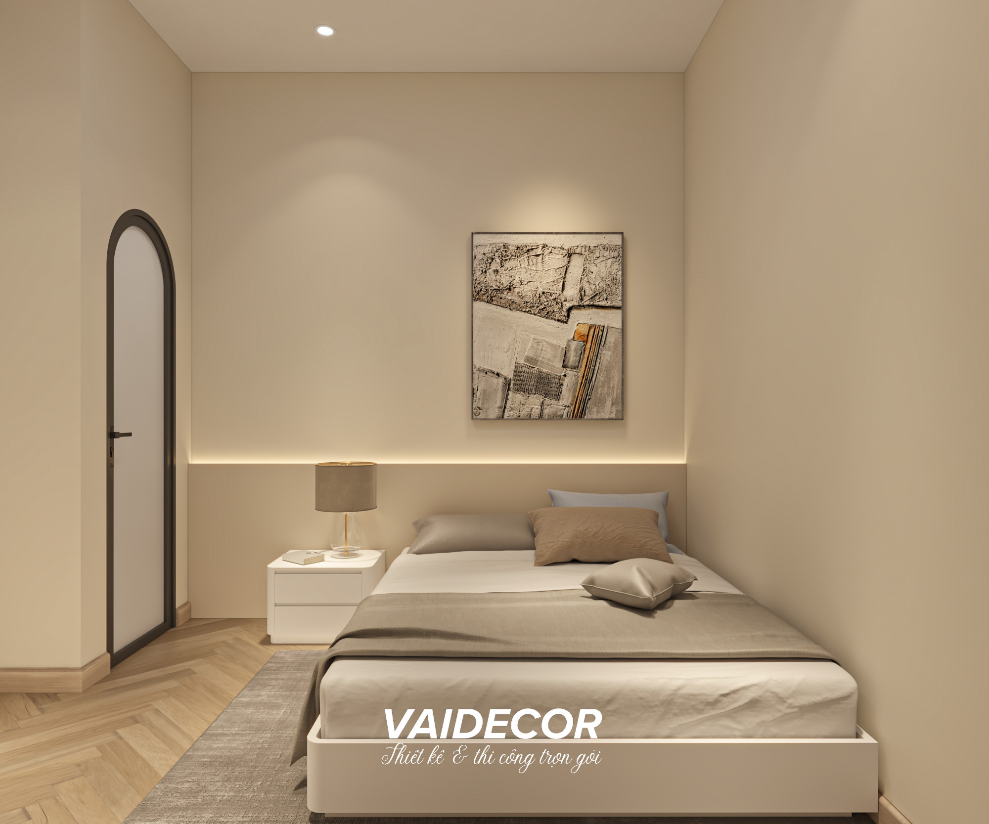 • Bố cục Tối giản (Minimalism): Căn phòng hạn chế tối đa các chi tiết rườm rà. Giường ngủ bọc nệm êm ái kết hợp cùng hệ tủ quần áo âm tường màu trắng sứ. Điểm nhấn thị giác tập trung vào bức tranh nghệ thuật đầu giường và ánh sáng dịu nhẹ từ đèn ngủ, tạo nên một khoảng không tĩnh lặng, an yên.