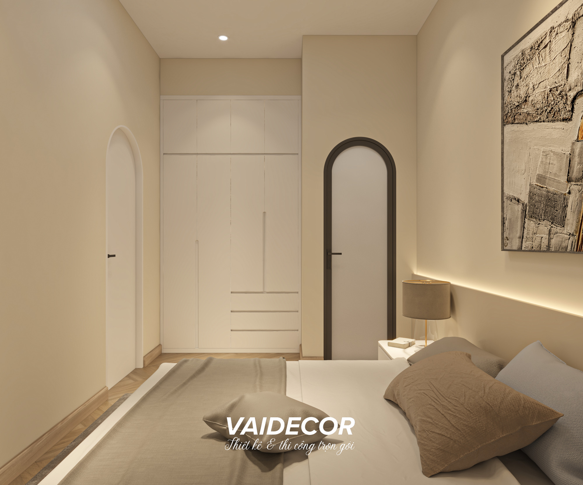 • Cửa vòm điệu đà: Xóa bỏ đi những khung cửa vuông vức thông thường, cửa ra vào phòng ngủ 2 được thiết kế dạng vòm cong. Chi tiết này tạo nên sự đồng nhất hoàn hảo với hệ vòm ở khu vực phòng khách – bếp, mang lại nét điệu đà, uyển chuyển cho không gian nghỉ ngơi.
