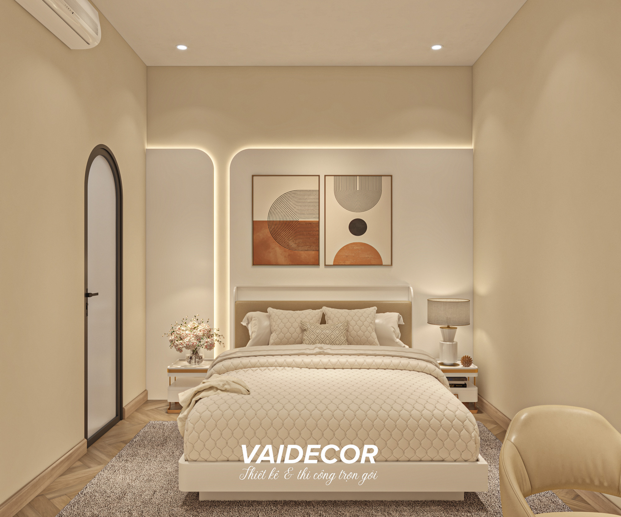 • Điểm nhấn vách đầu giường: Mảng tường đầu giường không hề đơn điệu nhờ chi tiết ốp giật cấp được bo cong góc mượt mà, kết hợp cùng dải đèn LED hắt khe ánh sáng vàng. Nó tạo ra chiều sâu thị giác và cảm giác thư thái, dễ chịu cho đôi mắt trước khi chìm vào giấc ngủ.