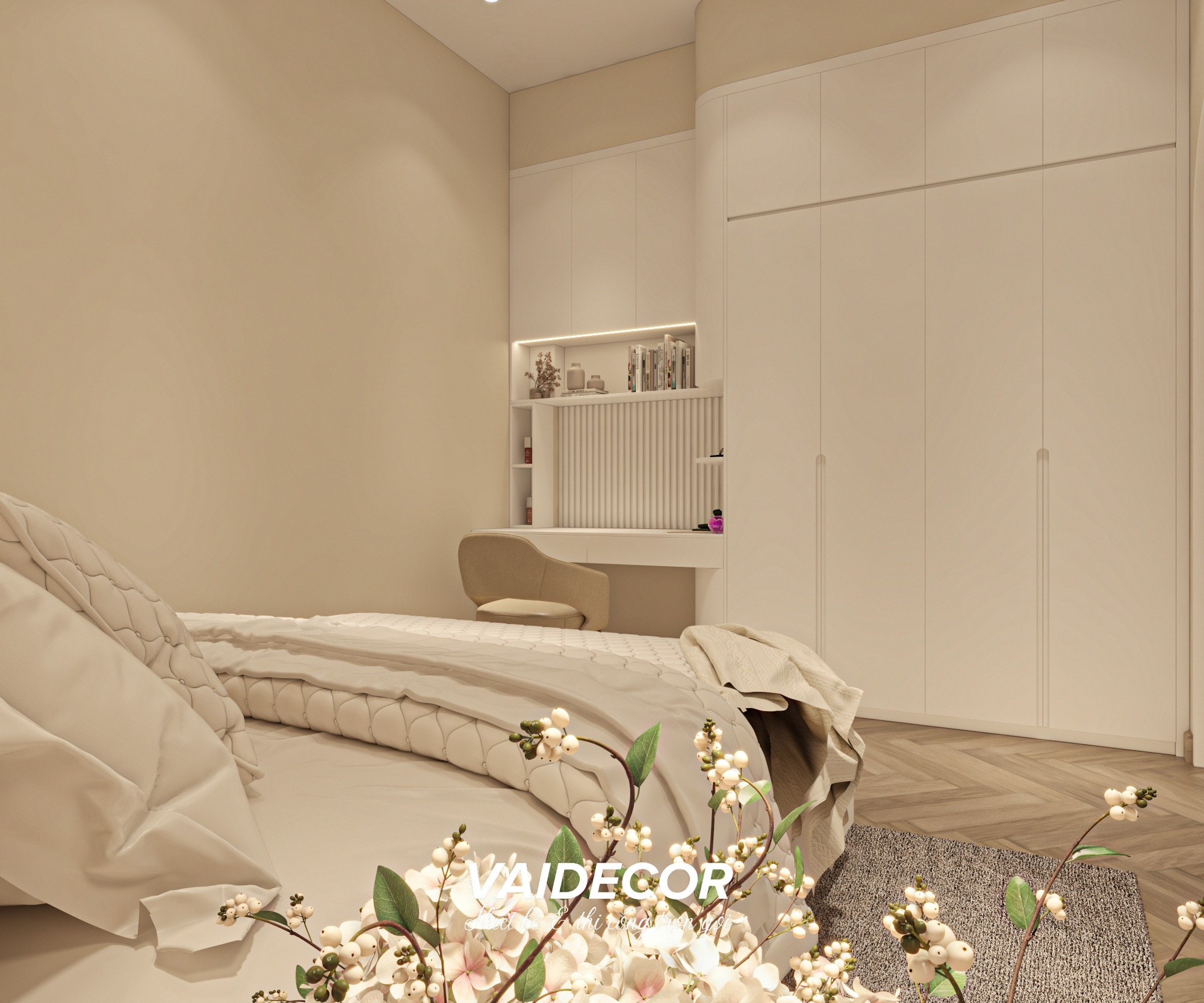 • Hệ tủ lưu trữ “ẩn mình”: Phía sau vách ngăn là hệ tủ quần áo cánh phẳng màu trắng kem cao kịch trần, thiết kế tay nắm âm. Sự tối giản này giúp tủ hòa lẫn vào bức tường, mở rộng không gian lưu trữ mà không gây cảm giác nặng nề.