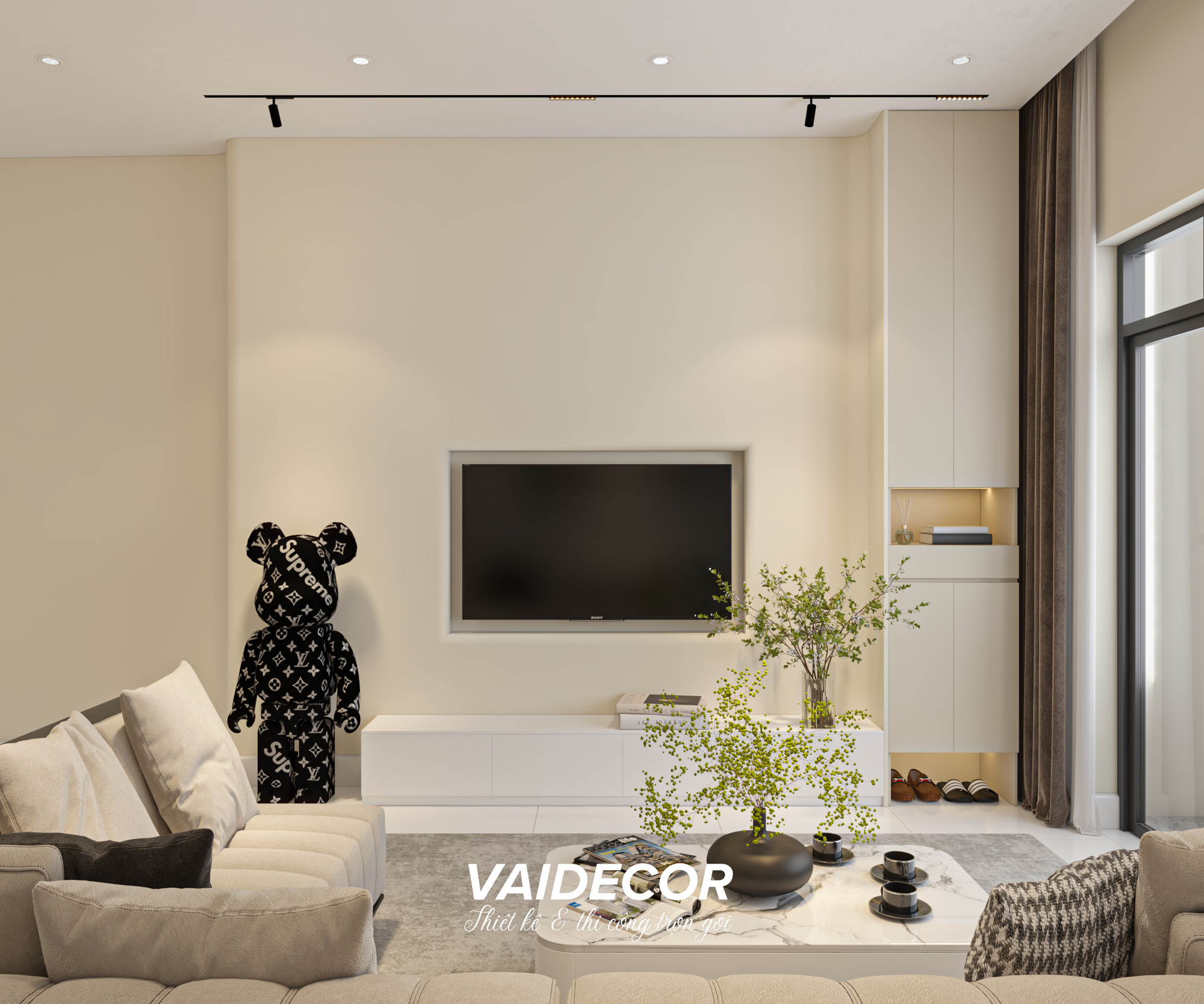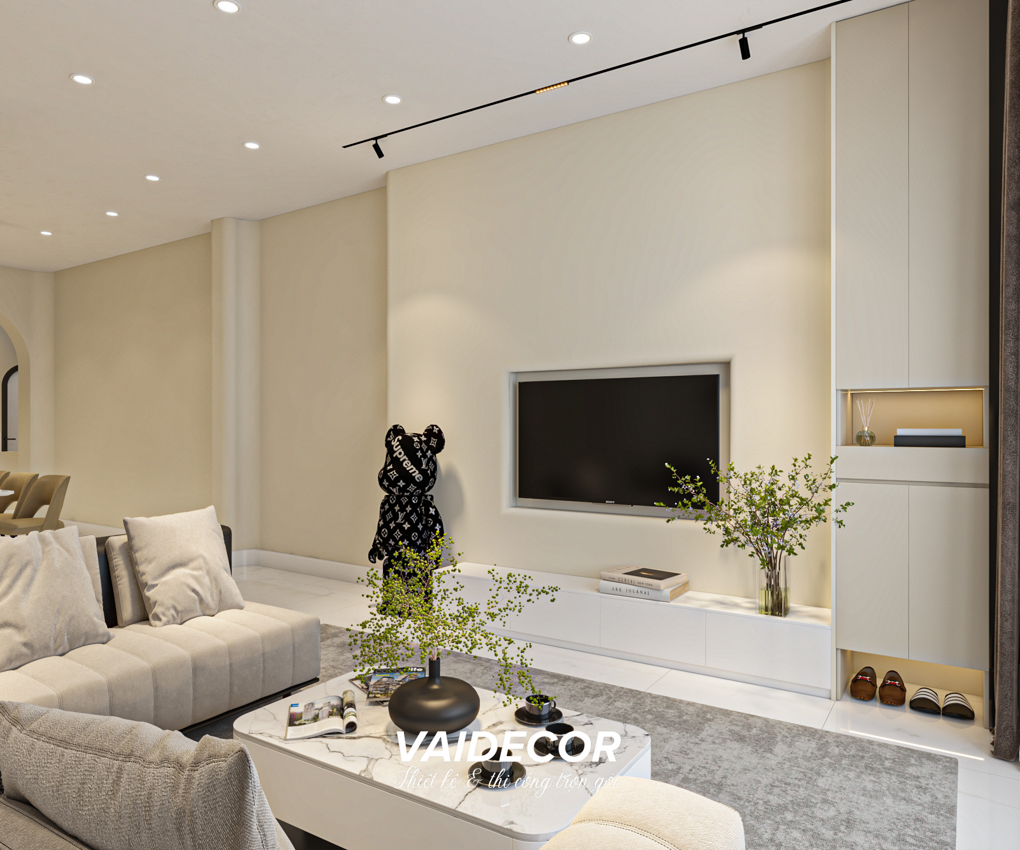 Nhằm tạo cảm giác lối đi rộng rãi nhất có thể, vách TV được thiết kế tối giản tuyệt đối. Thay vì sử dụng kệ tủ cồng kềnh, chúng tôi thi công mảng tường giật cấp nhẹ để đặt lọt lòng chiếc tivi, kết hợp kệ tivi treo tường màu trắng. Ngay cạnh đó, hệ tủ giày dép và lưu trữ được thiết kế âm tường, cao kịch trần với tone màu đồng bộ với sơn tường.