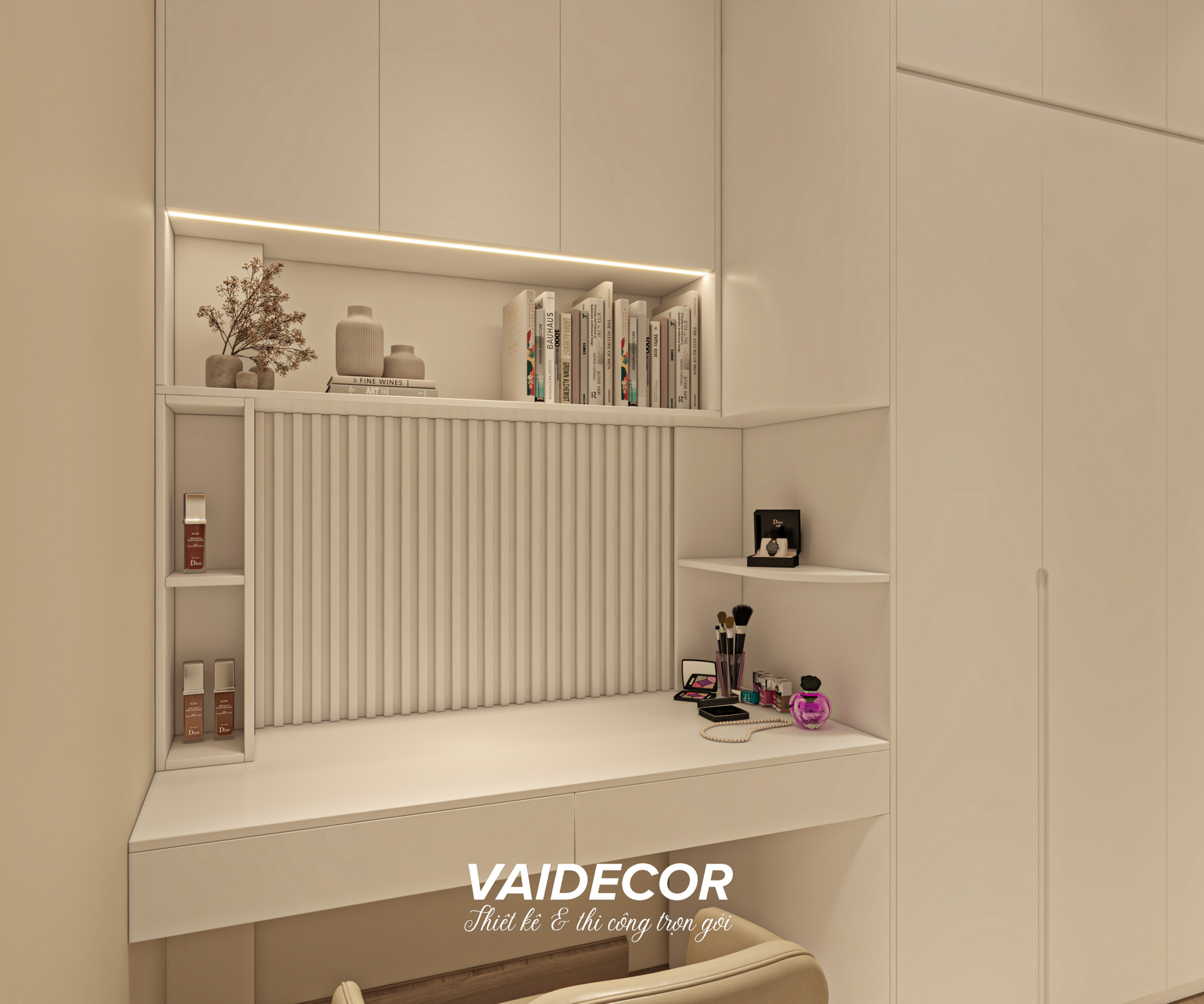 • Hệ module Tủ quần áo – Bàn trang điểm liền kề: Thay vì mua nội thất rời rạc, chúng tôi thiết kế một hệ tủ custom-made “đo ni đóng giày” cho không gian này. Tủ quần áo lớn kịch trần nối liền mạch với khu vực bàn trang điểm. Điểm nhấn nổi bật là vách ốp lam sóng sọc dọc phía sau bàn trang điểm, kết hợp cùng chiếc gương tròn tỏa ánh sáng LED viền, mang lại trải nghiệm làm đẹp xa hoa như trong các studio cao cấp. Các ngăn kệ hở được bố trí khéo léo để trưng bày nước hoa, túi xách, thể hiện gu thẩm mỹ tinh tế của nữ chủ nhân.