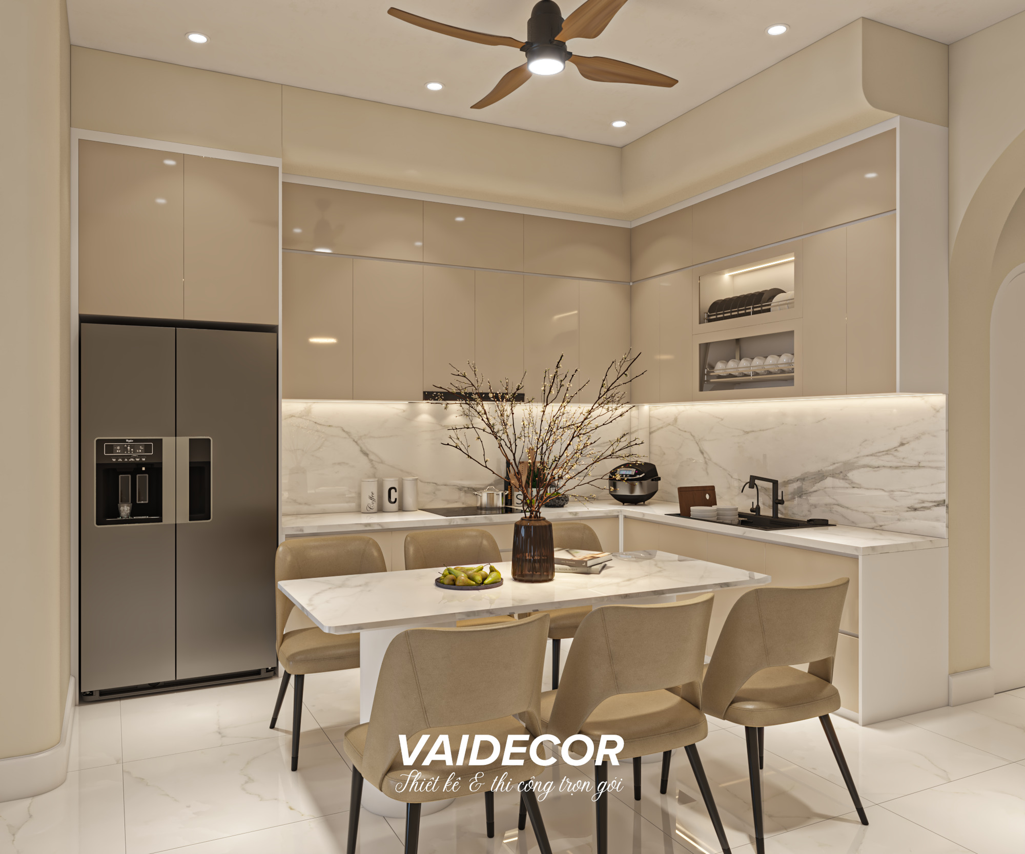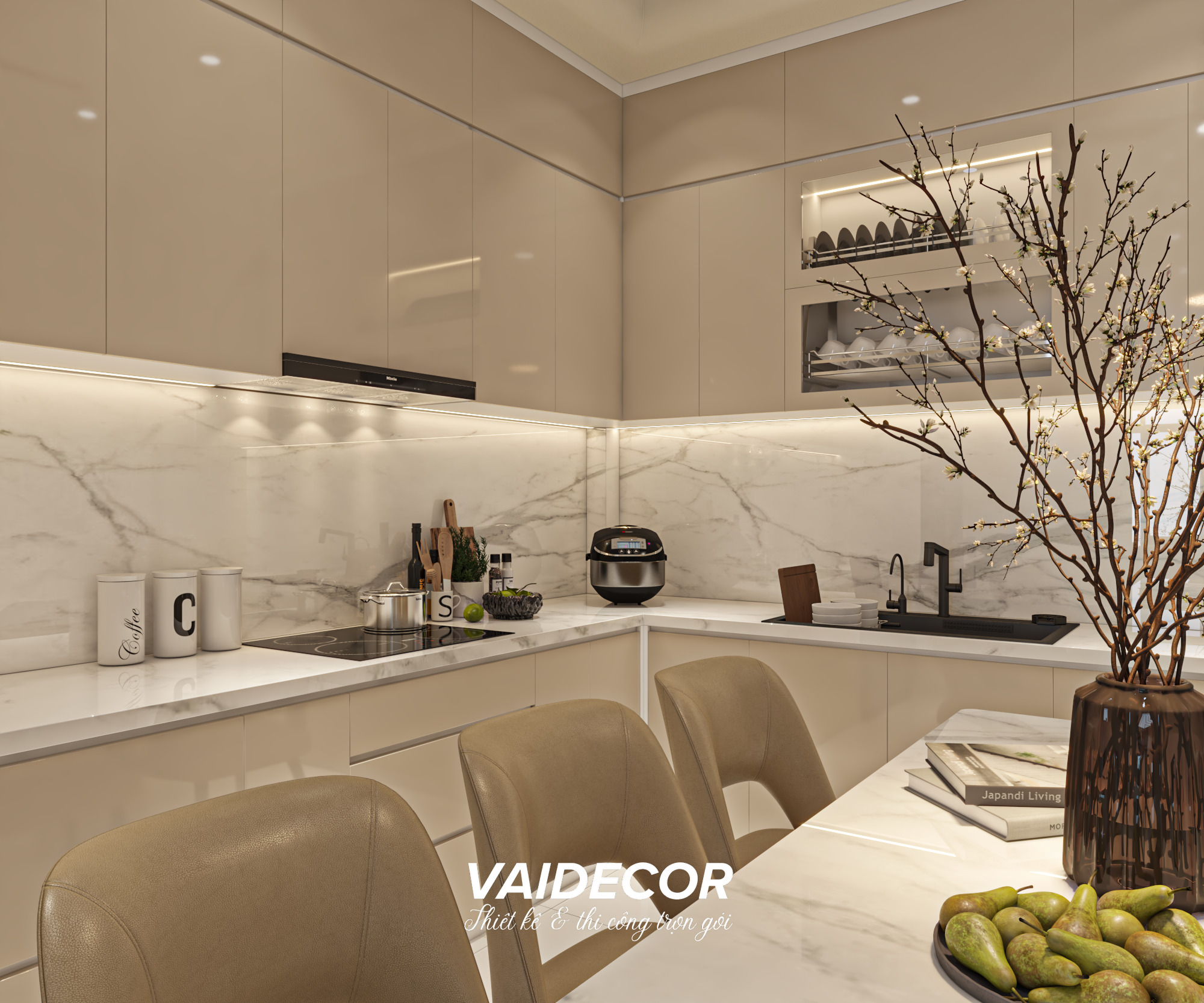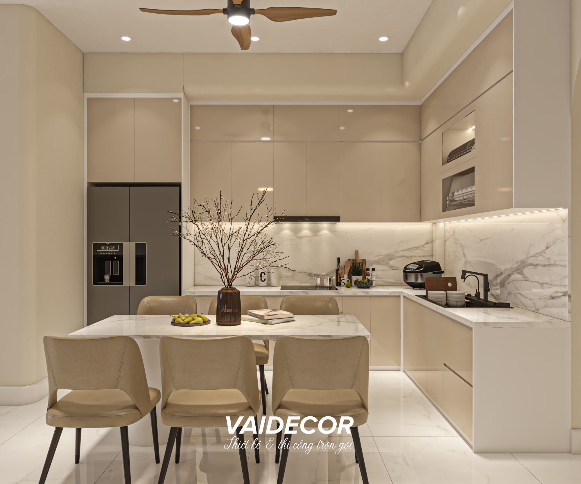 • Tối ưu lưu trữ với hệ tủ bếp chữ L: Chúng tôi thiết kế hệ tủ bếp cao kịch trần, bám sát các góc tường nhằm tối đa hóa công năng lưu trữ. Bề mặt tủ được phủ Acrylic bóng gương mang tone màu Beige chủ đạo, kết hợp cùng hệ thống đèn LED hắt sáng dưới tủ. Sự kết hợp này không chỉ giúp khuếch tán ánh sáng, tạo cảm giác bếp luôn sạch sẽ, rộng rãi mà còn toát lên vẻ đẹp cực kỳ sang trọng. Mặt bếp và tường bếp (backsplash) được ốp đá Marble trắng vân mây liền khối, giúp gia chủ dễ dàng vệ sinh sau khi nấu nướng.