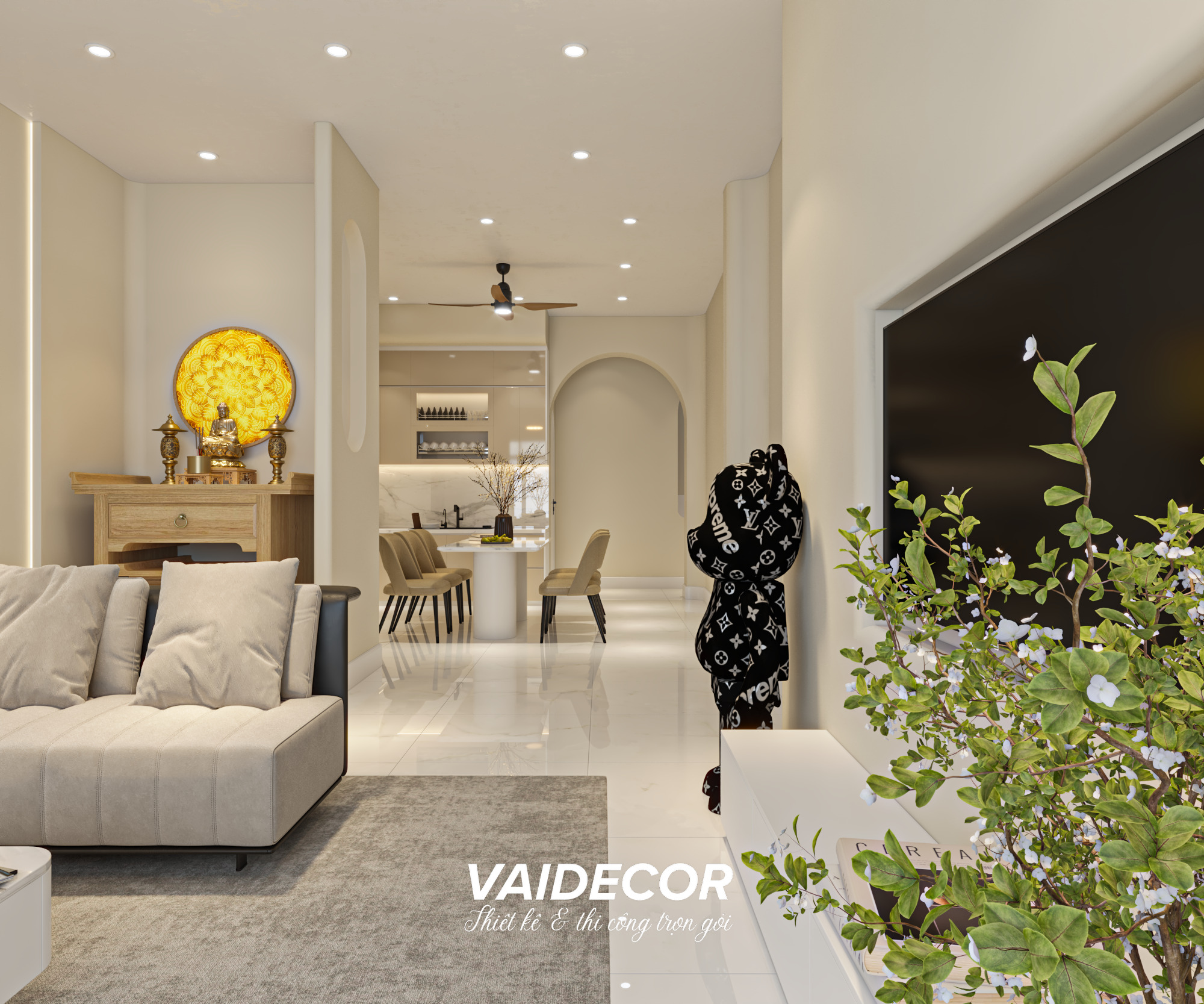 • Xử lý kết cấu bằng “Ngôn ngữ đường cong”: Để kết nối phần nhà 70m2 cũ và 50m2 xây mới, sự xuất hiện của các cột chịu lực là không thể tránh khỏi. Thay vì tìm cách giấu đi một cách gượng ép, KTS Vaidecor đã biến nhược điểm thành điểm nhấn nghệ thuật. Các phần cột thô cứng, góc trần thạch cao và các ô cửa đi lại đều được bo cong mềm mại thành các hệ vòm. Giải pháp này phá vỡ sự cứng nhắc của các khối bê tông, tạo sự uyển chuyển, liên kết mượt mà giữa các phân khu mà không hề bị phô hay đứt gãy mạch thiết kế.