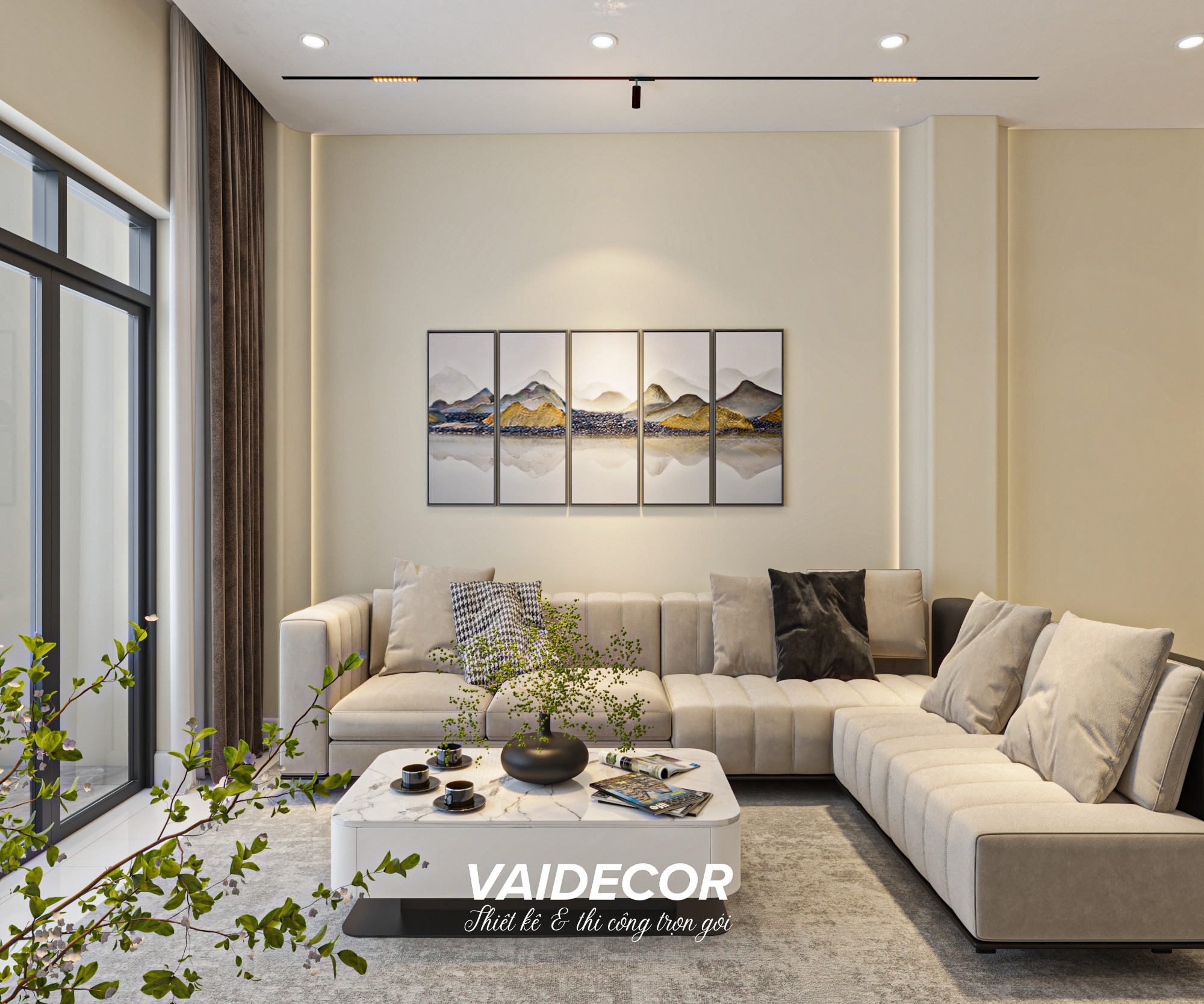 Tuân thủ “đề bài” của gia chủ, toàn bộ không gian được khoác lên tone màu Beige (be) làm chủ đạo. Để không gian không bị đơn điệu, chúng tôi tập trung vào việc phối hợp các bề mặt chất liệu. Sự xuất hiện của bộ sofa module chữ L cỡ lớn bọc nỉ nhung êm ái, kết hợp cùng bàn trà mặt đá marble trắng vân mây, tạo nên một tổng thể vô cùng hài hòa, sang trọng.