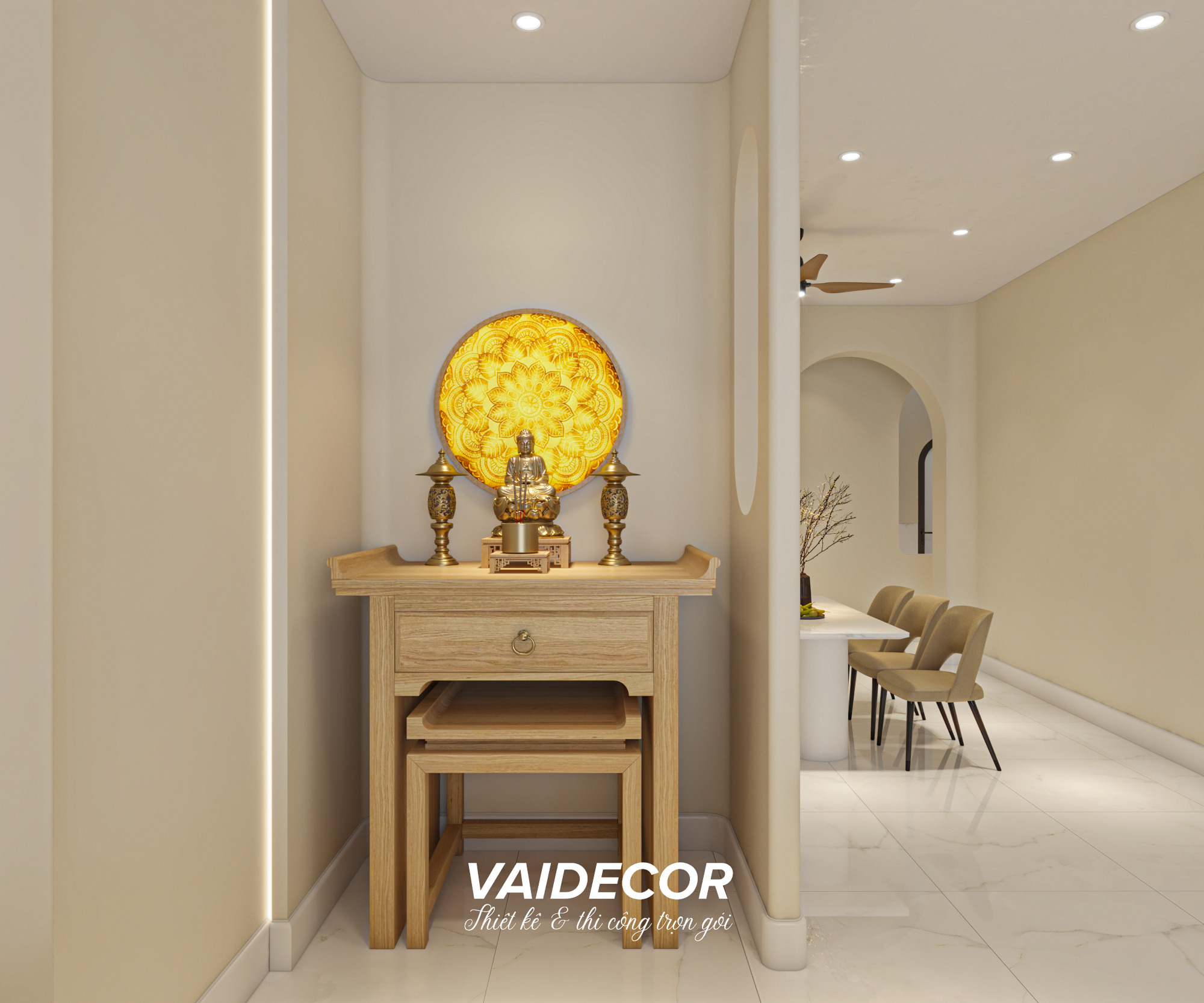 Điểm nhấn là vách ốp hậu họa tiết Mandala tỏa ánh sáng vàng ấm áp, tạo sự linh thiêng, thanh tịnh. Thiết kế này biến khu vực thờ cúng thành một vách ngăn “mềm” phân chia không gian tinh tế mà không cần đến những bức tường ngột ngạt.
