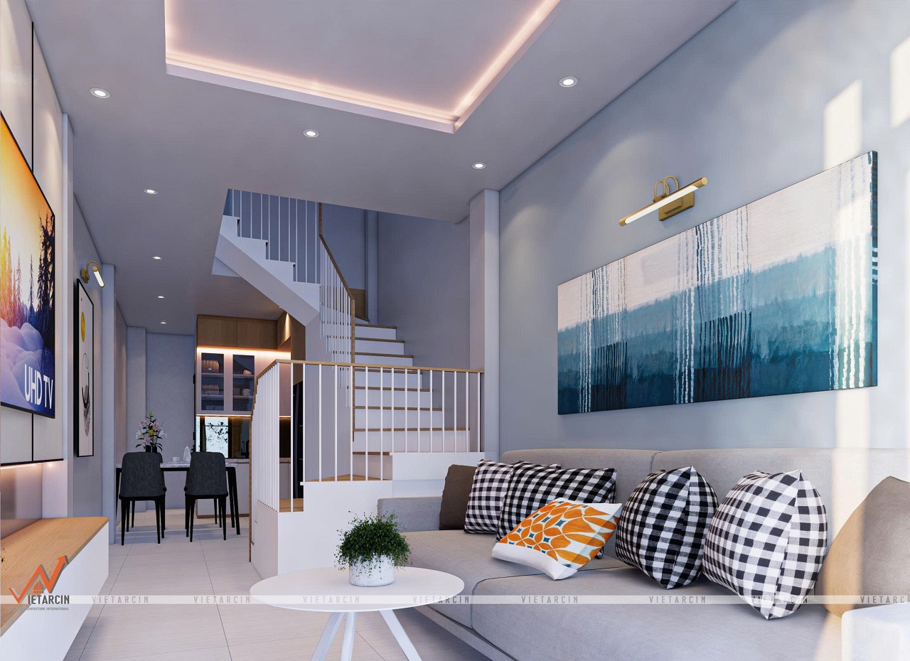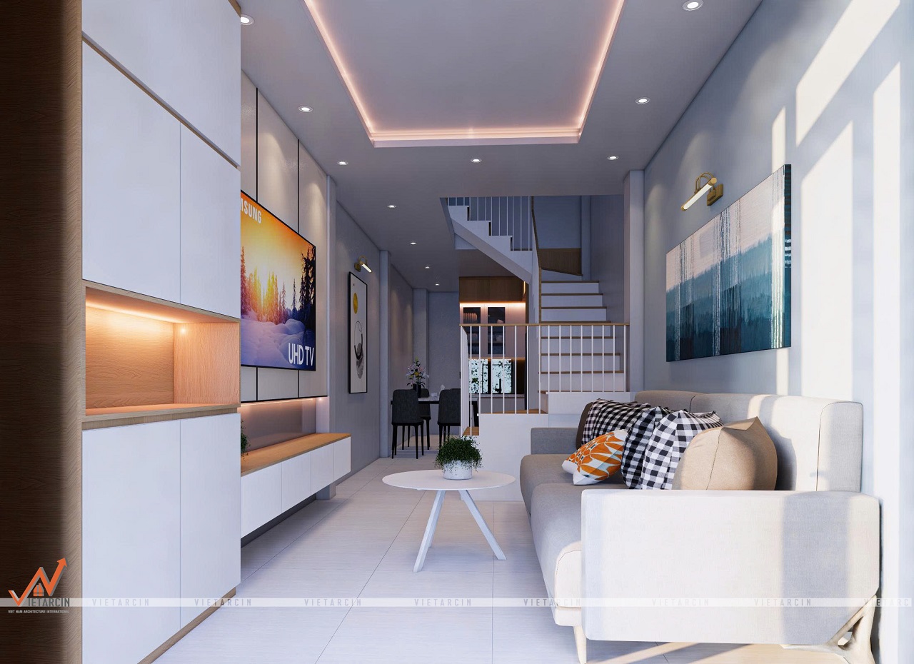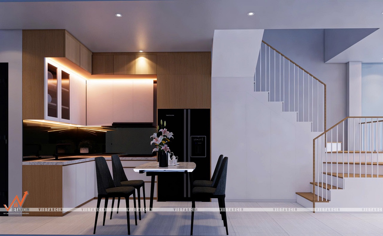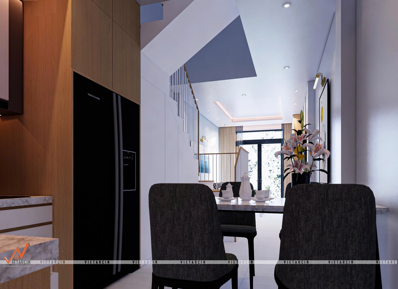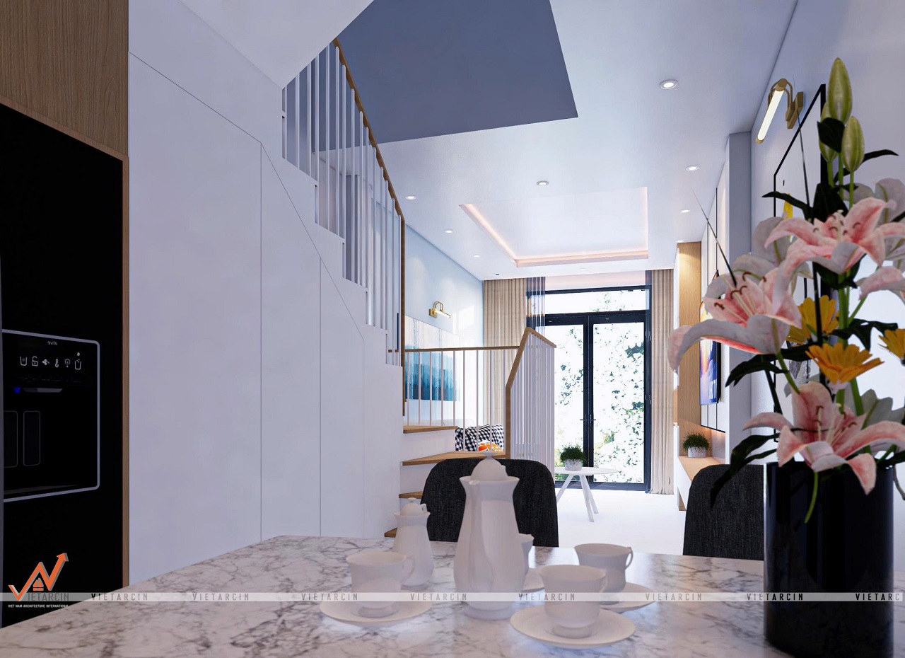 - Tầng trệt được thiết kế mở, nối liền phòng khách và bếp. Giải pháp này giúp xóa bỏ cảm giác chật chội, tạo luồng di chuyển thông suốt.