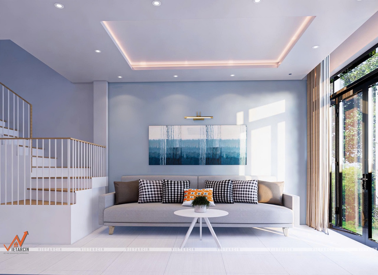 - Nội thất tối giản gồm sofa, bàn trà, kệ TV và tranh treo tường tạo điểm nhấn.