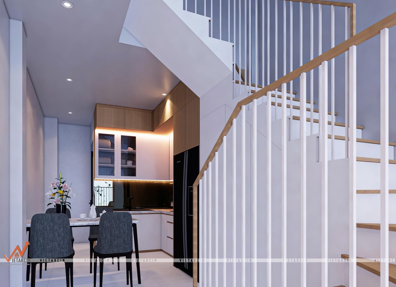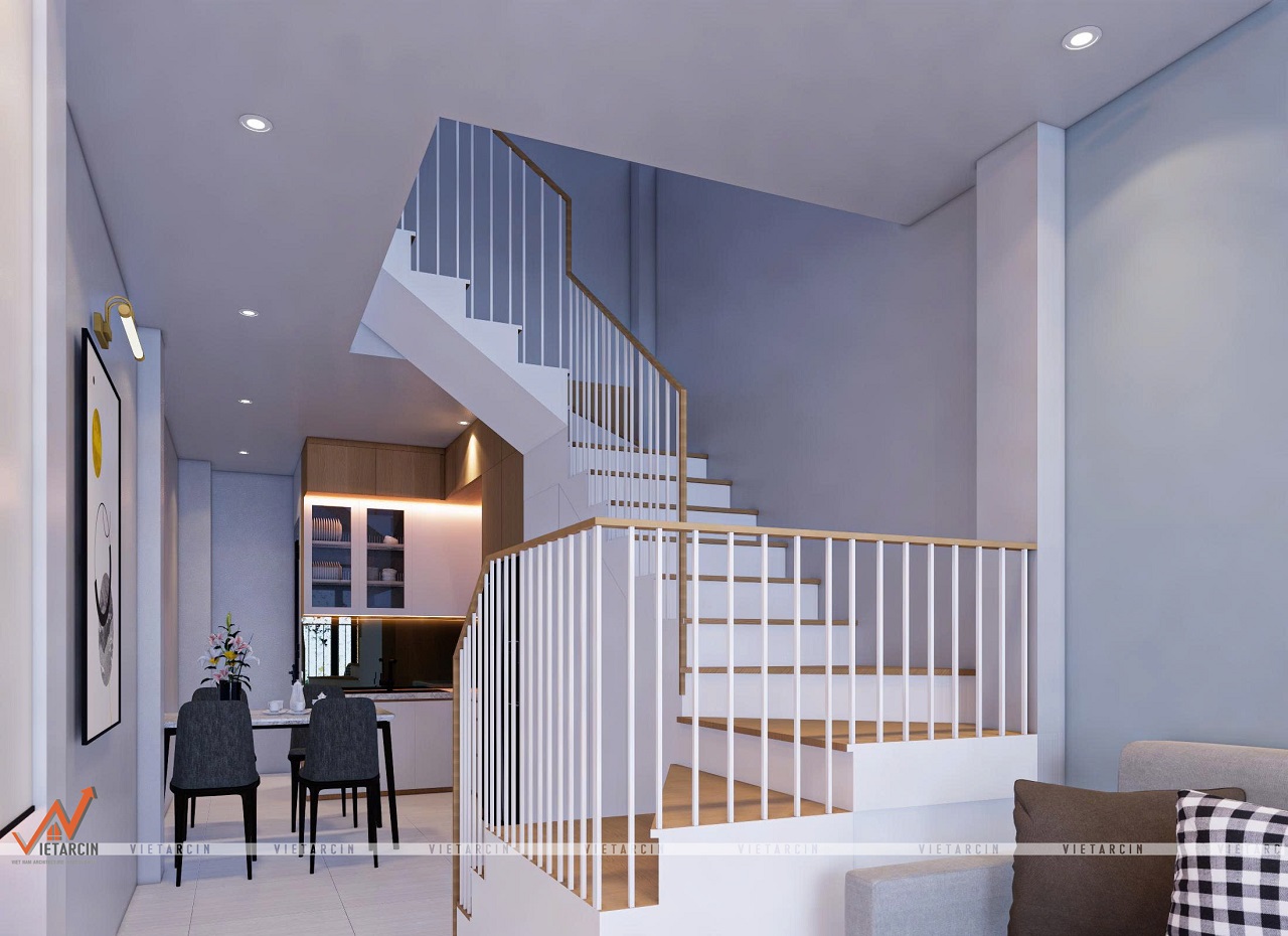 - Thiết kế hiện đại: Cầu thang được thiết kế với lan can sắt hộp mảnh màu trắng và tay vịn gỗ, tạo cảm giác thanh thoát, hiện đại.