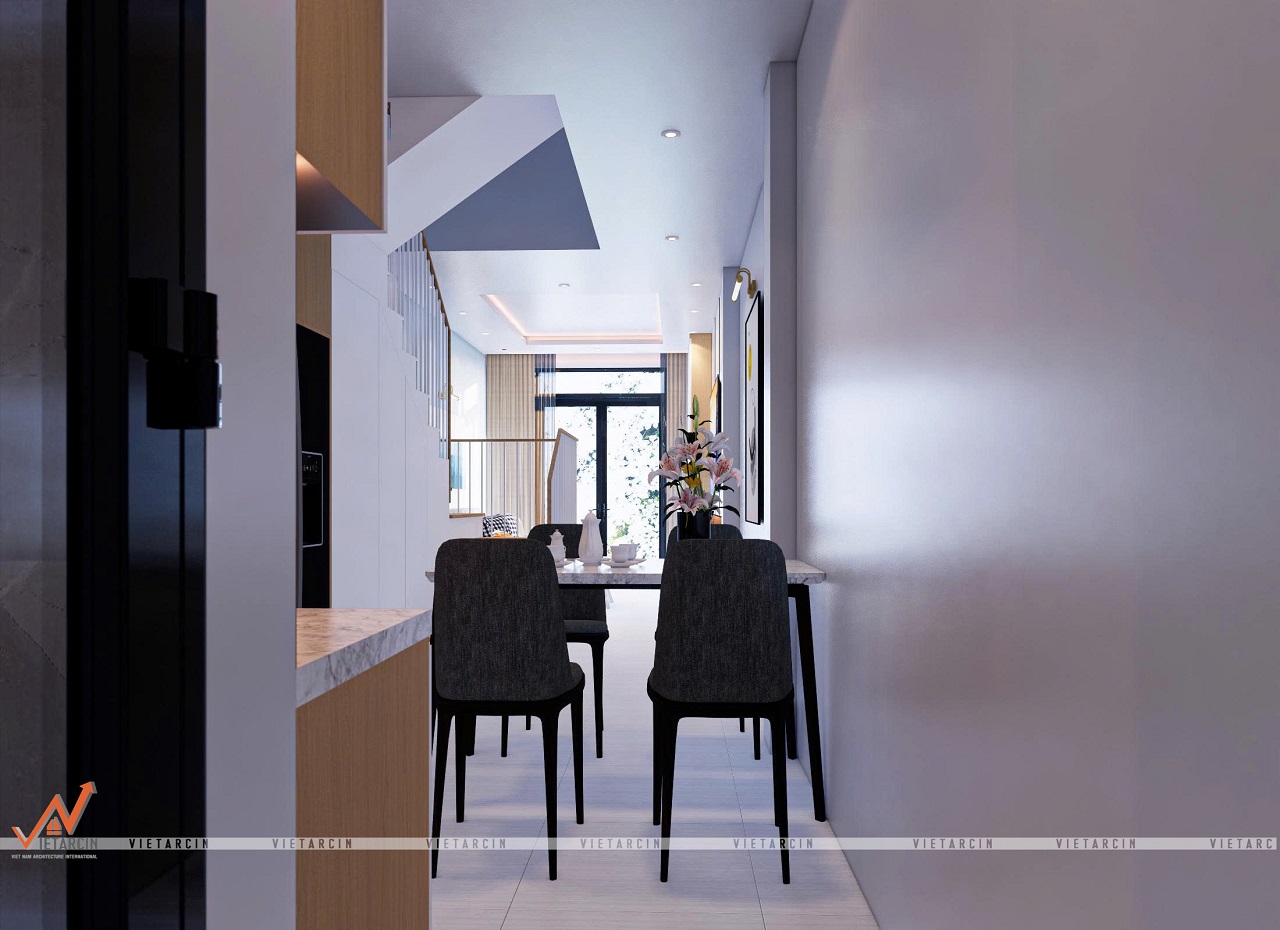 - Bộ bàn ăn nhỏ gọn, mặt đá marble trắng tạo điểm nhấn sang trọng, được đặt cạnh cầu thang, không chiếm nhiều diện tích.