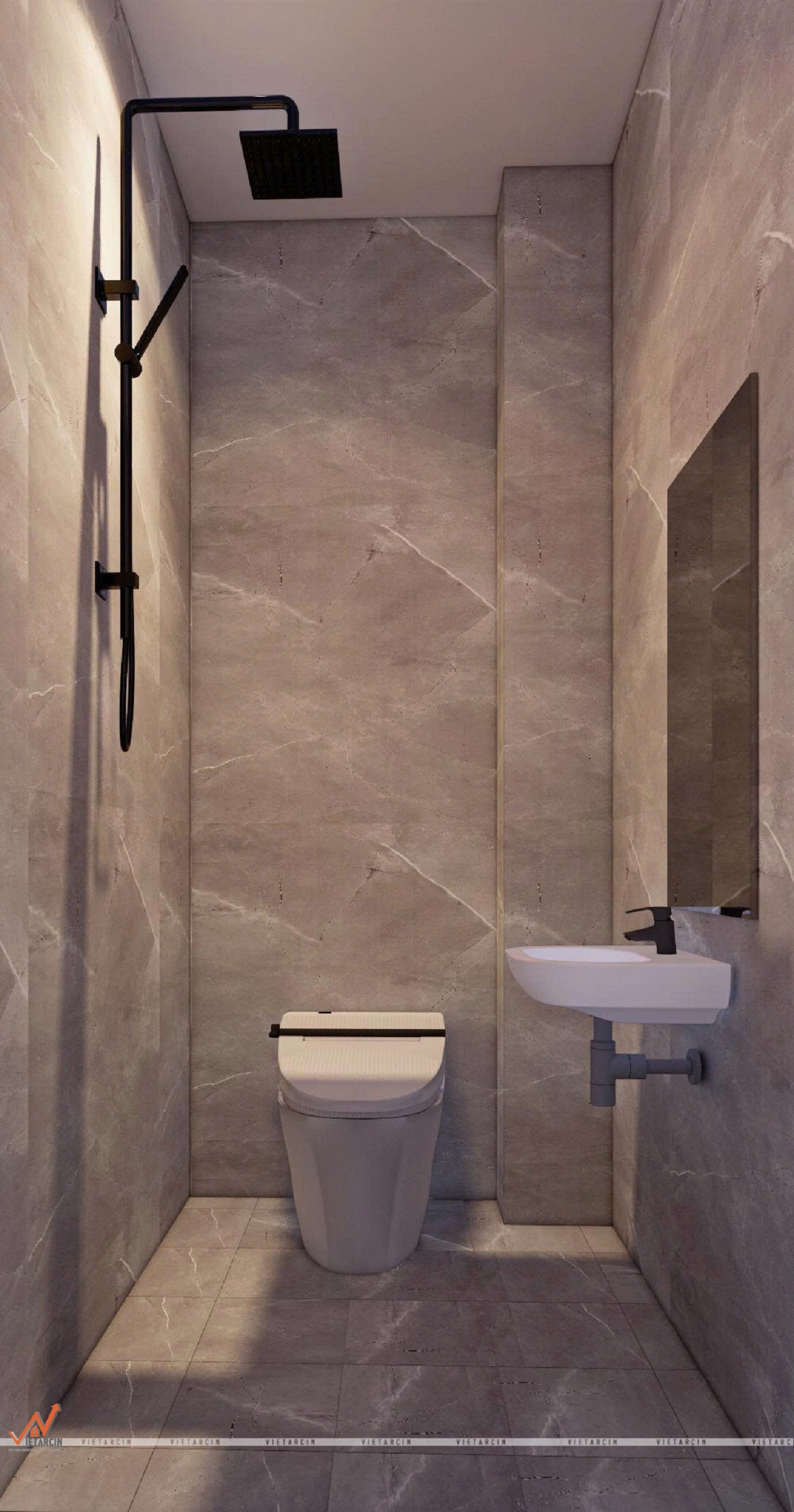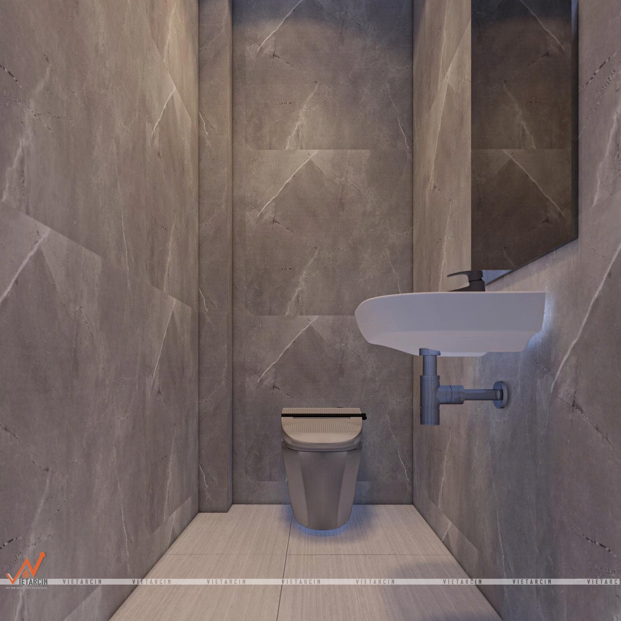 - Không gian nhà vệ sinh được ốp gạch men vân đá màu xám sang trọng.