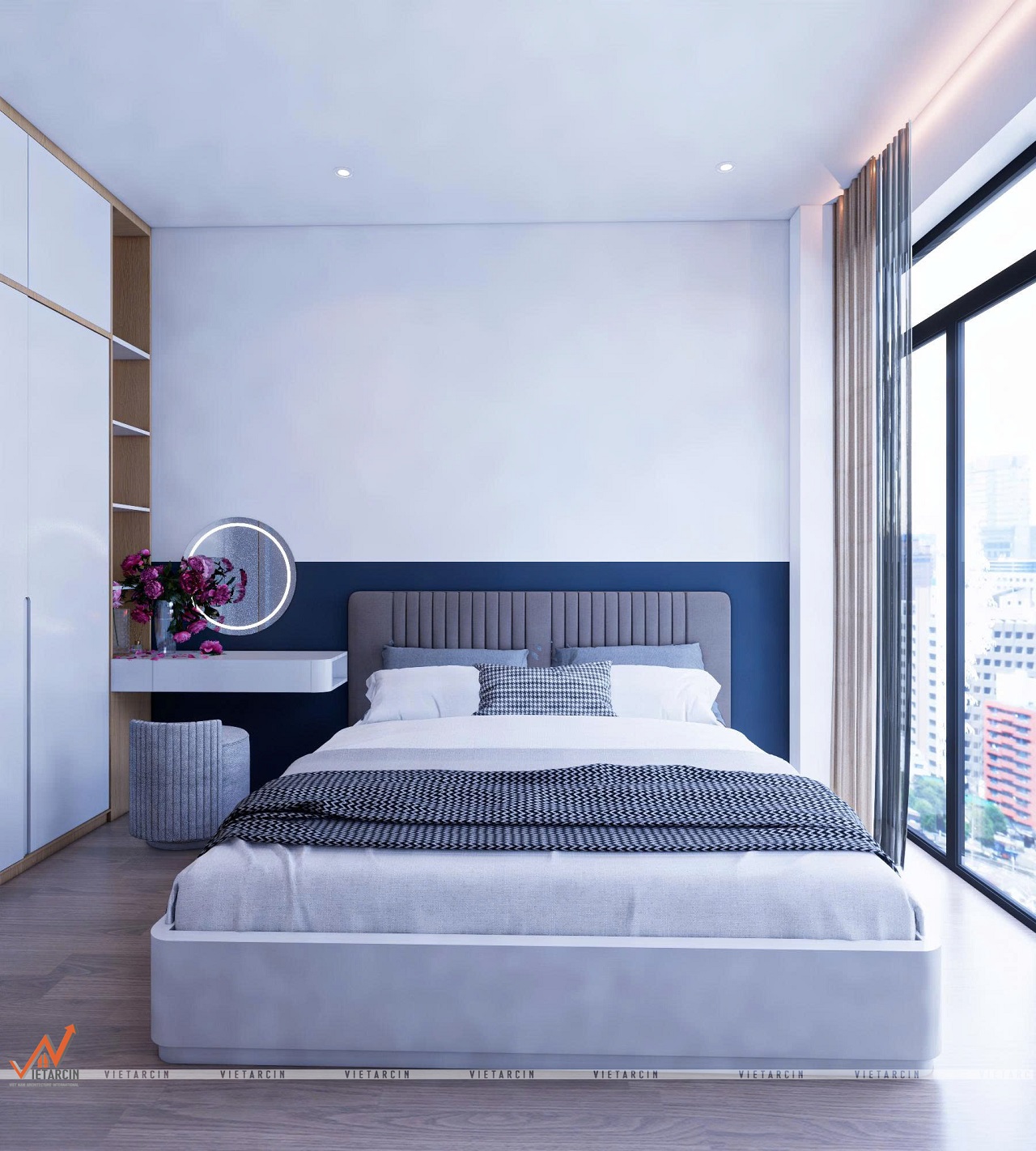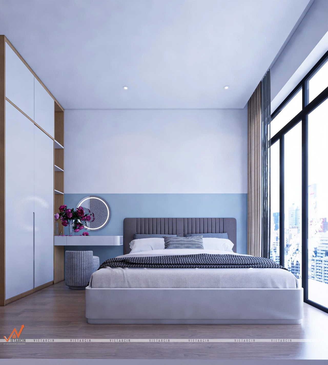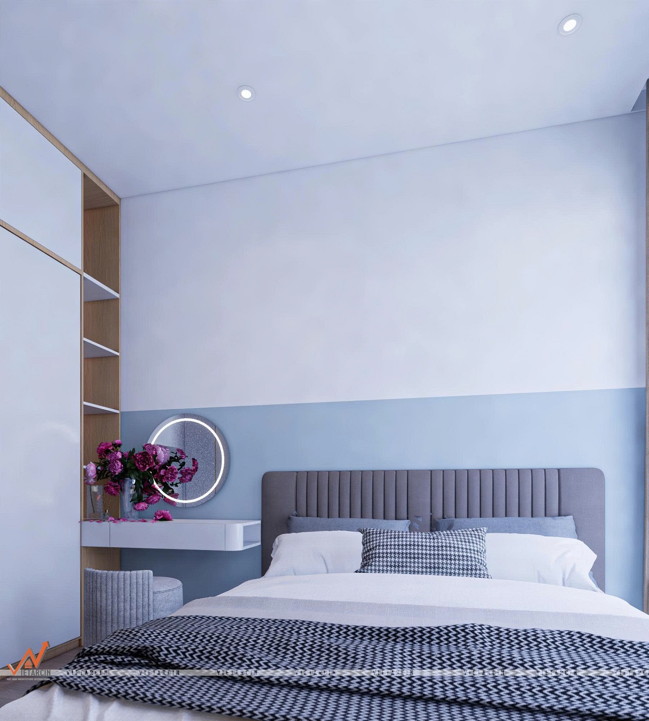 - Bức tường đầu giường được sơn màu xanh dương nhạt kết hợp với màu trắng, tạo hiệu ứng thị giác phân chia không gian một cách tinh tế.