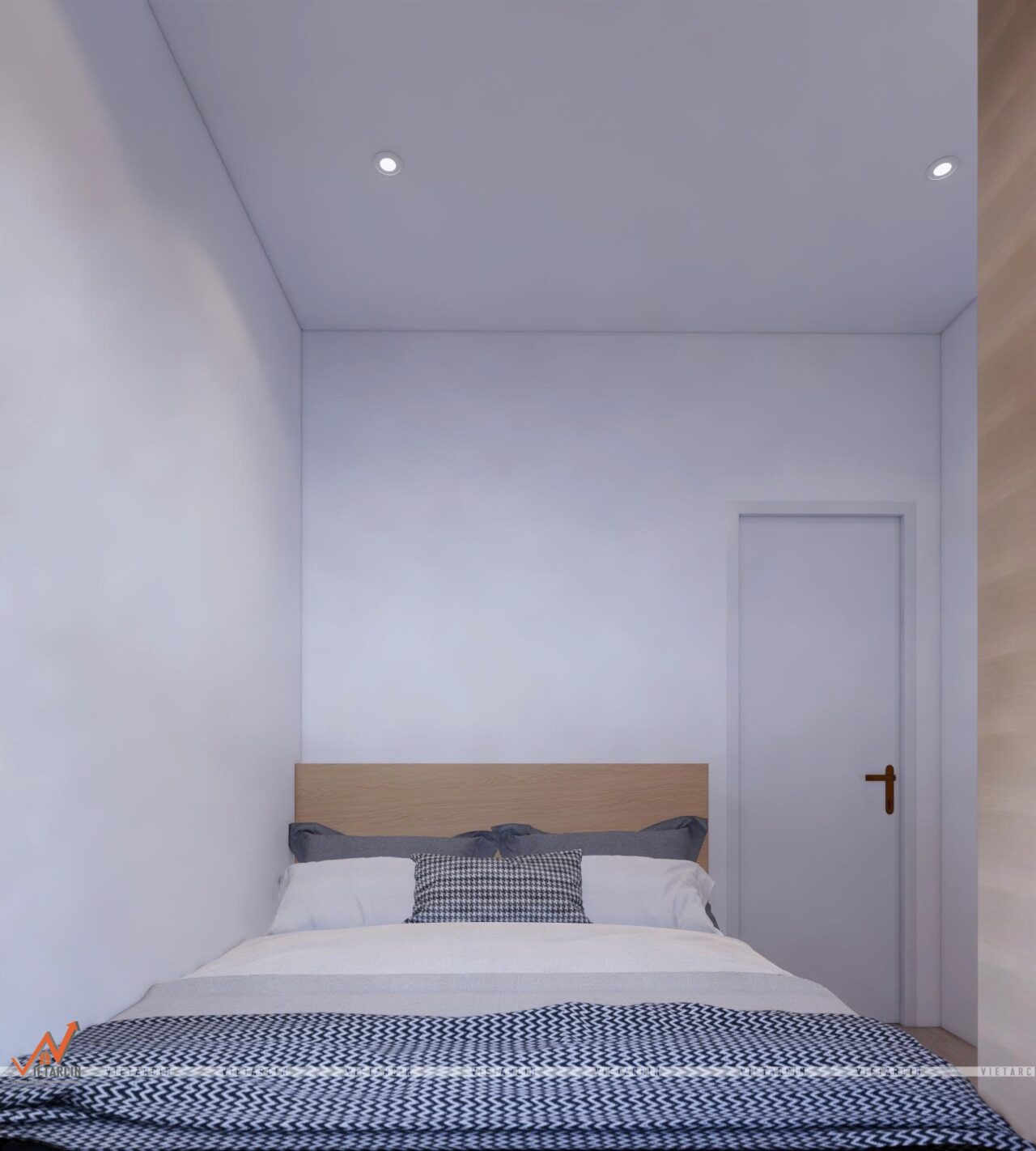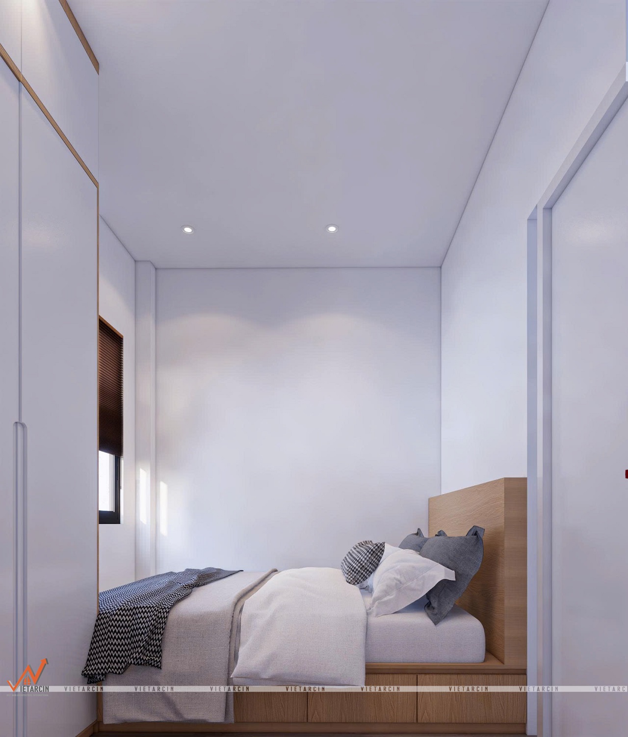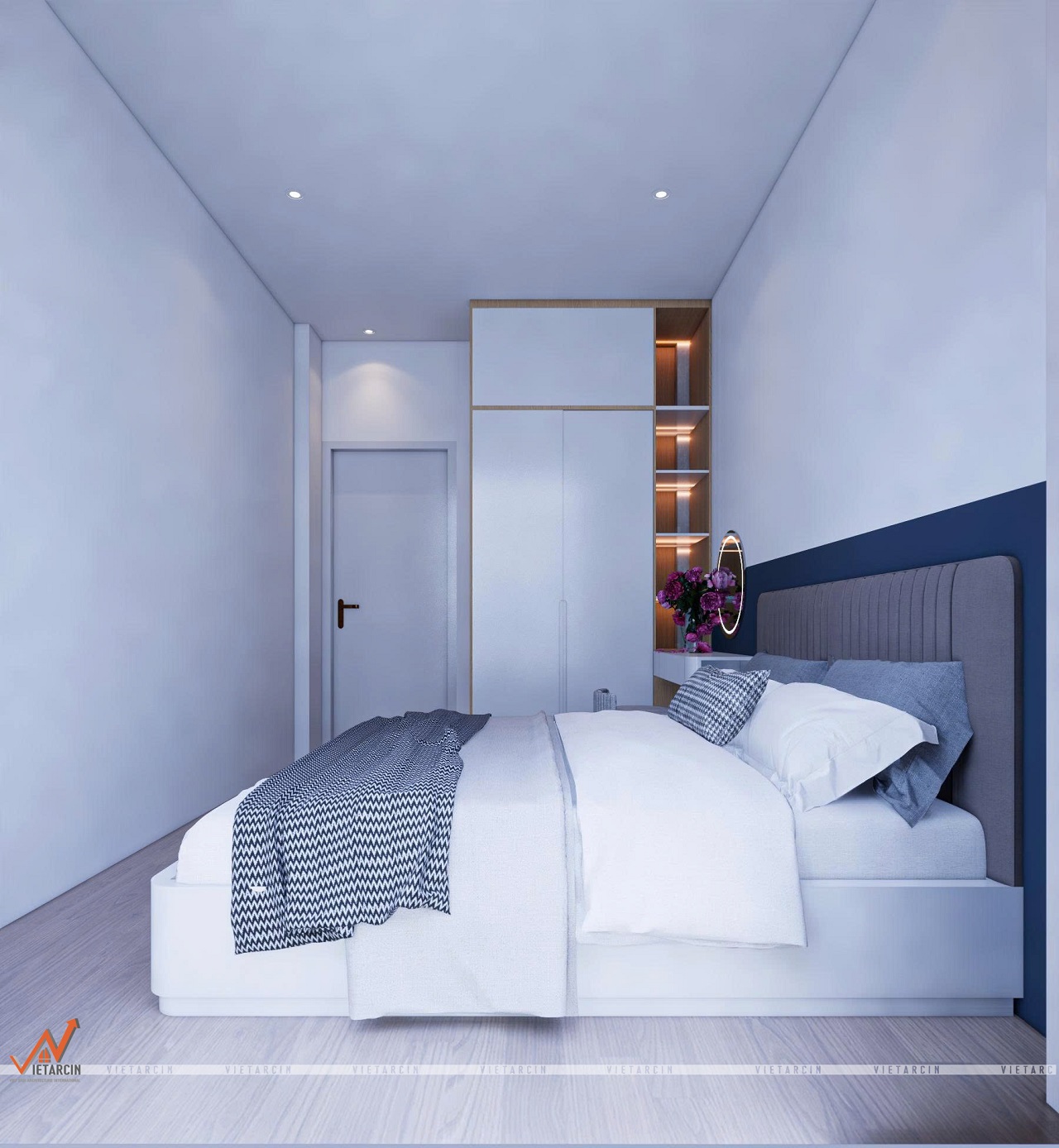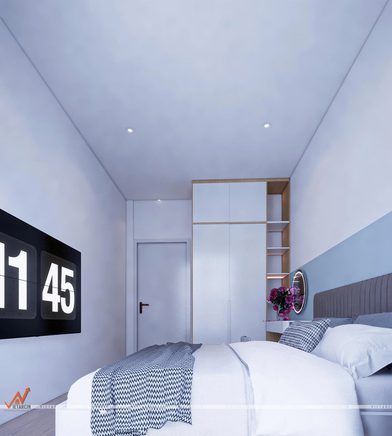 - Tủ quần áo âm tường màu trắng kết hợp với điểm nhấn màu gỗ, vừa gọn gàng, vừa tạo cảm giác rộng rãi hơn cho căn phòng.