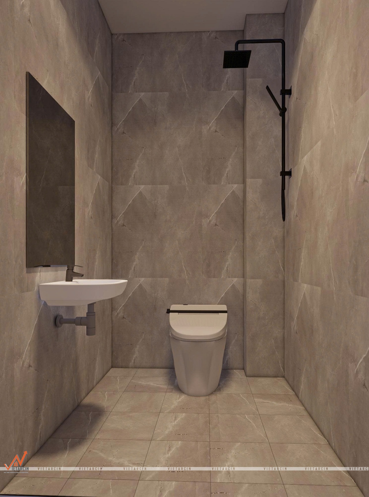 - Tương tự nhà vệ sinh tầng trệt, chúng tôi sử dụng gạch ốp tường và sàn vân đá màu xám, tạo cảm giác sang trọng, sạch sẽ.