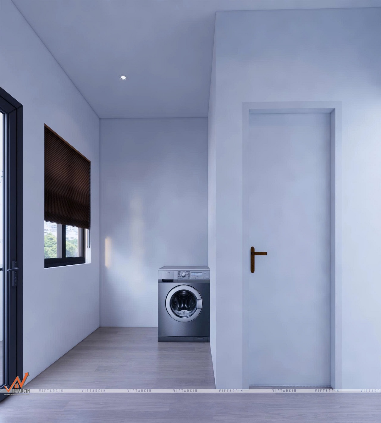 - Tận dụng khoảng trống cuối nhà, chúng tôi đã bố trí một khu vực giặt đồ tiện nghi, đặt máy giặt gọn gàng.