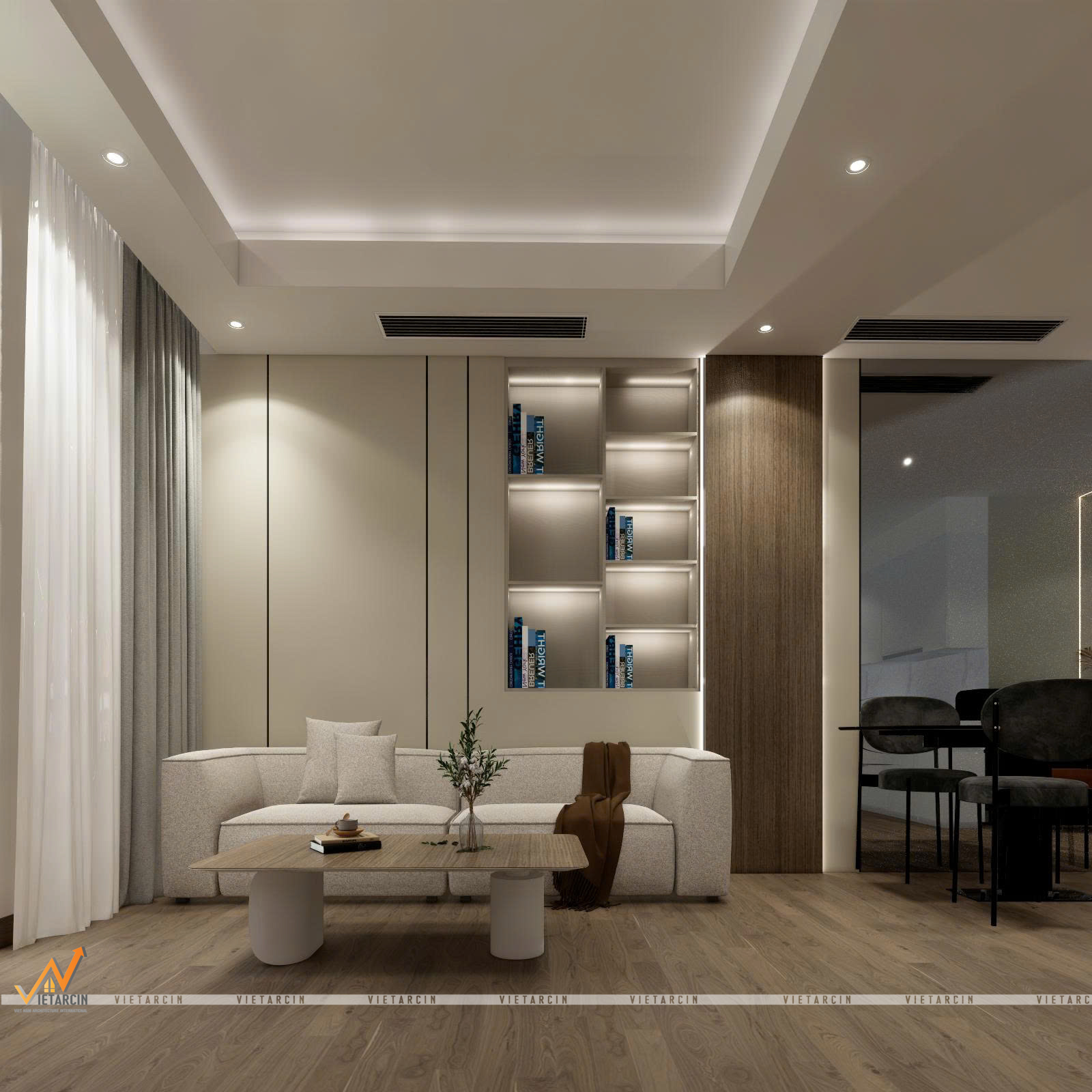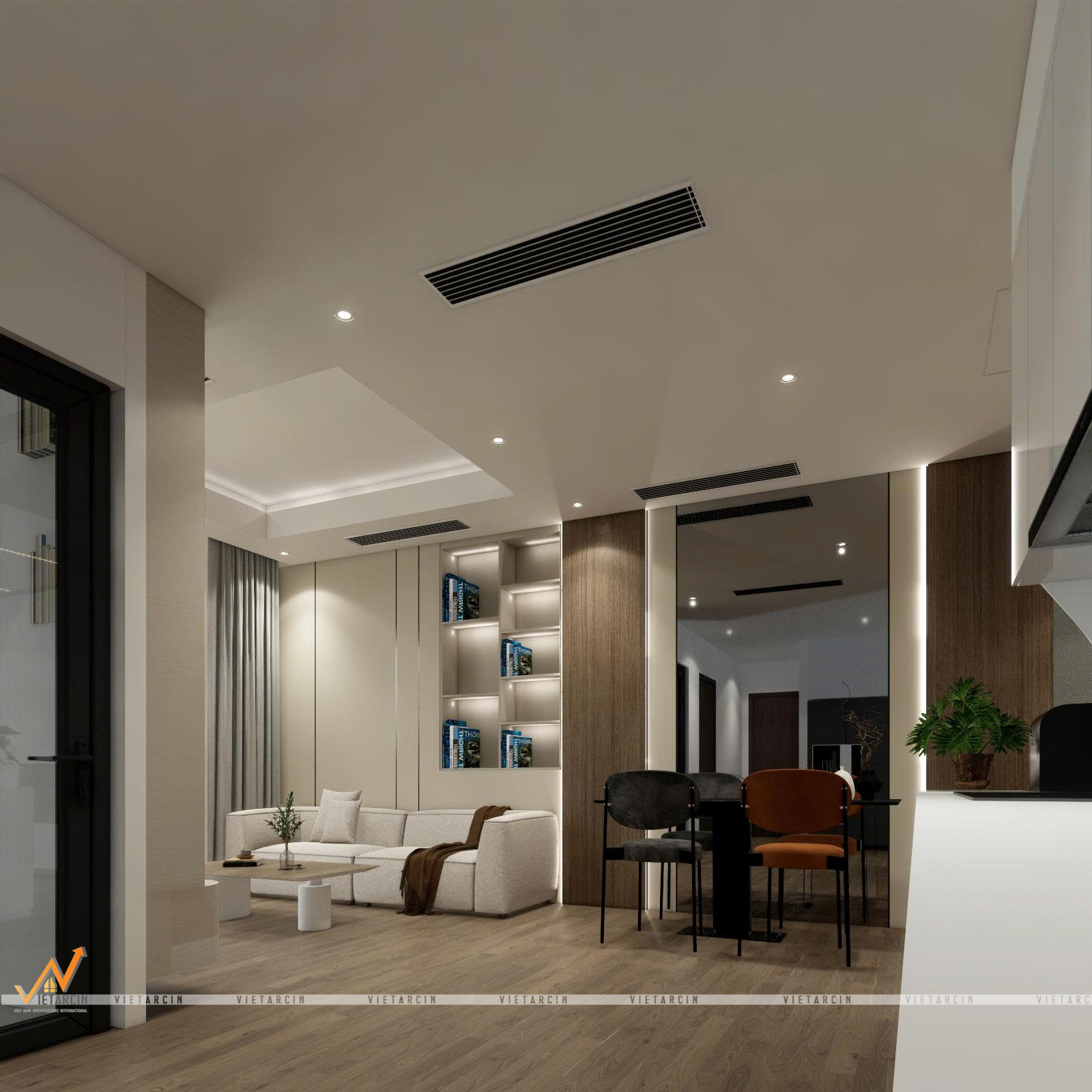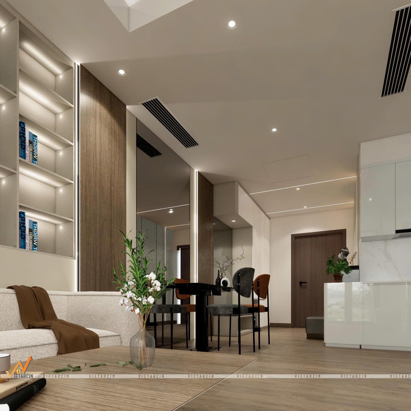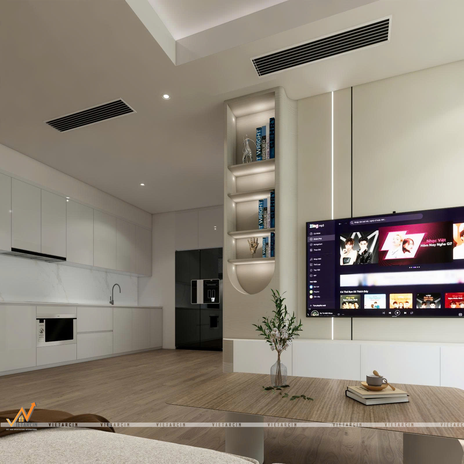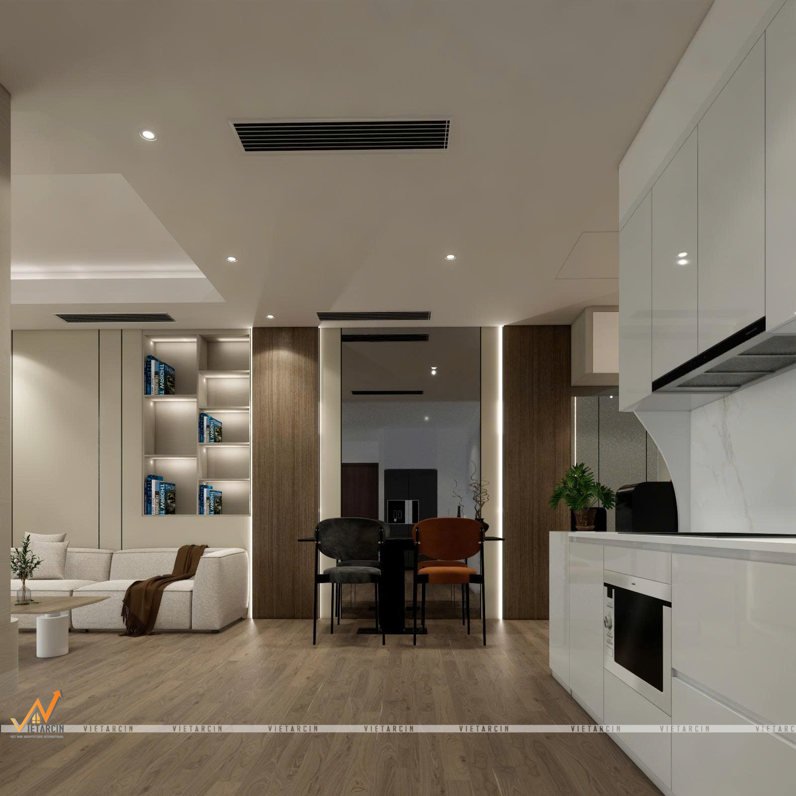 Điểm nhấn là hệ tủ sách cao kịch trần với các đợt gỗ cong mềm mại, tích hợp đèn LED hắt sáng, không chỉ là nơi lưu trữ mà còn là một tác phẩm nghệ thuật trang trí ấn tượng. Bếp chữ I màu trắng, bề mặt bóng, giúp không gian luôn sạch sẽ và rộng rãi hơn. Hệ tủ bếp trên và dưới được thiết kế âm tường, tối ưu công năng, phù hợp với yêu cầu gọn gàng của gia chủ.