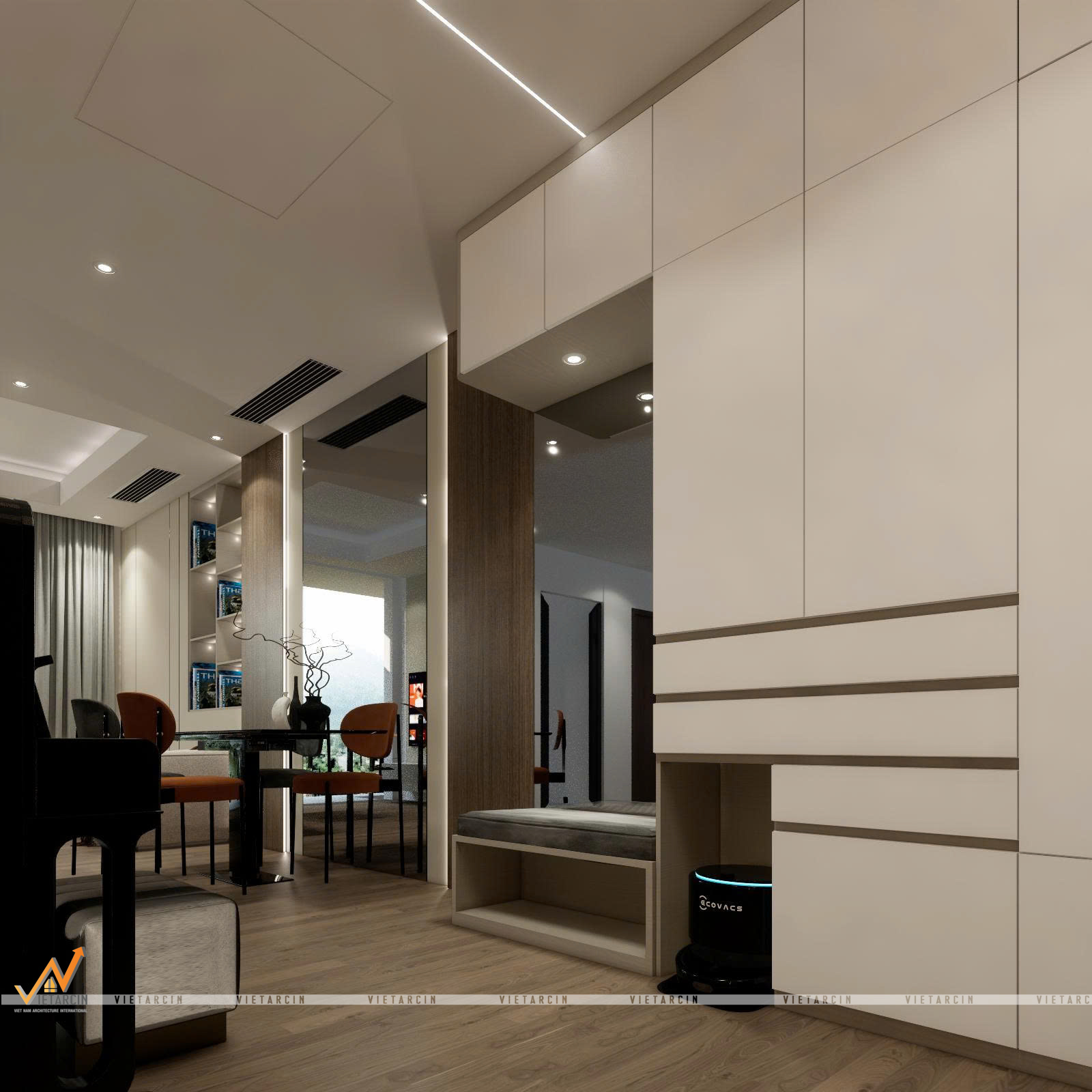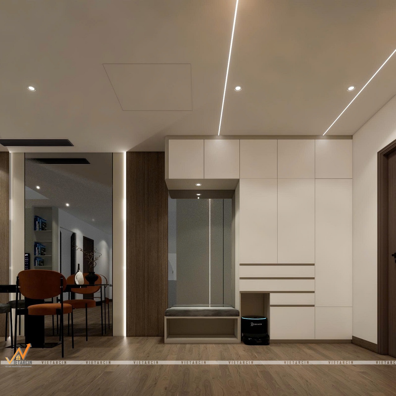 Để giải quyết bài toán lưu trữ và tạo ấn tượng ban đầu, chúng tôi đã thiết kế một hệ tủ giày kết hợp tủ kho lớn ngay tại lối vào. Thiết kế này vừa là nơi cất giữ giày dép gọn gàng, vừa có một khu vực ngồi tiện lợi để mang hoặc cởi giày. Sự kết hợp giữa bề mặt tủ màu trắng và mảng gỗ nâu đậm phía sau, cùng với ánh sáng LED hắt nhẹ, tạo ra một khu vực chào đón tinh tế và hiện đại. Robot hút bụi cũng có một vị trí riêng, gọn gàng và dễ dàng sử dụng.