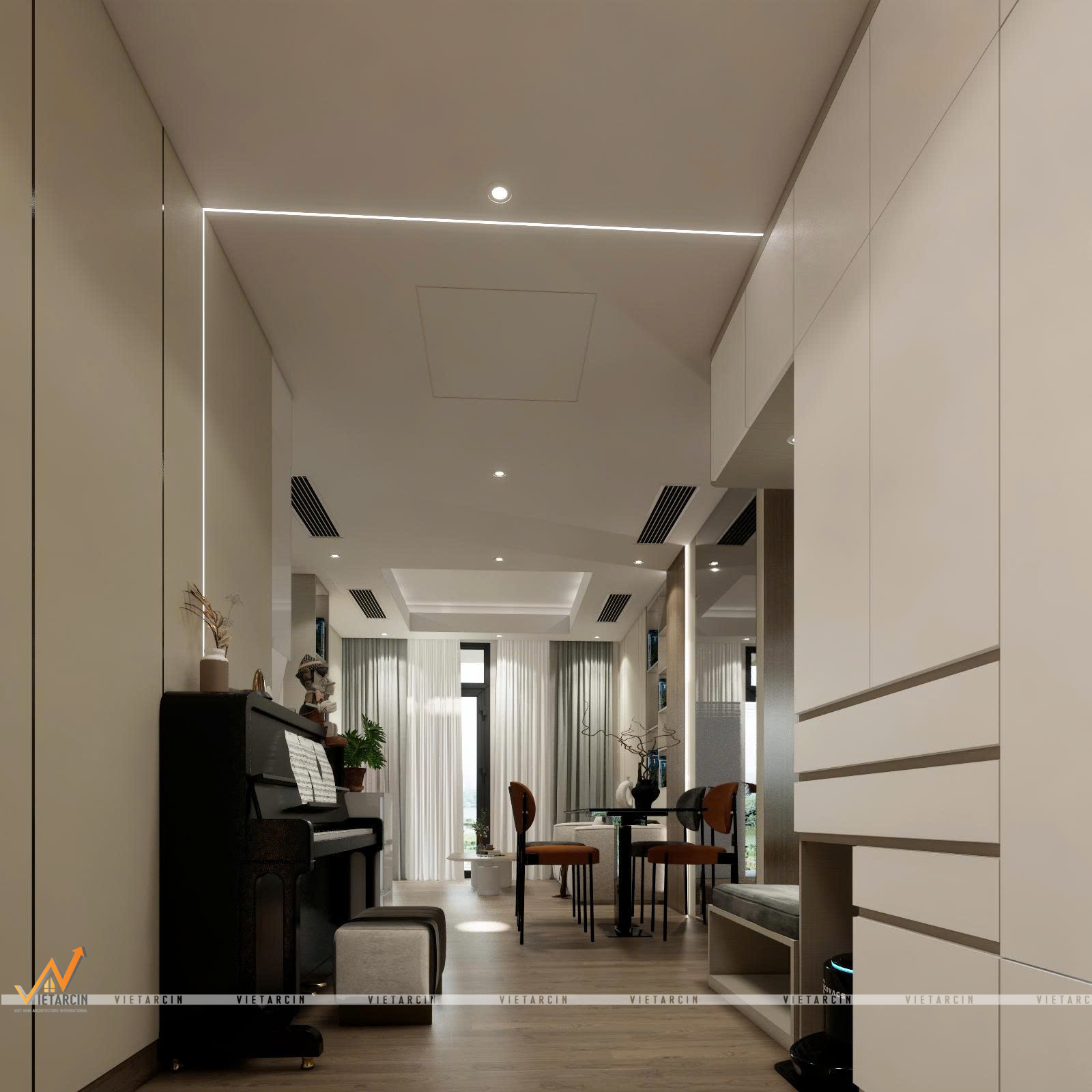 • Tối ưu hóa hệ thống tủ âm tường: Chúng tôi đã thiết kế các hệ tủ đa năng, cao sát trần tại phòng khách và phòng ngủ. Đặc biệt, khu vực lối vào được bố trí một hệ tủ lớn tích hợp nơi cất giày dép, túi xách và một chiếc ghế nhỏ tiện lợi. Giải pháp này giúp giấu đi mọi sự bừa bộn, mang lại không gian luôn gọn gàng.
