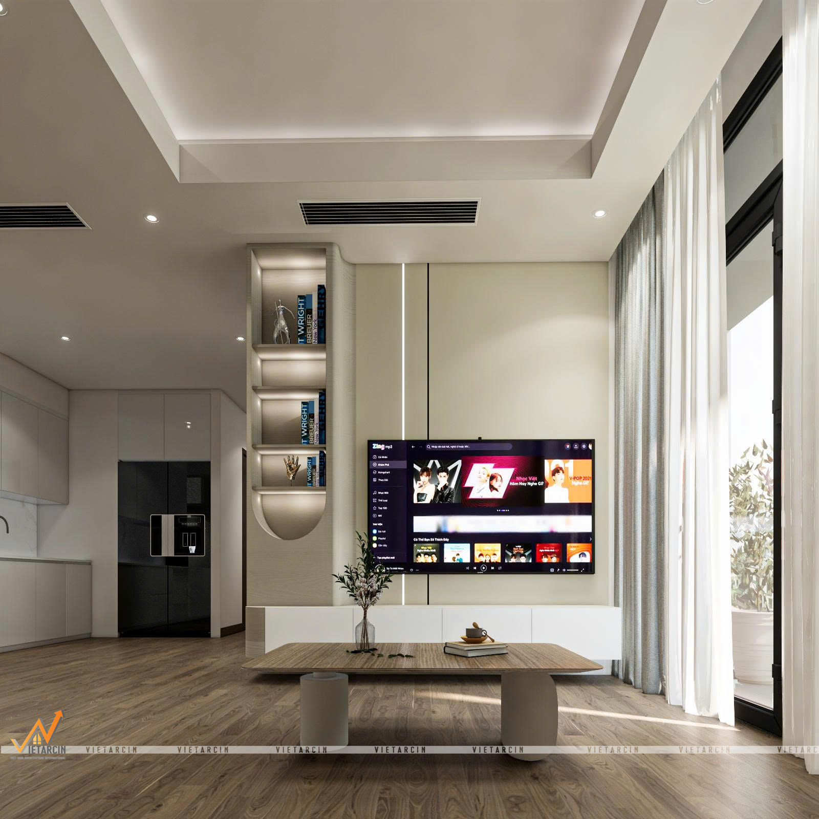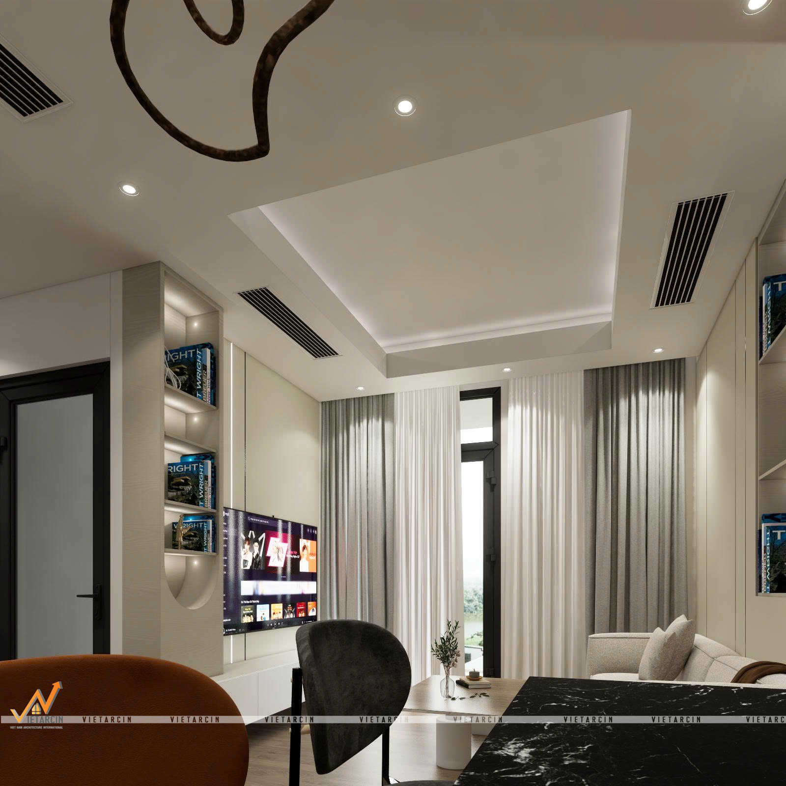 Chúng tôi đã biến khu vực sinh hoạt chung thành một không gian mở, gắn kết. Bằng cách loại bỏ các vách ngăn không cần thiết, chúng tôi tạo ra sự liền mạch giữa phòng khách, khu vực bàn ăn và bếp. Tủ TV được thiết kế gọn gàng, treo tường, giúp giải phóng không gian sàn.