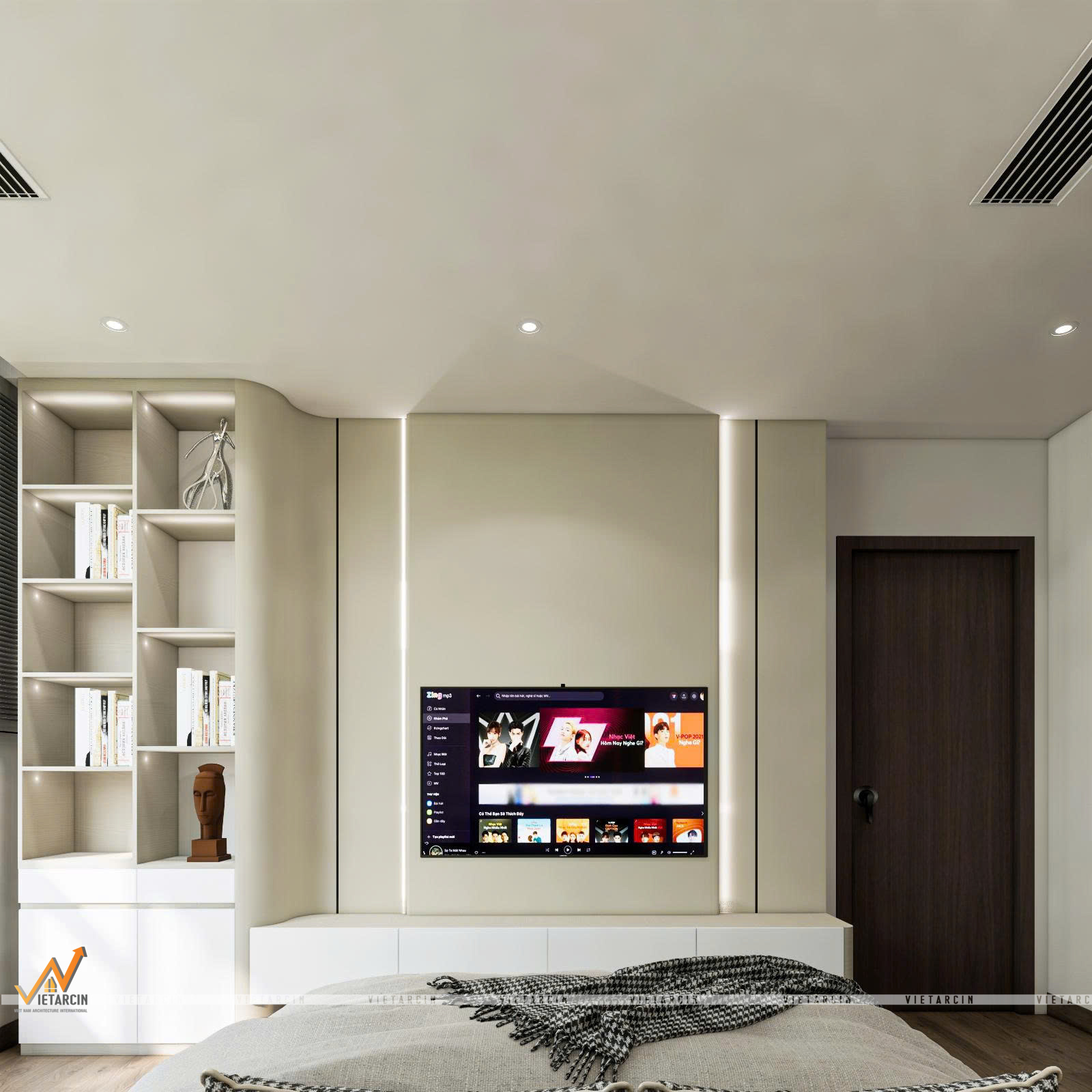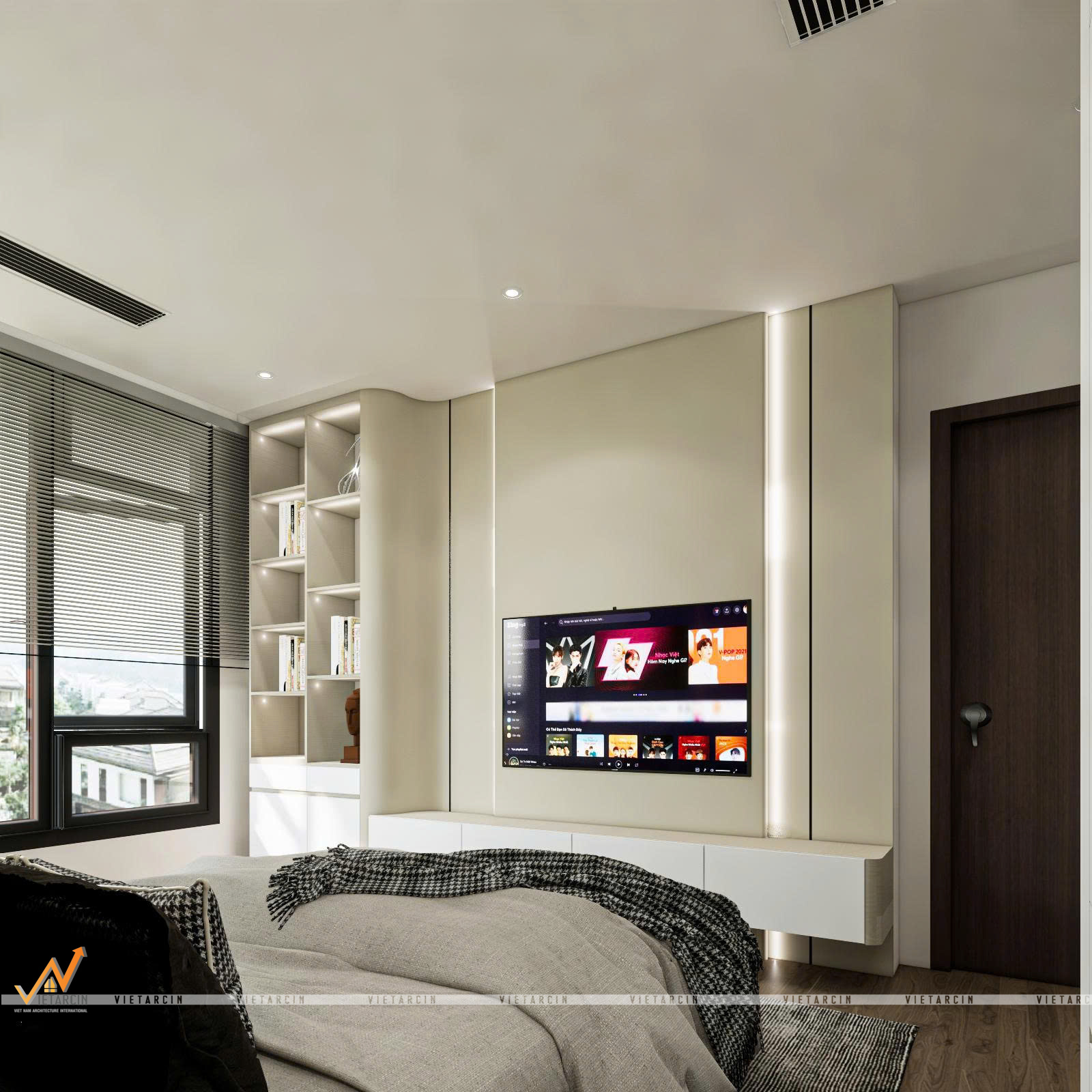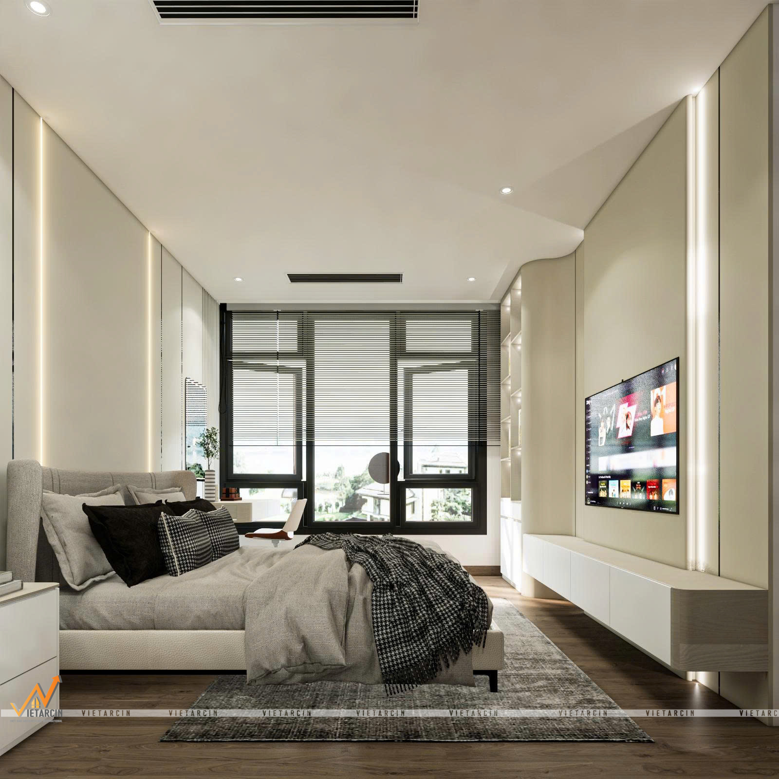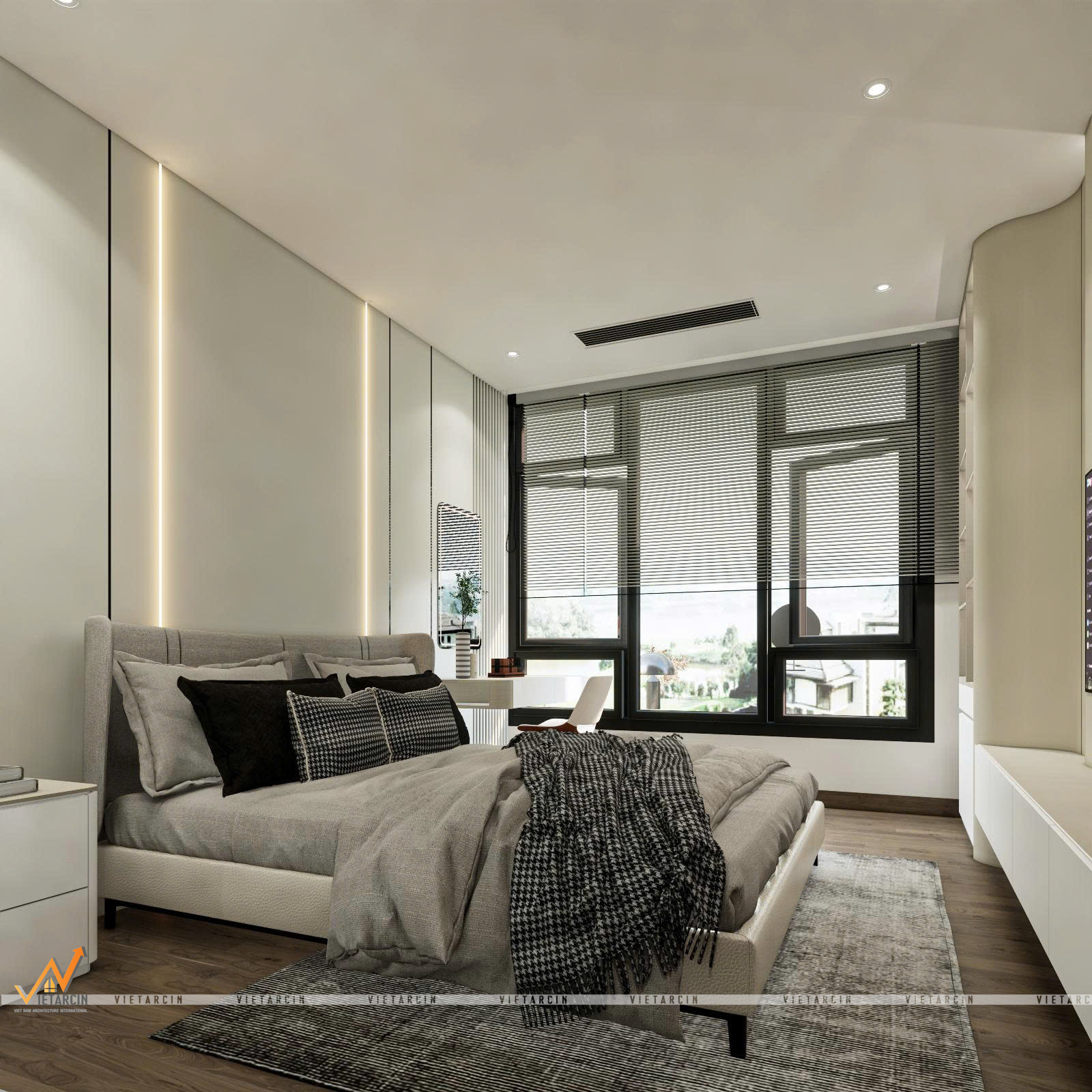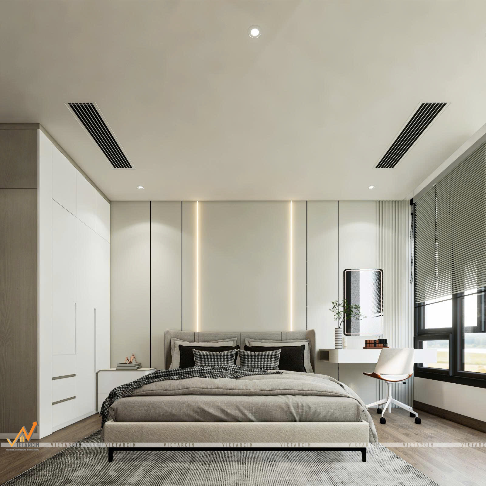 Phòng ngủ được thiết kế dựa trên sự tối giản và tiện nghi. Giường ngủ với tông màu xám nhẹ, kết hợp với chăn ga gối màu trung tính, tạo cảm giác thư thái, dễ chịu. Điểm nhấn là hai dải đèn LED dọc được bố trí trên vách đầu giường, vừa tạo hiệu ứng thị giác, vừa cung cấp ánh sáng dịu nhẹ cho không gian. Hệ tủ quần áo cao kịch trần màu trắng, phẳng mịn, giúp tối đa hóa không gian lưu trữ mà không gây cảm giác cồng kềnh.
