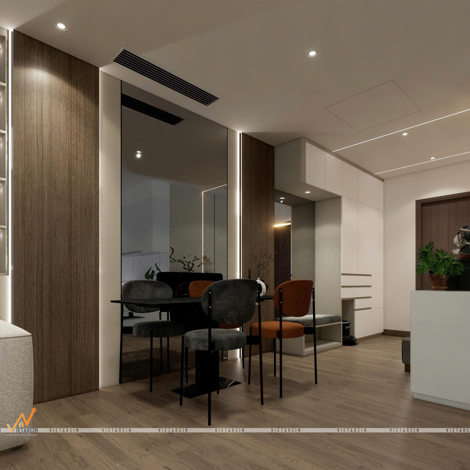 • Thiết kế không gian mở: Toàn bộ khu vực phòng khách, bàn ăn và bếp được thiết kế liên thông, xóa bỏ cảm giác ngăn cách. Điều này không chỉ giúp căn hộ trông rộng rãi hơn mà còn tạo sự thuận tiện cho sinh hoạt gia đình. Khu vực bàn ăn được bố trí tinh tế với hai chiếc ghế đơn màu tương phản, tạo điểm nhấn nghệ thuật.