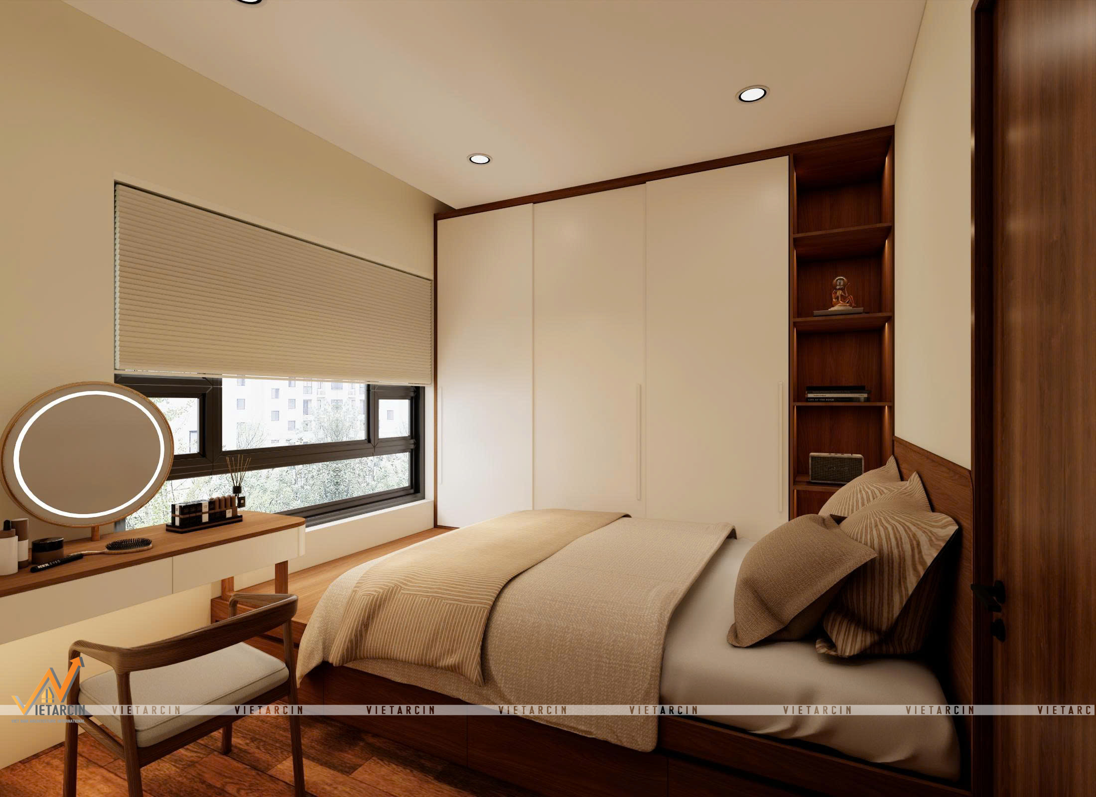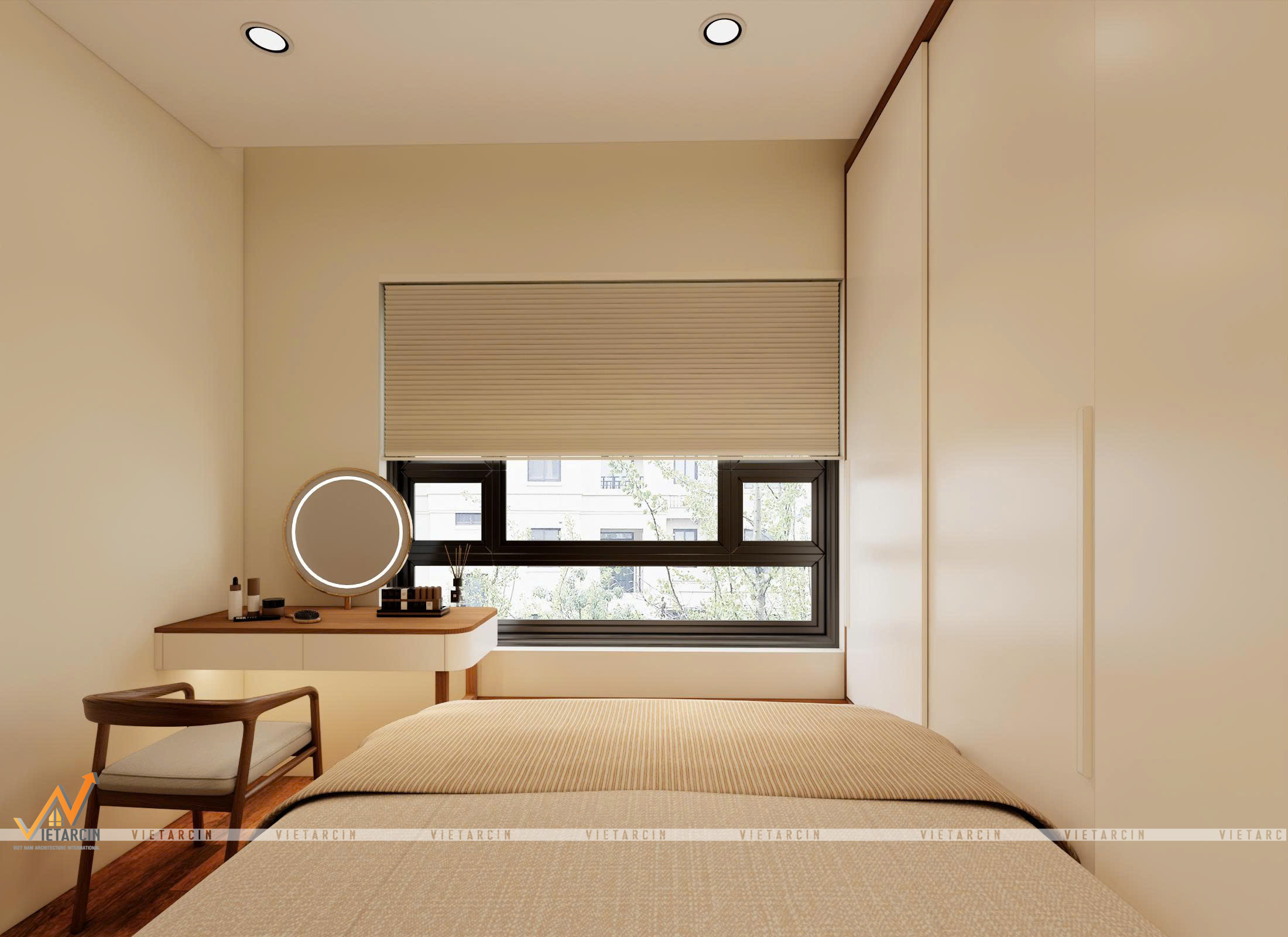 Bố cục nội thất hài hòa: Giường ngủ được đặt ở vị trí trung tâm, với đầu giường bằng gỗ tạo cảm giác vững chãi và ấm áp. Bàn trang điểm được thiết kế nhỏ gọn, đặt ngay cạnh cửa sổ để tận dụng tối đa ánh sáng tự nhiên. Mọi thứ được sắp xếp vừa đủ, không có chi tiết thừa, mang lại sự thanh thoát và tĩnh lặng cần thiết cho một không gian nghỉ ngơi.