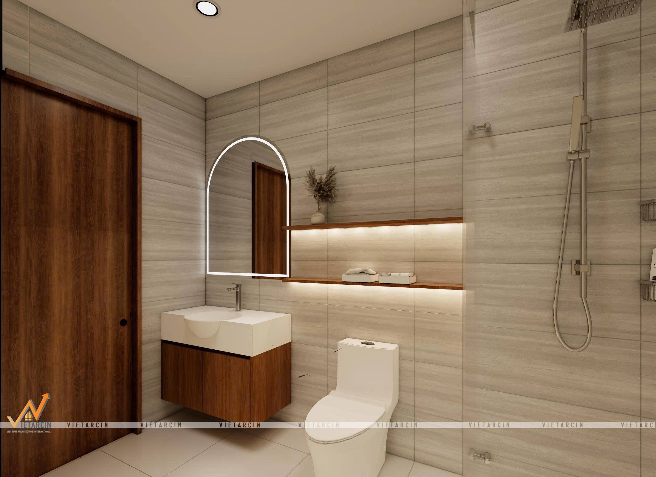 Nhà vệ sinh chuẩn “resort tại gia”: Nhà vệ sinh cũng được lột xác hoàn toàn với gạch ốp tường giả vân đá màu xám nhạt, mang lại cảm giác sạch sẽ, sang trọng. Lavabo treo tường và kệ hở giúp không gian bên dưới thông thoáng, dễ dàng vệ sinh. Điểm nhấn đặc biệt là chiếc gương soi hình vòm có đèn LED hắt sáng, vừa cung cấp ánh sáng dịu nhẹ, vừa là một chi tiết trang trí thời thượng, biến nhà vệ sinh thành một không gian thư giãn đúng nghĩa.