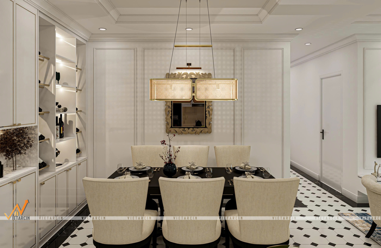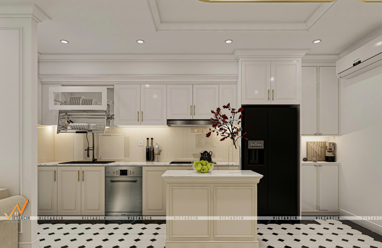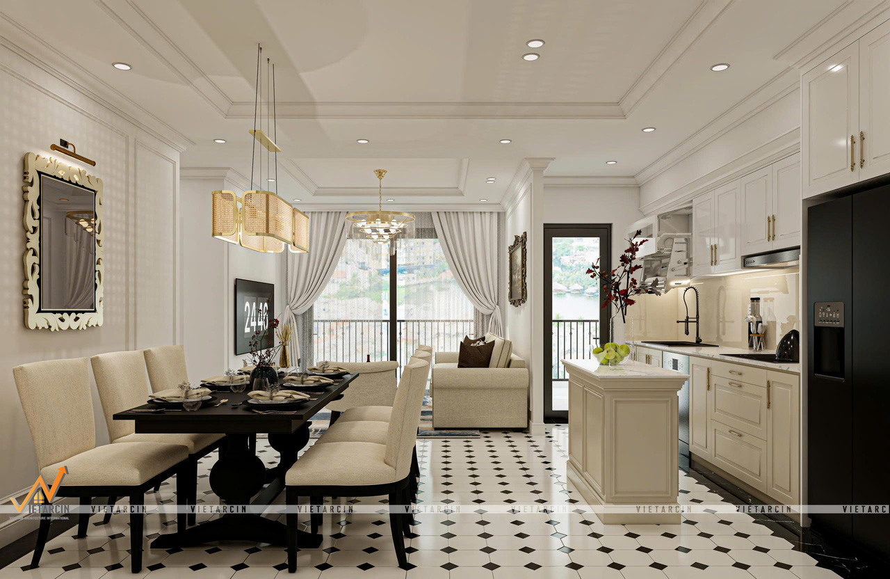 Đề bài từ khách hàng: Hãy tạo ra một không gian Tân Cổ Điển nhẹ nhàng, nơi màu trắng và be hòa quyện, công năng được tối ưu hóa từng centimet, đặc biệt là khu vực bếp nấu và phòng khách phải thật sự liên kết và tiện nghi.