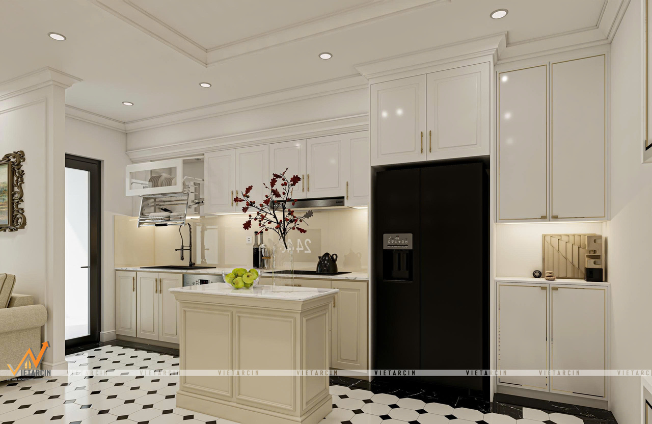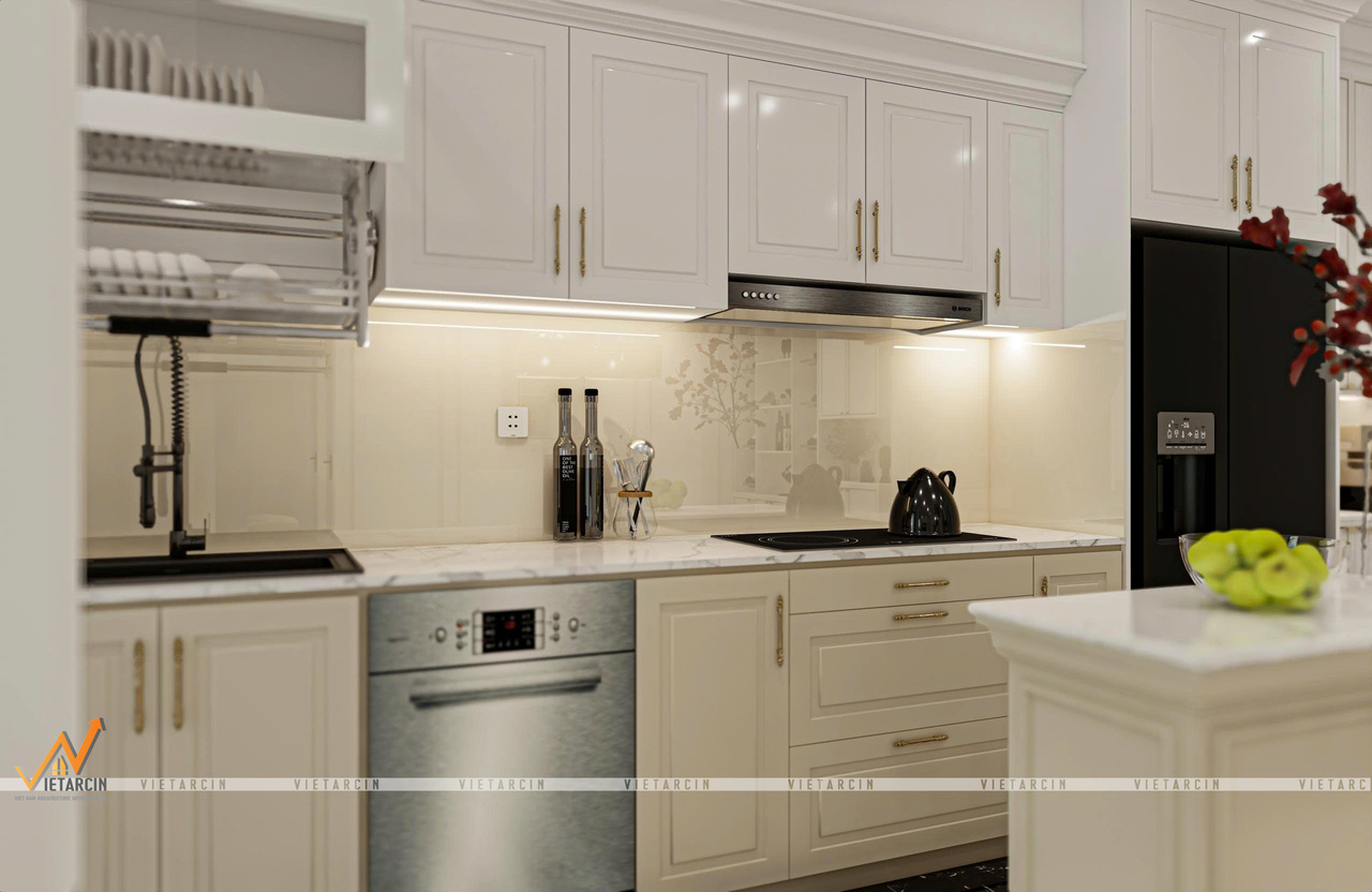 • Hệ tủ bếp: Sử dụng cánh tủ soi pano đặc trưng của Tân Cổ Điển nhưng tay nắm được mạ vàng thanh mảnh.