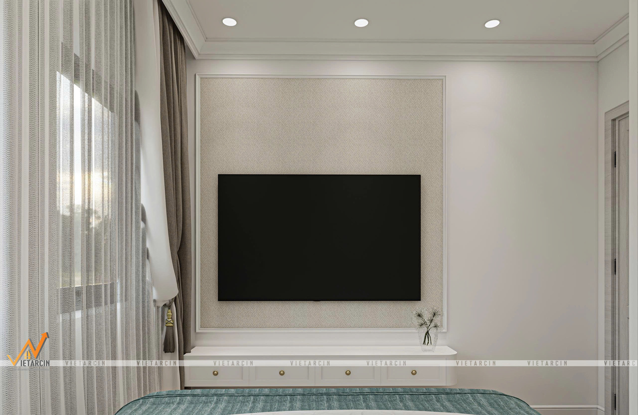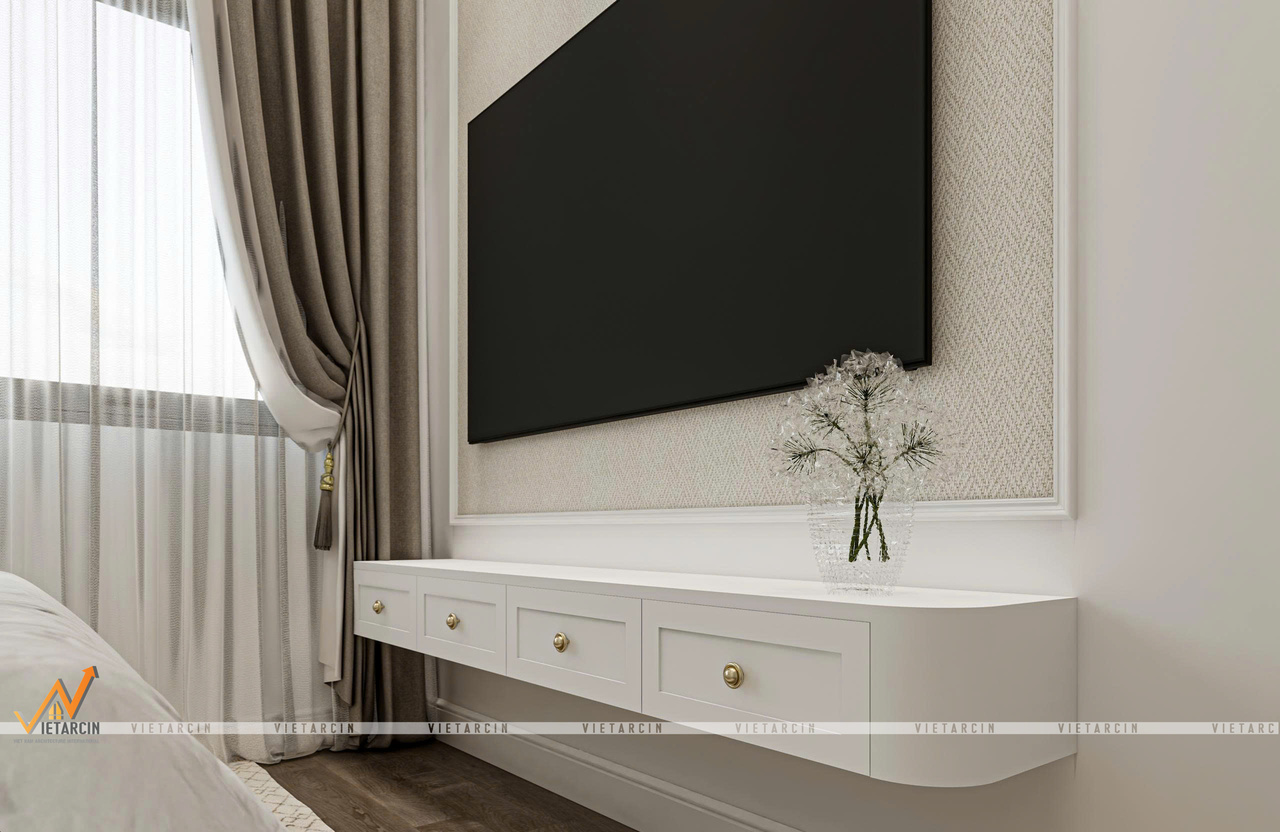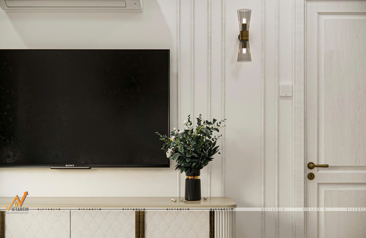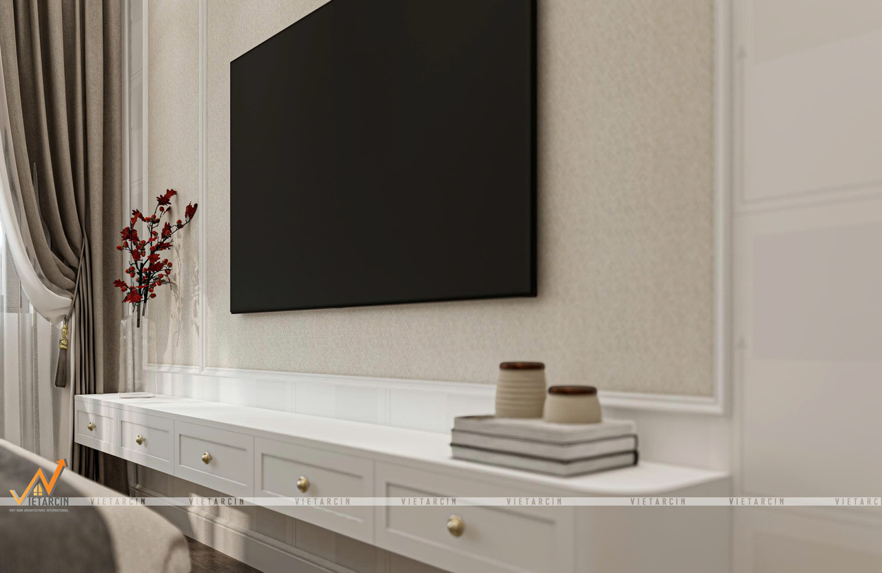 Tối ưu vách tivi: Để tiết kiệm diện tích lối đi, hệ kệ Tivi được thiết kế treo tường tối giản, chạy dài theo mảng tường. Mảng tường sau Tivi cũng được ốp giấy dán tường cùng tone với đầu giường, tạo sự liên kết chặt chẽ về mặt thẩm mỹ.