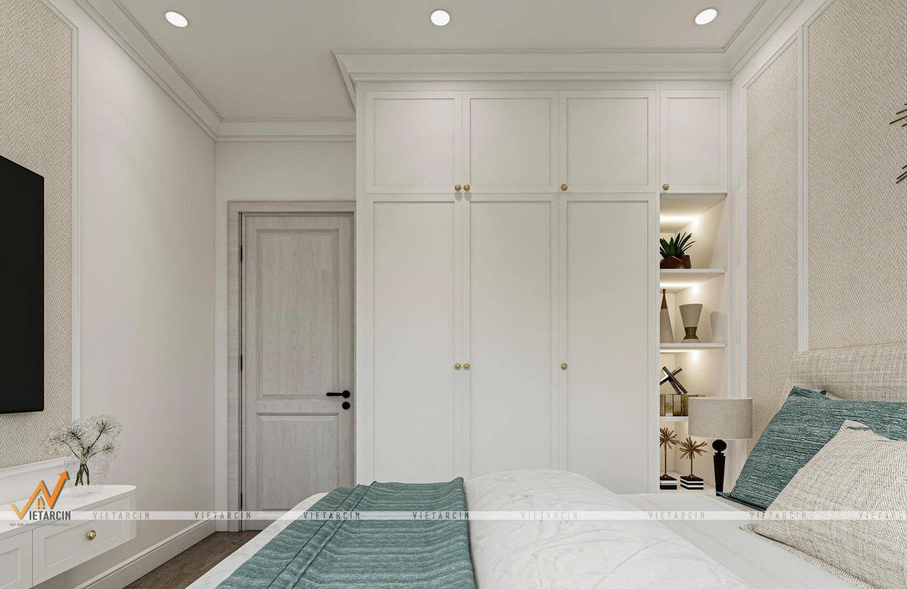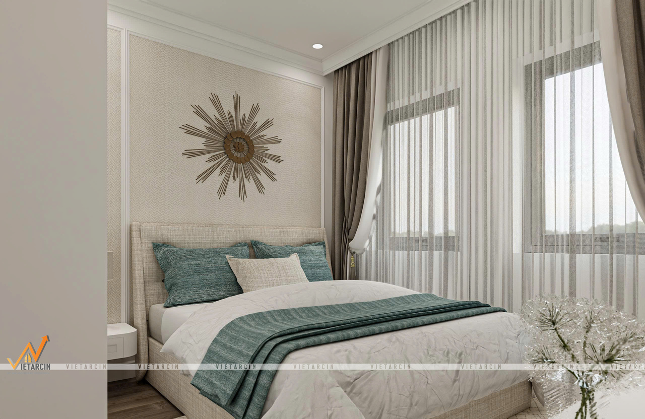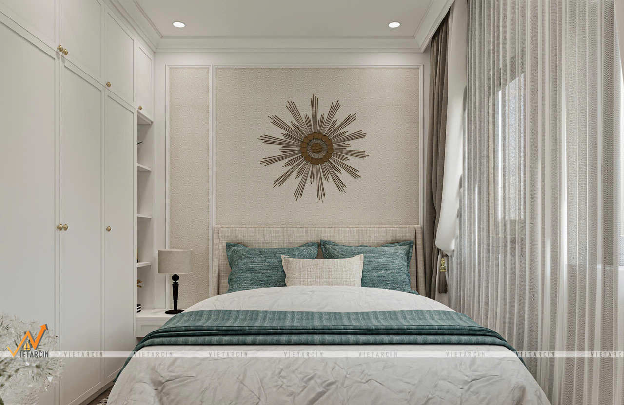Với diện tích 13m2, thoải mái hơn một chút so với phòng ngủ 1, tôi cho phép mình “chơi” thêm một chút về màu sắc để tạo sự tươi mới. Vẫn giữ nền tảng Tân Cổ Điển với tường trắng và phào chỉ nhẹ nhàng, nhưng tôi đã thêm vào bộ chăn ga gối màu Xanh Ngọc. Sự xuất hiện của gam màu lạnh này trên nền trắng tạo nên vẻ đẹp thanh lịch, hiện đại và rất dịu mắt – cực kỳ phù hợp cho việc thư giãn.