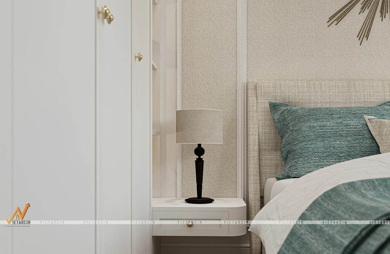 • Trung thành với nguyên tắc “tỷ lệ vàng”, khu vực đầu giường được bố trí hoàn toàn đối xứng.