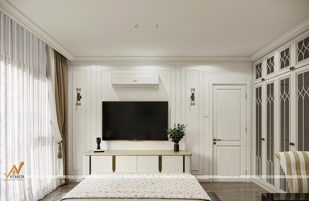 • Tỷ lệ vàng trong Tân cổ điển: Tôi áp dụng triệt để nguyên tắc chia mảng tường theo 3 phần (chân – thân – đầu) để đảm bảo “chất” cổ điển. Tuy nhiên, các đường phào chỉ được tiết chế độ dày tối đa, tránh làm không gian bị nặng nề, cục mịch.