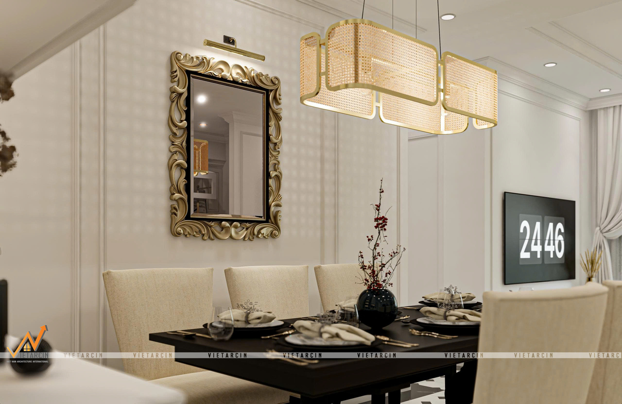 Hãy chú ý đến chiếc đèn chùm mạ vàng ở trung tâm. Trong phong cách Tân Cổ Điển, đây không chỉ là thiết bị chiếu sáng, nó là “trang sức” của trần nhà, giúp cân bằng lại sự đơn giản của các mảng tường.