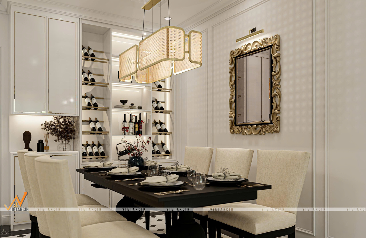 • Đáp ứng sở thích sưu tầm rượu của gia chủ, tôi thiết kế hệ tủ rượu kịch trần kết hợp đèn LED hắt sáng. Cánh tủ kính cường lực giúp trưng bày những chai rượu quý, biến nó thành một “bức tranh” sống động cho khu vực ăn uống.