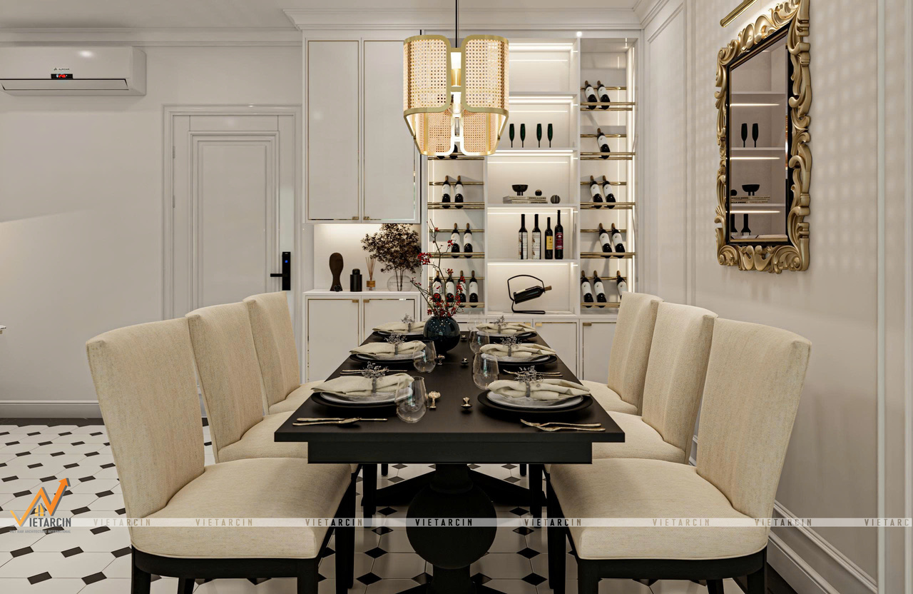 • Khu vực bếp – khách: Phải xử lý khéo léo hệ tủ giày và tủ bếp kết hợp thành một hệ liền mạch (giải pháp cho không gian hẹp). Bắt buộc phải có đảo bếp và tủ rượu tại khu vực bàn ăn để phục vụ sở thích sưu tầm của gia chủ.
