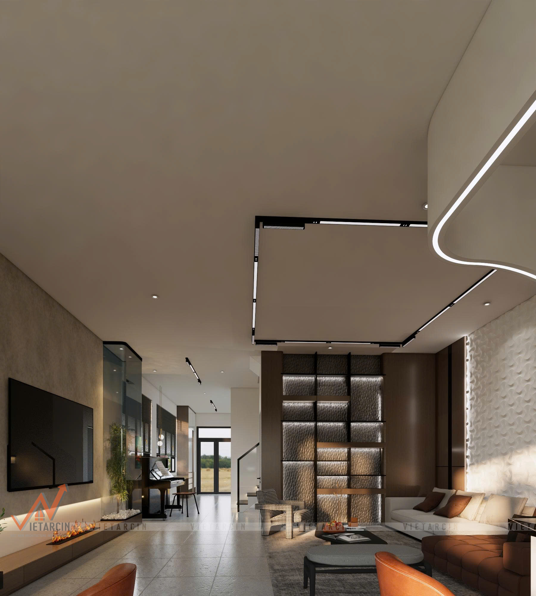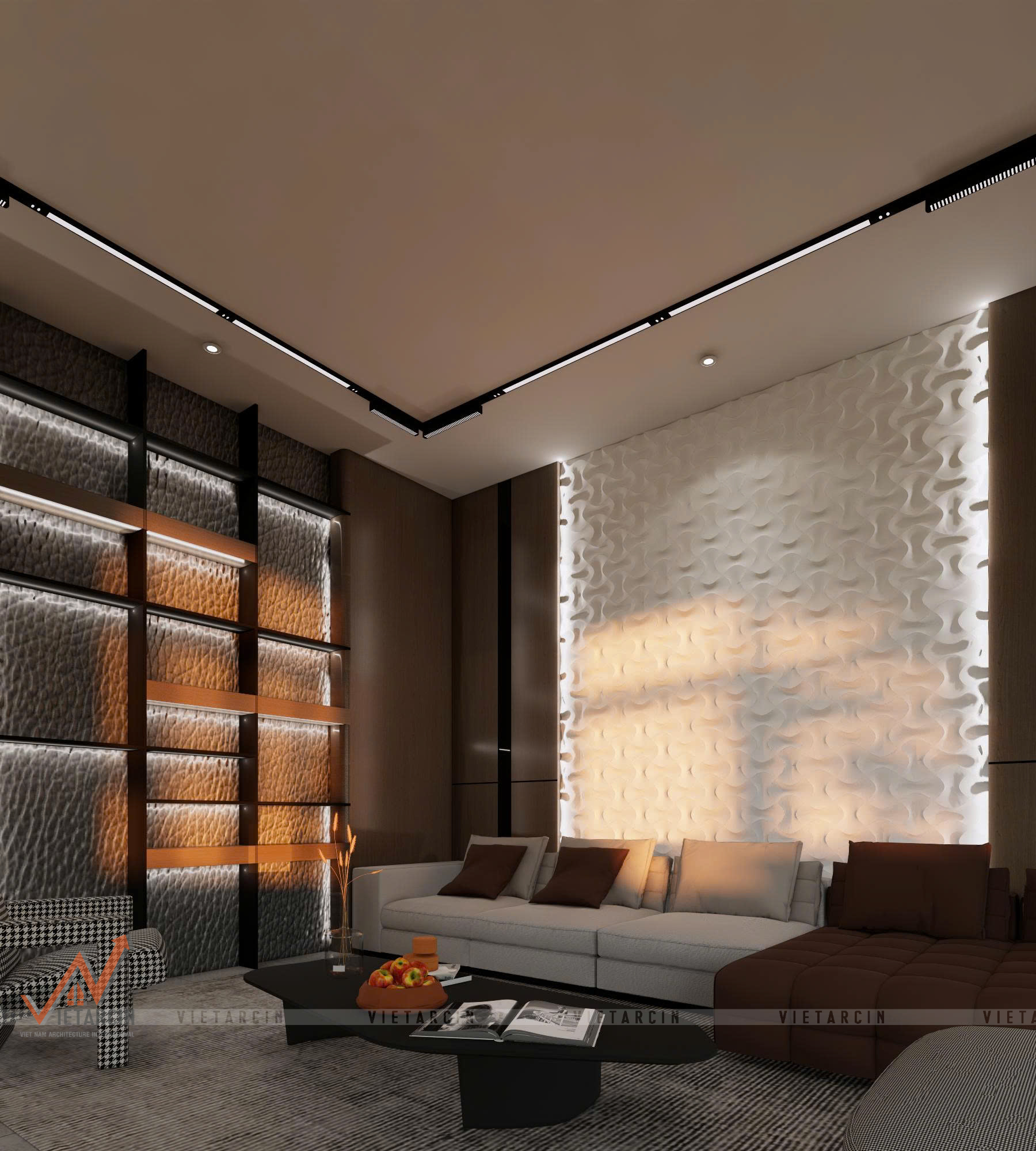 Khu vực này đóng vai trò kép: là nơi sinh hoạt chung của gia đình và là khu vực tiếp khách, đối tác kinh doanh. Vaidecor đã sử dụng một mảng tường ốp 3D màu trắng nổi bật, đặt giữa hai mảng gỗ ốp tối màu. Giải pháp này tạo ra một “điểm nhấn thị giác” mạnh mẽ, định vị rõ ràng khu vực ngồi đàm thoại/sinh hoạt, đồng thời dùng vật liệu ốp gỗ để tăng tính trang trọng, chuyên nghiệp, như một khu vực tiếp khách cao cấp.