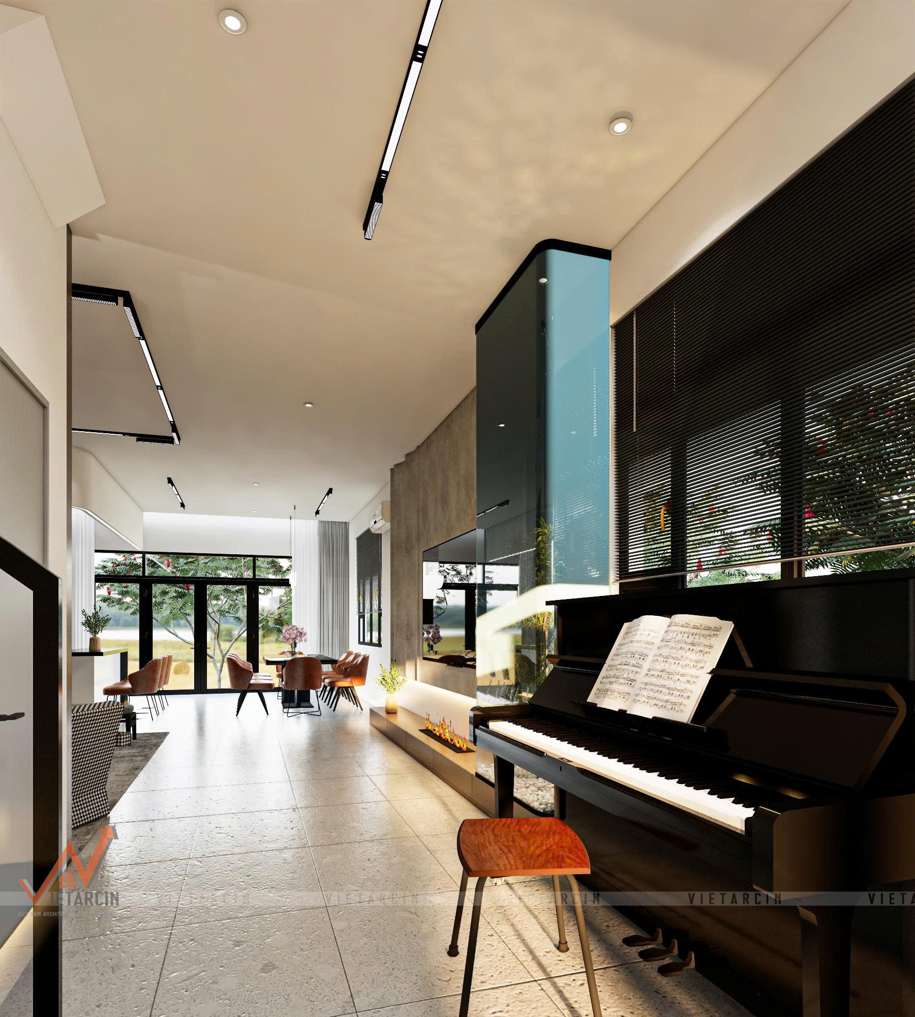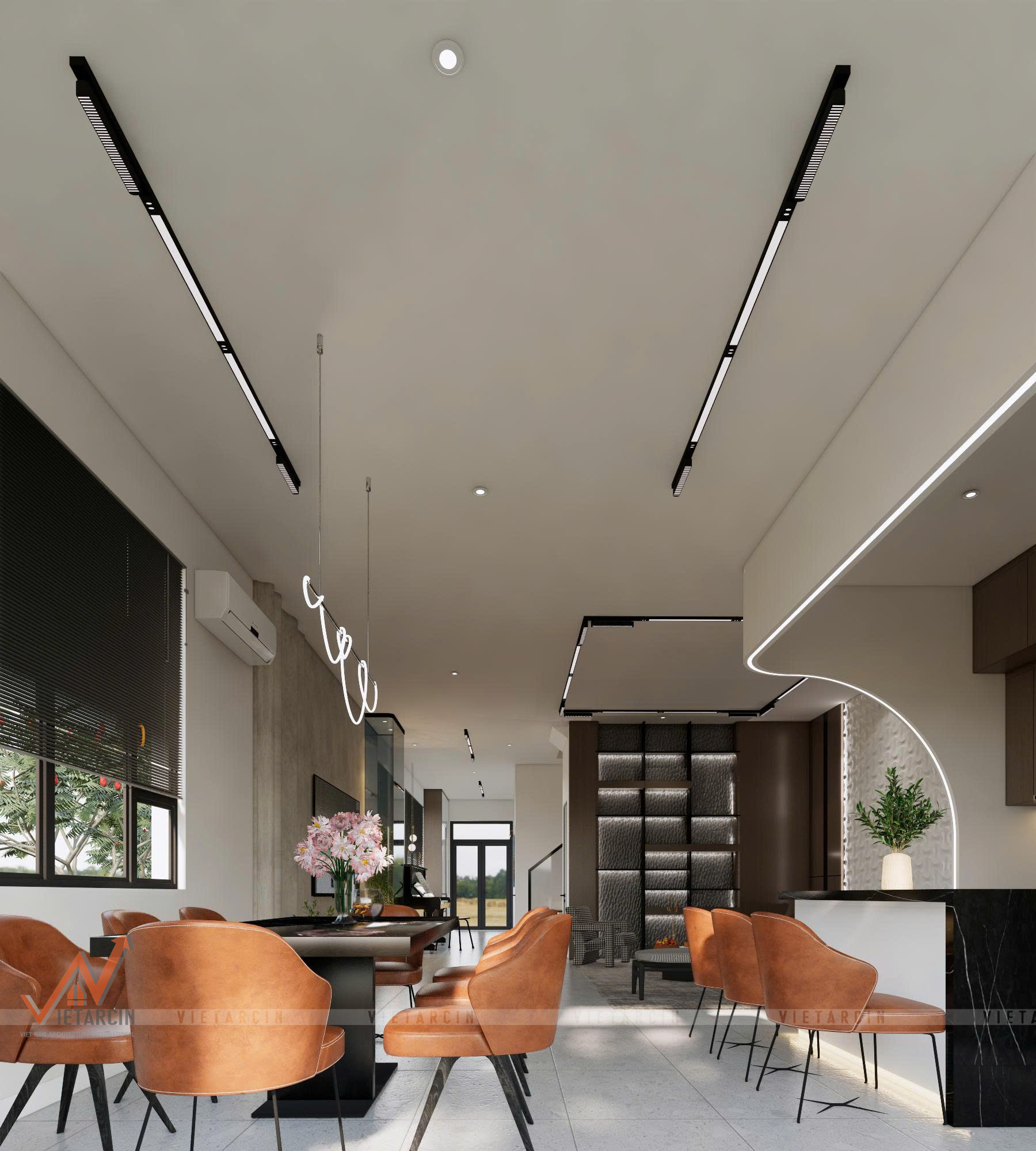 - Giải pháp ánh sáng và thẩm mỹ cho không gian mở: Khu vực sinh hoạt chung có trần cao và chiều dài lớn, đòi hỏi một hệ thống chiếu sáng không chỉ đủ công suất mà còn phải có tính thẩm mỹ cao. Việc sử dụng các thanh đèn ray và đèn thả trang trí cần được tính toán kỹ lưỡng để tạo điểm nhấn mà không gây chói, đồng thời tôn lên vật liệu và kết cấu hiện đại.