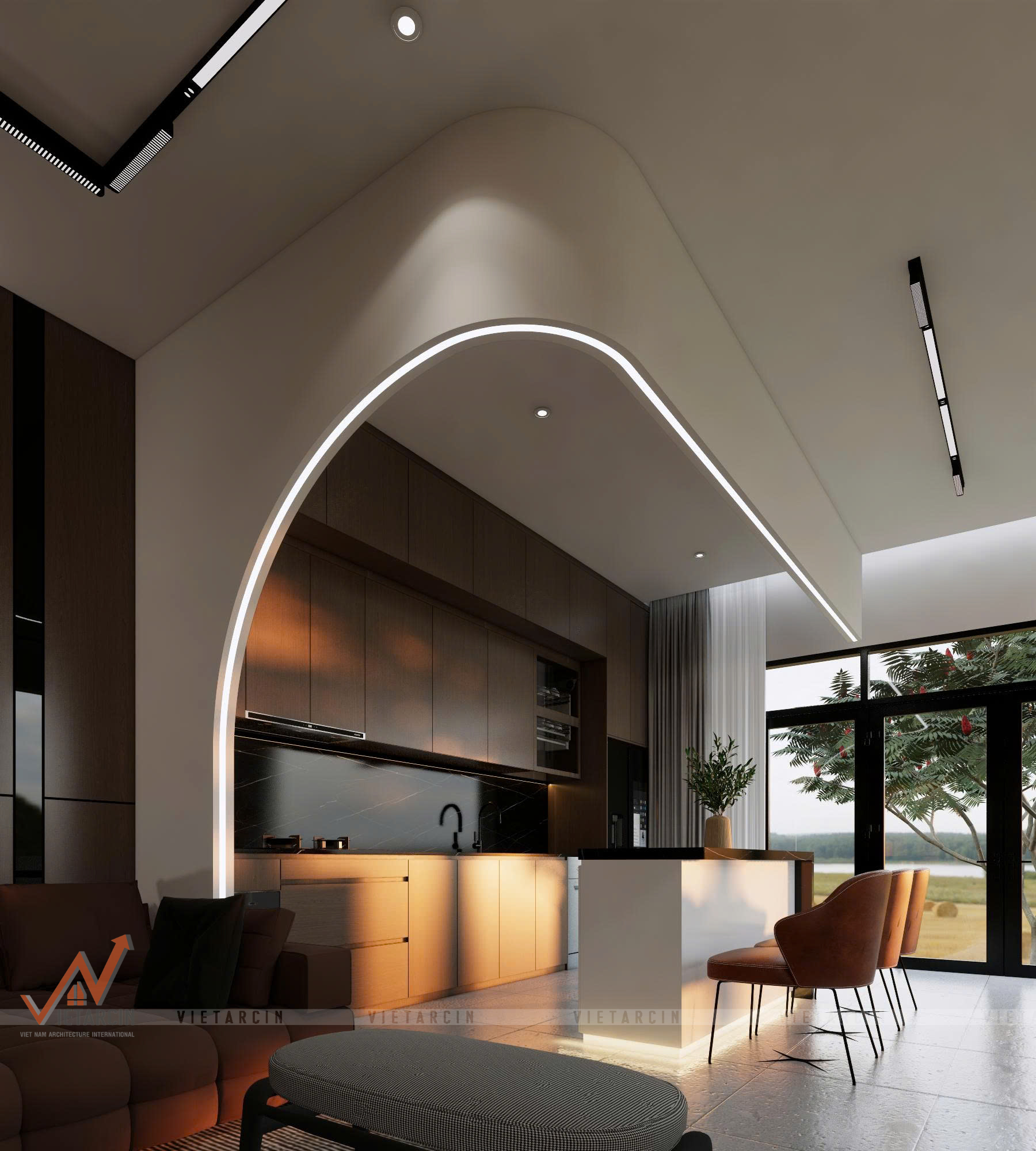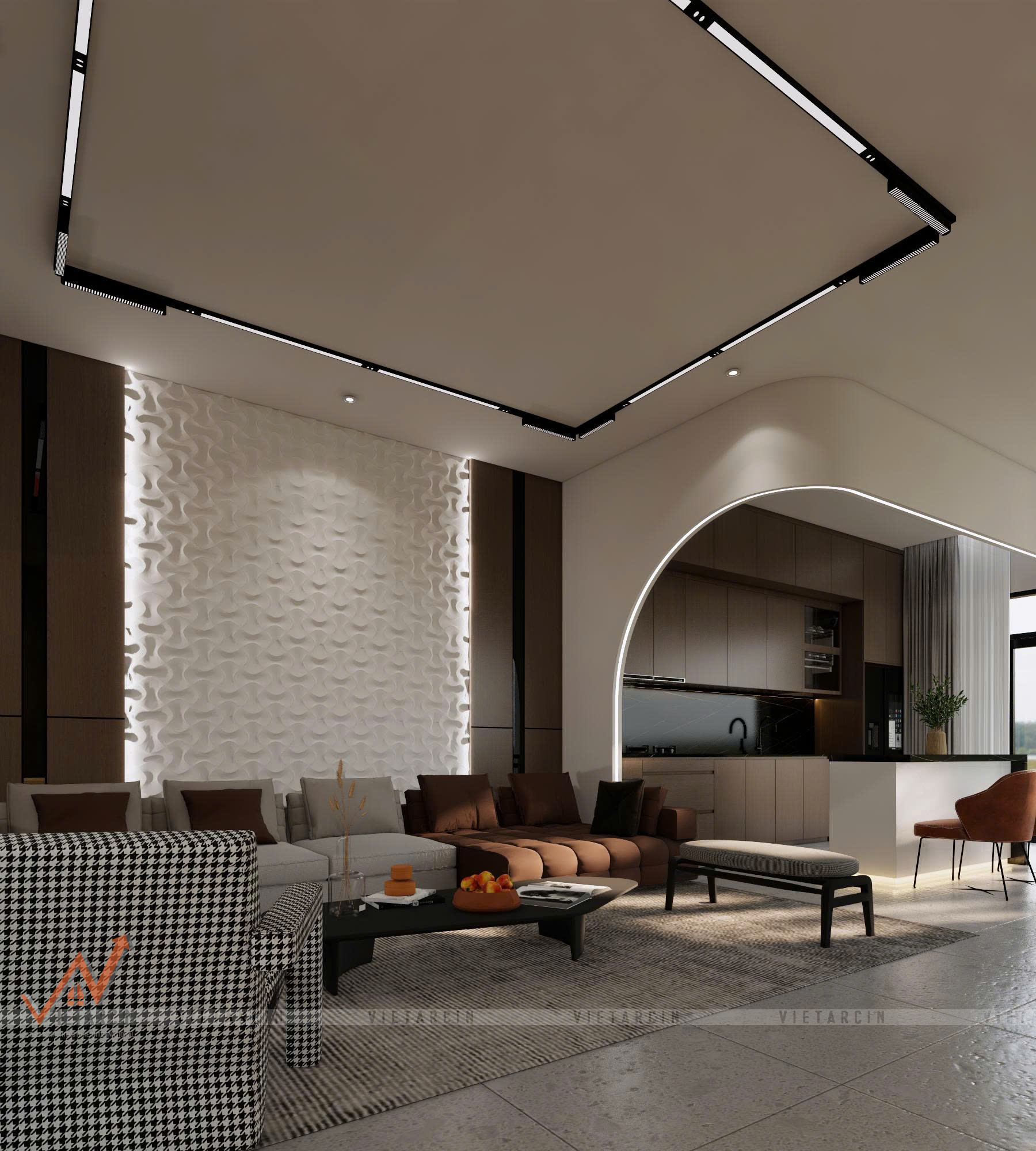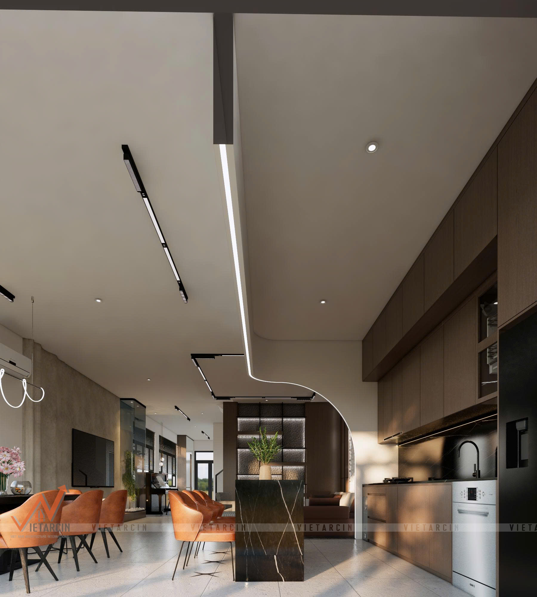 - Ánh sáng Tuyến tính: Hệ thống đèn ray và đèn LED tuyến tính không chỉ cung cấp ánh sáng chính mà còn đóng vai trò là “đường dẫn” thị giác, phân chia rõ ràng khu vực phòng khách/ăn với khu vực bếp/chức năng phụ, đồng thời nhấn mạnh tính hiện đại của trần nhà.